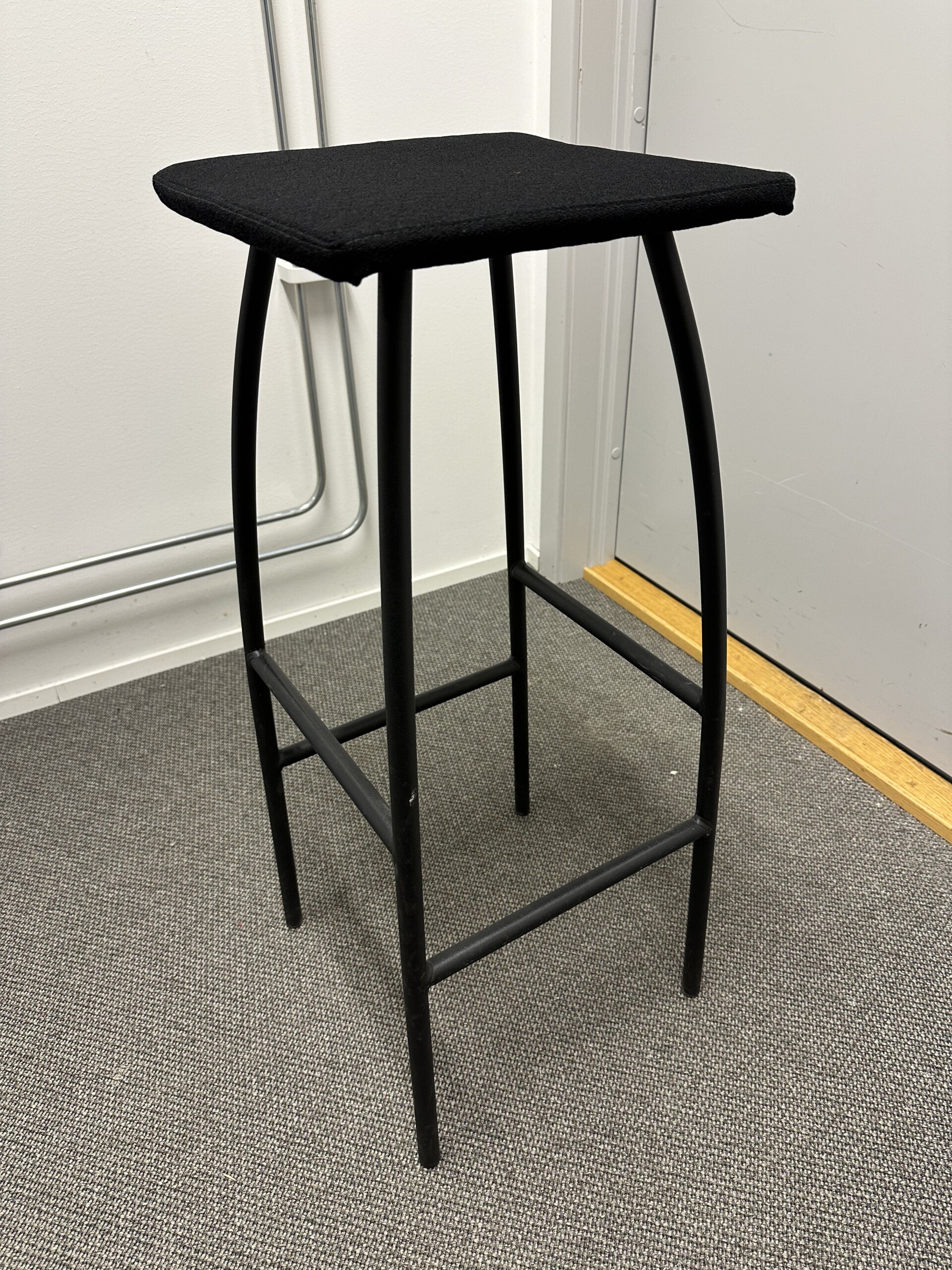 Sæde i stof (sort). 4-bensstel i metal (sort).