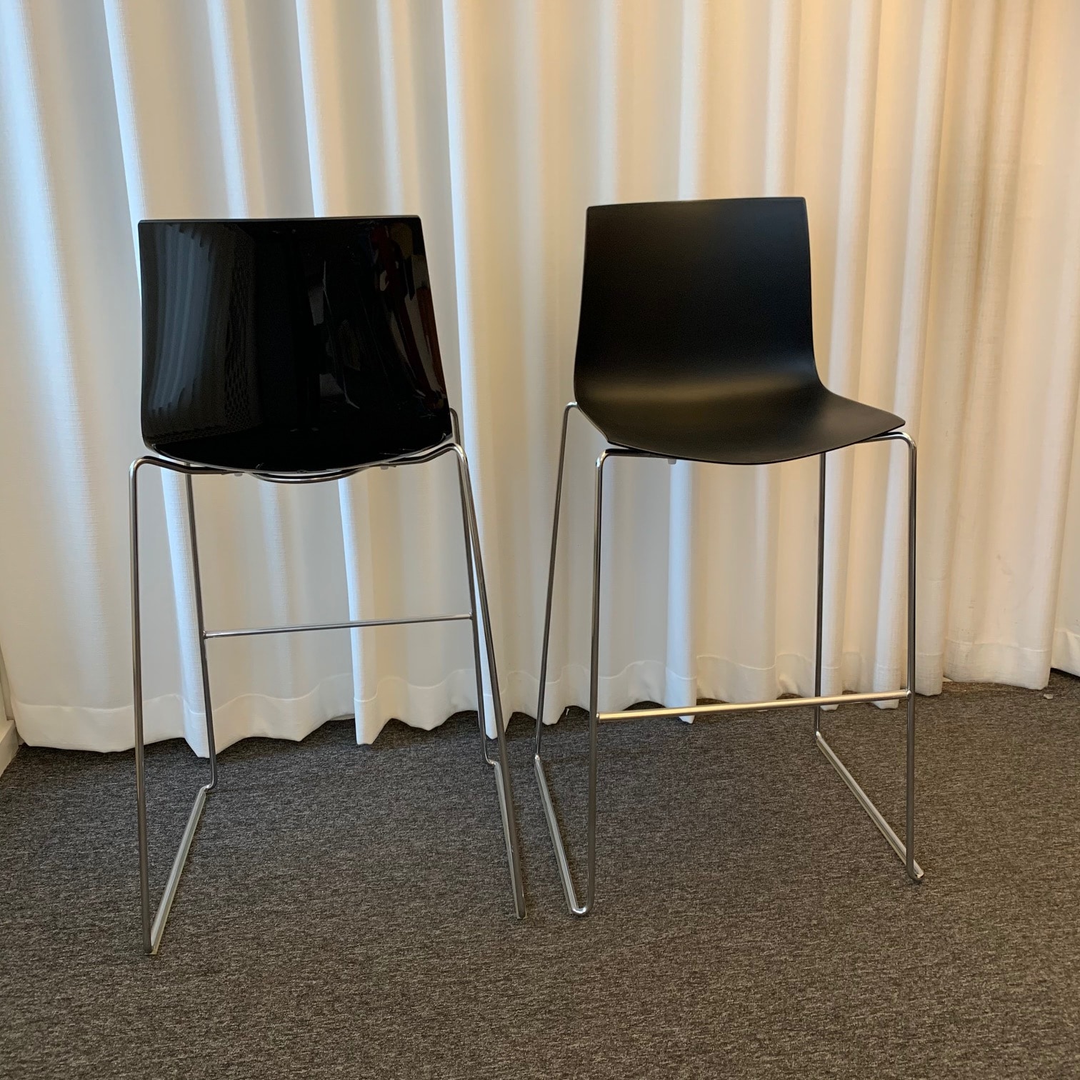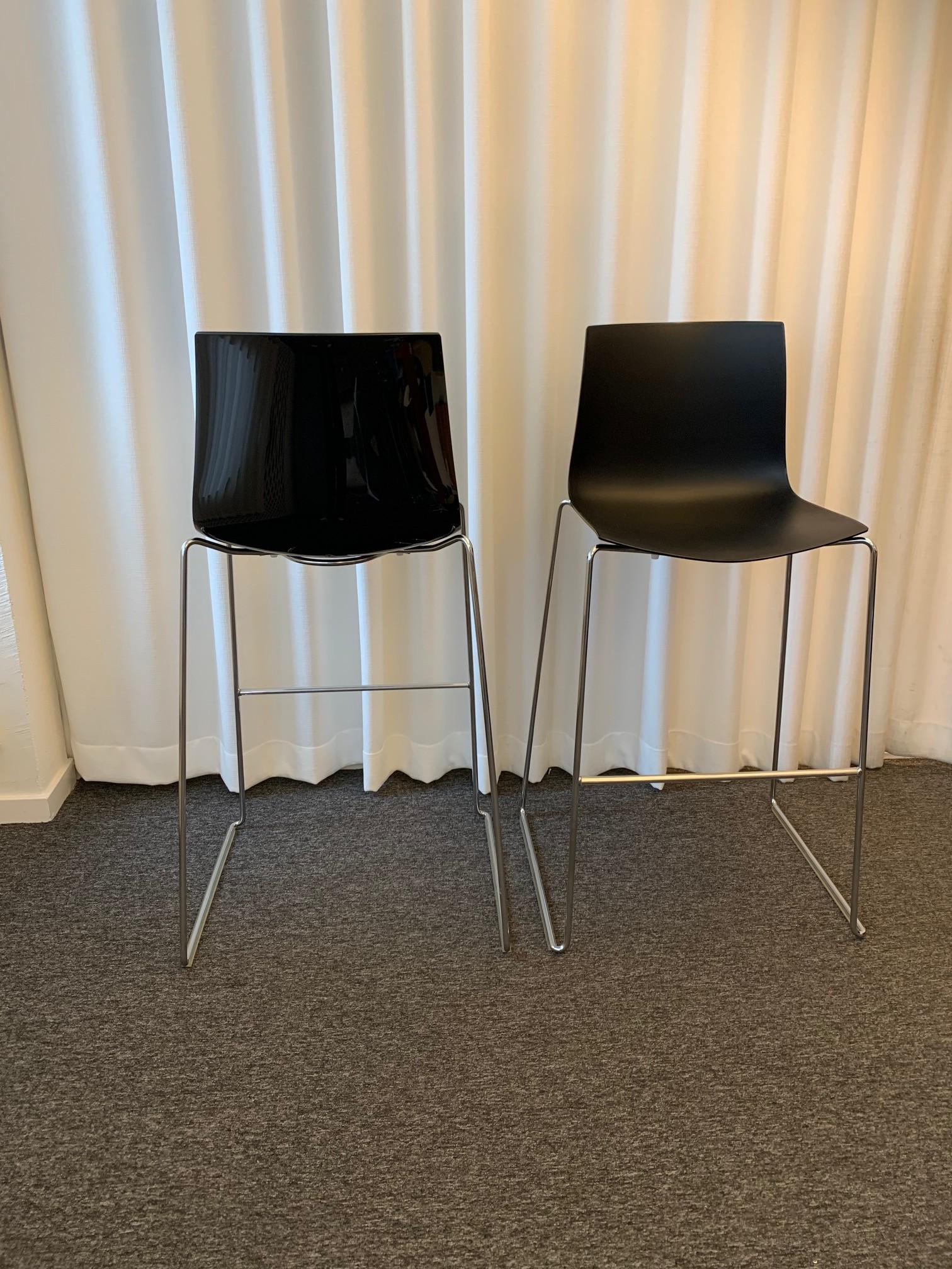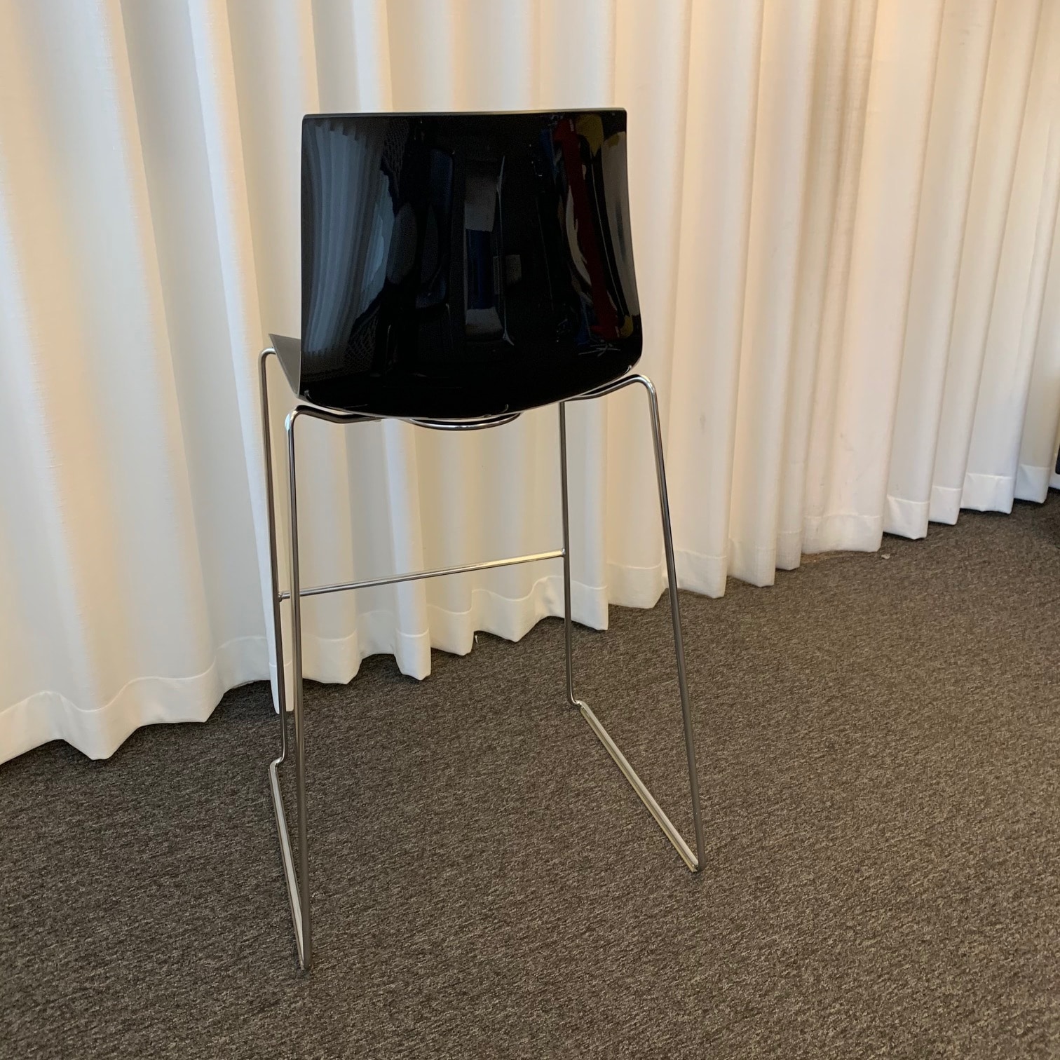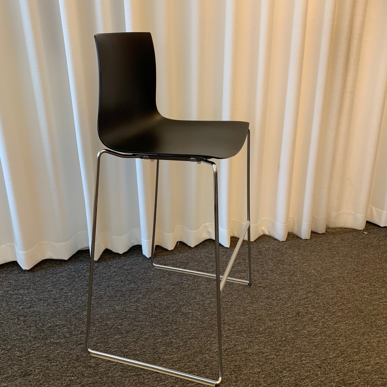 Sæde og ryg i plast (sort). Medestel i metal (krom).