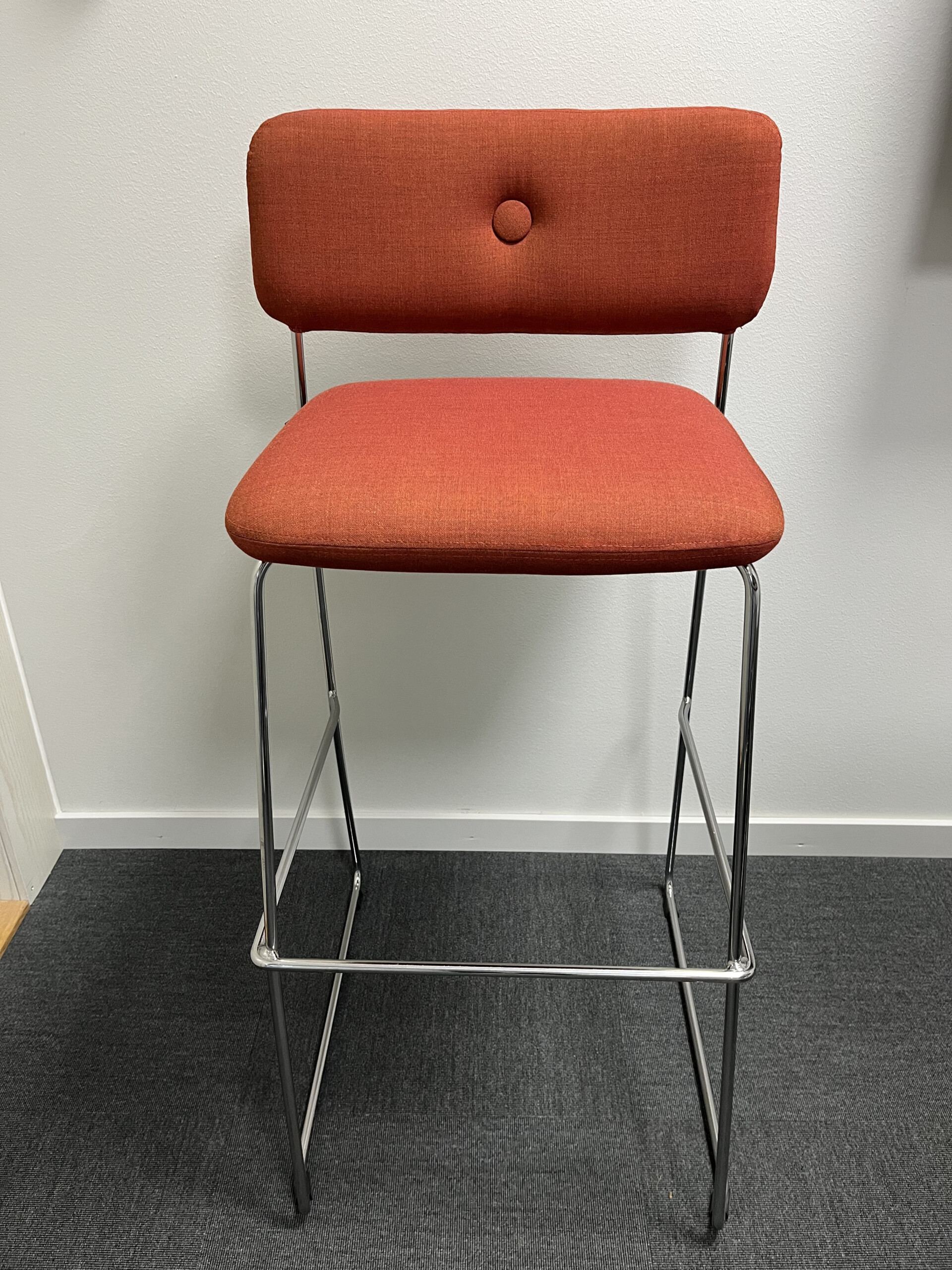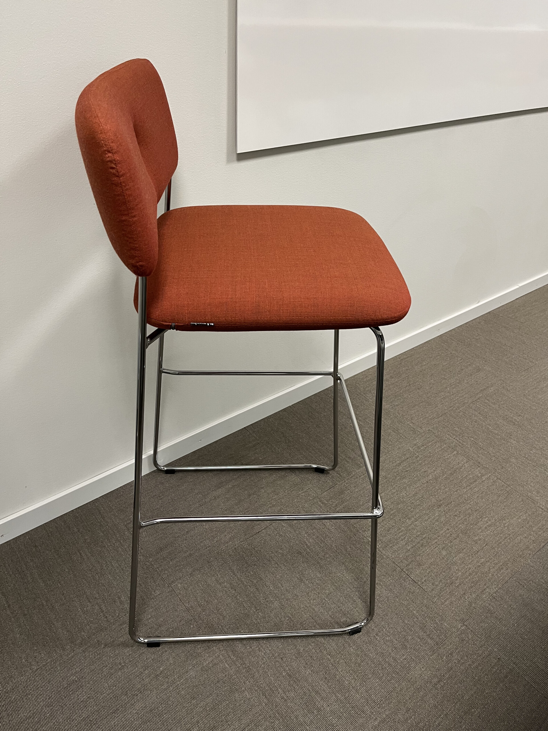 Sæde og ryg i stof (orange). Medestel i metal (krom).