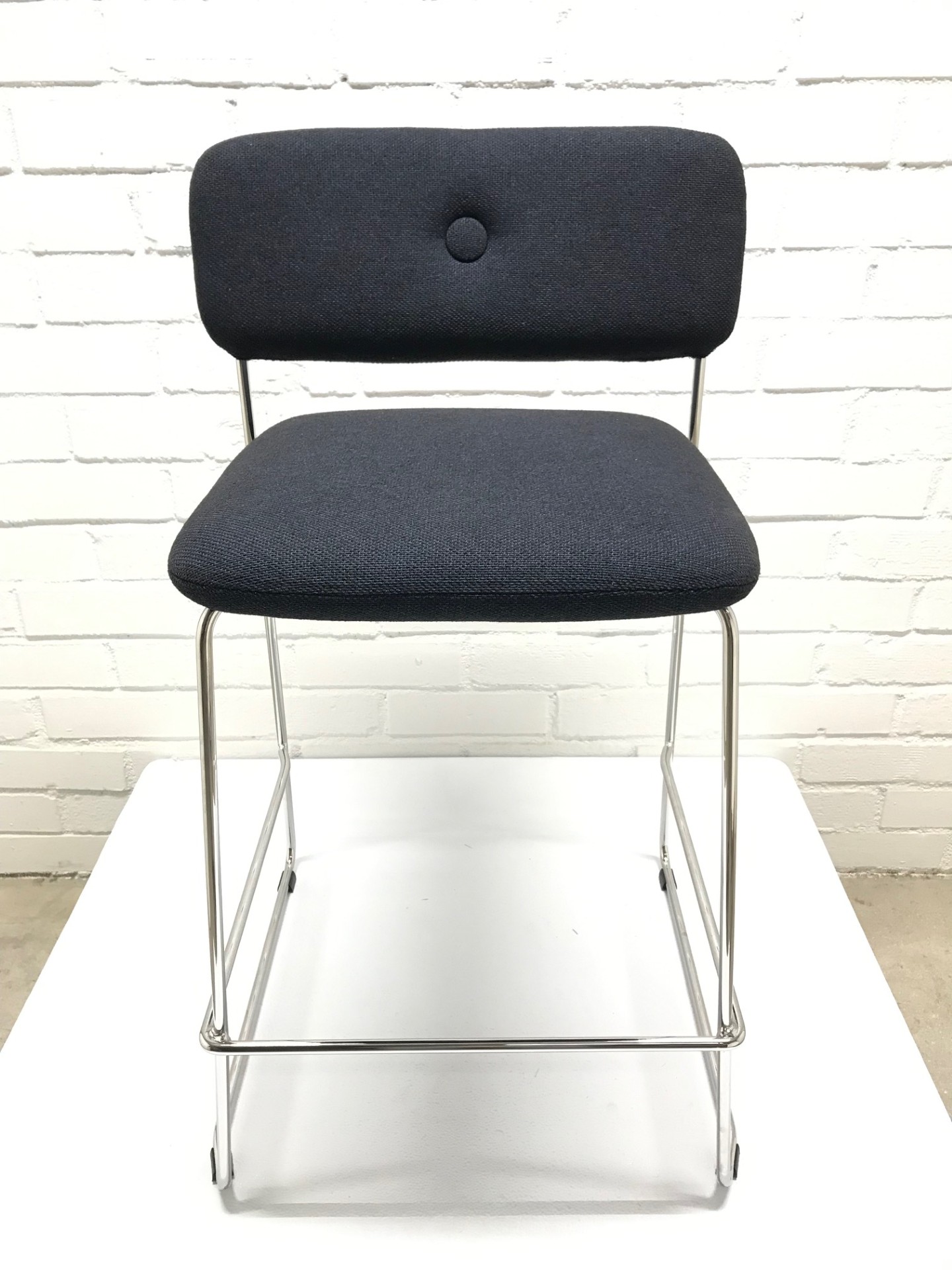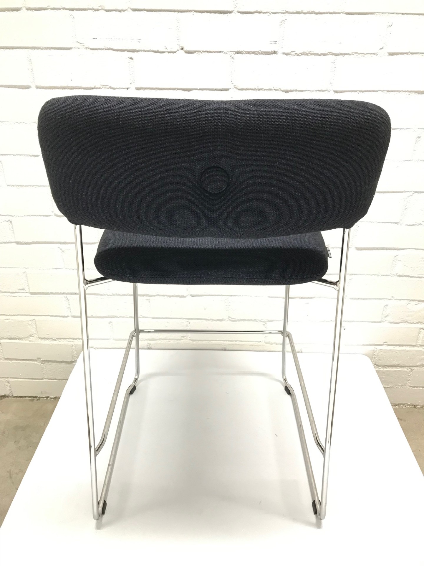 Sæde og ryg i stof. Medestel i metal (krom).