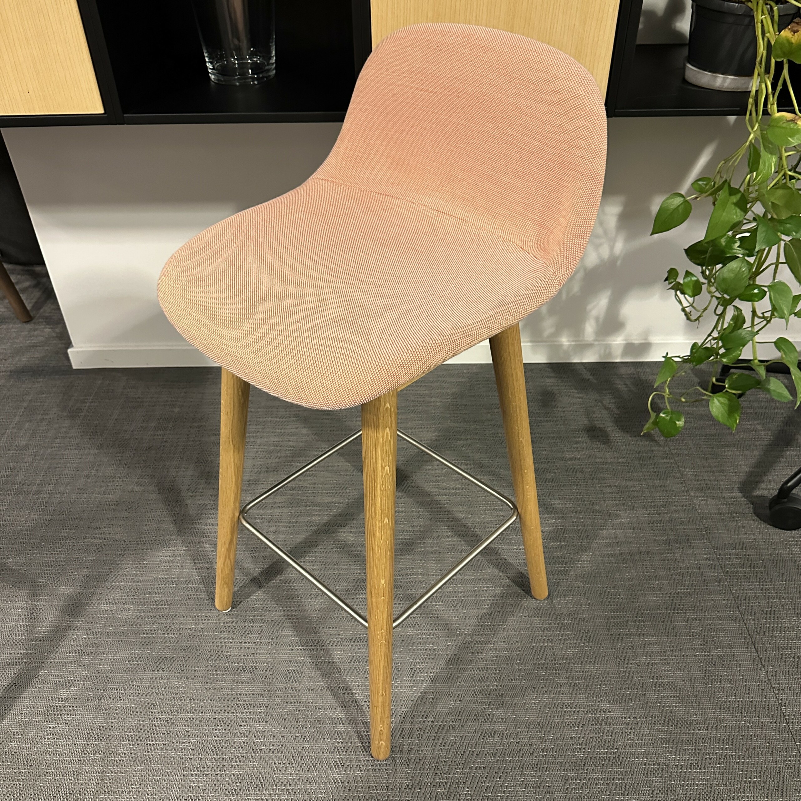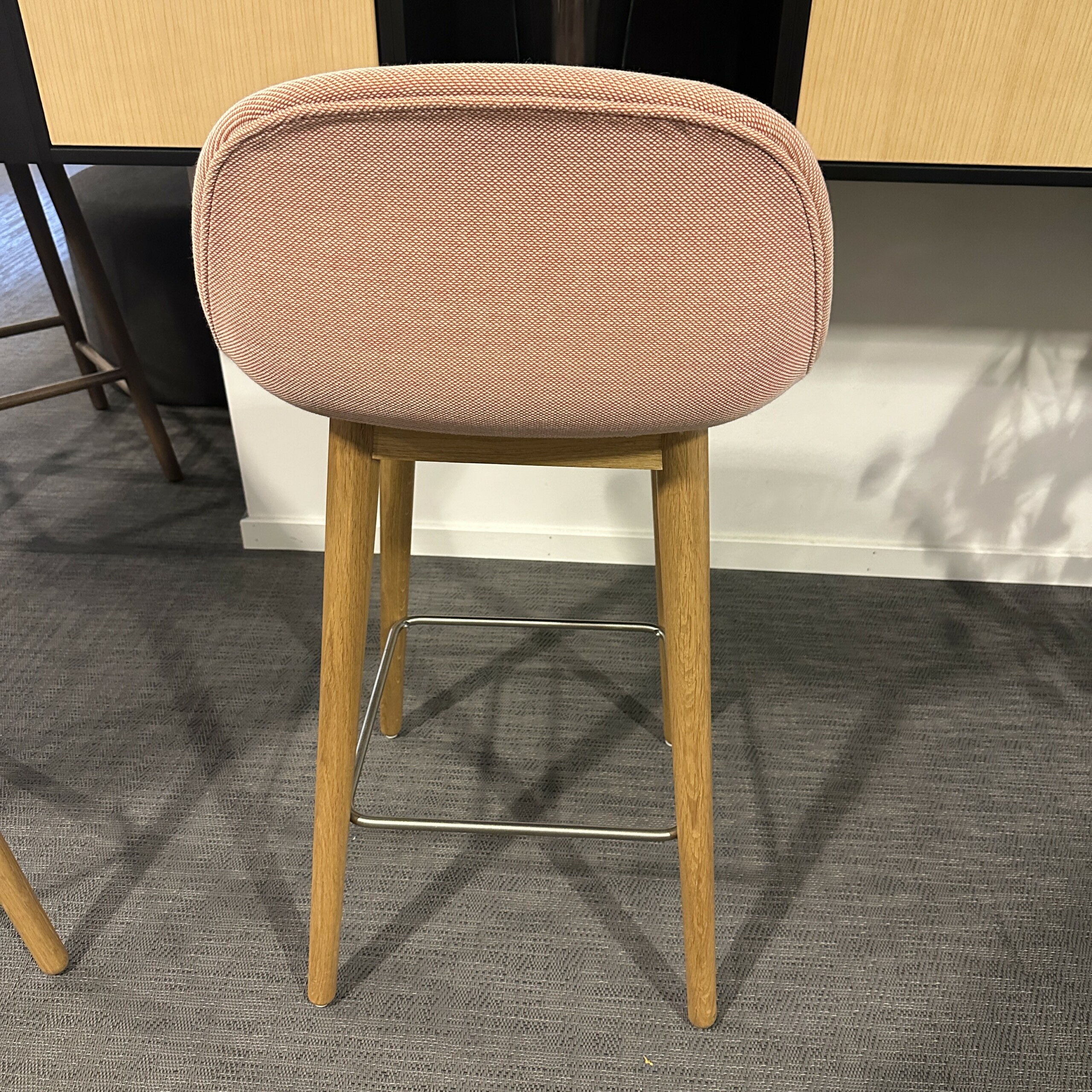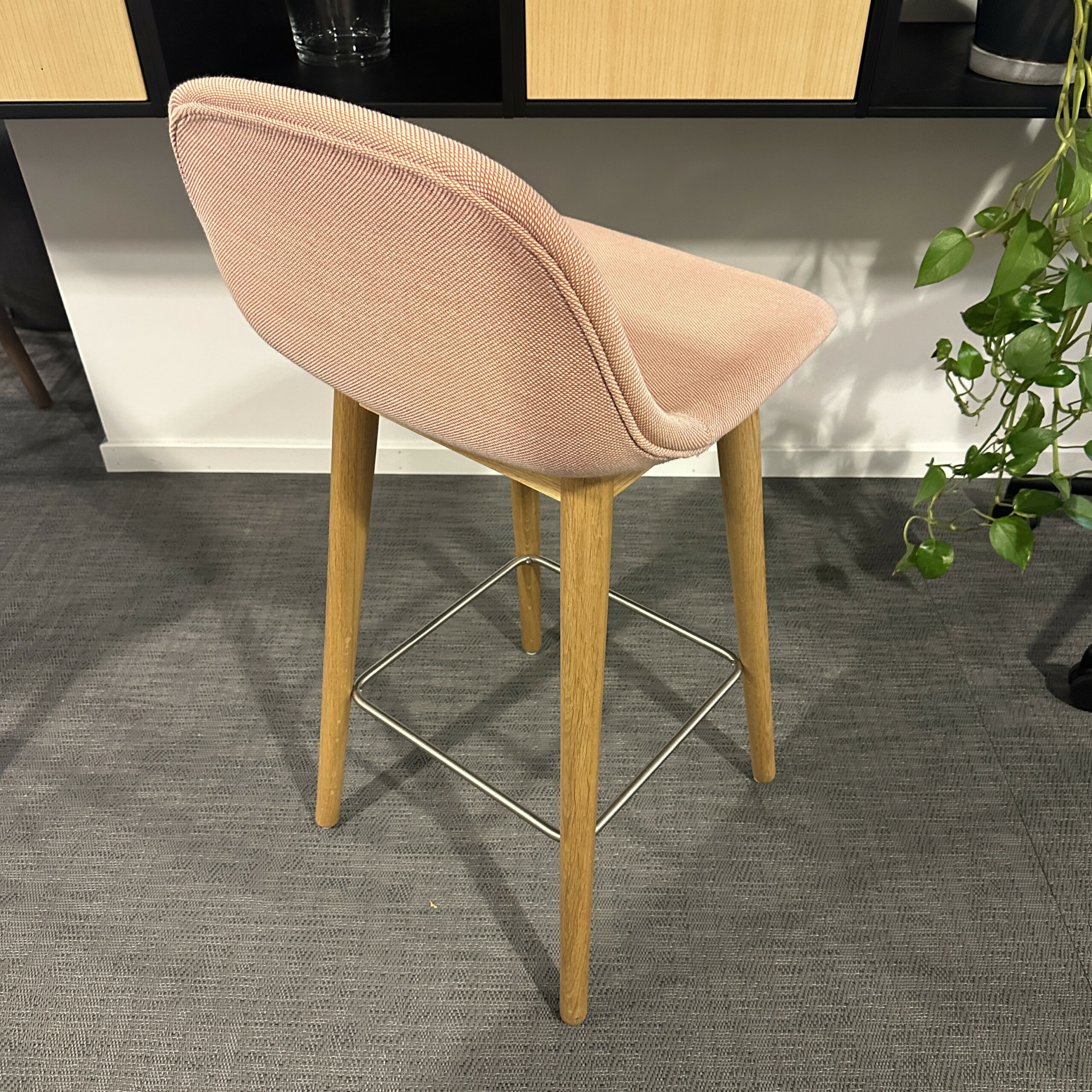 Sæde og ryg i stof (lyserød). 4-bensstel i træ (eg).