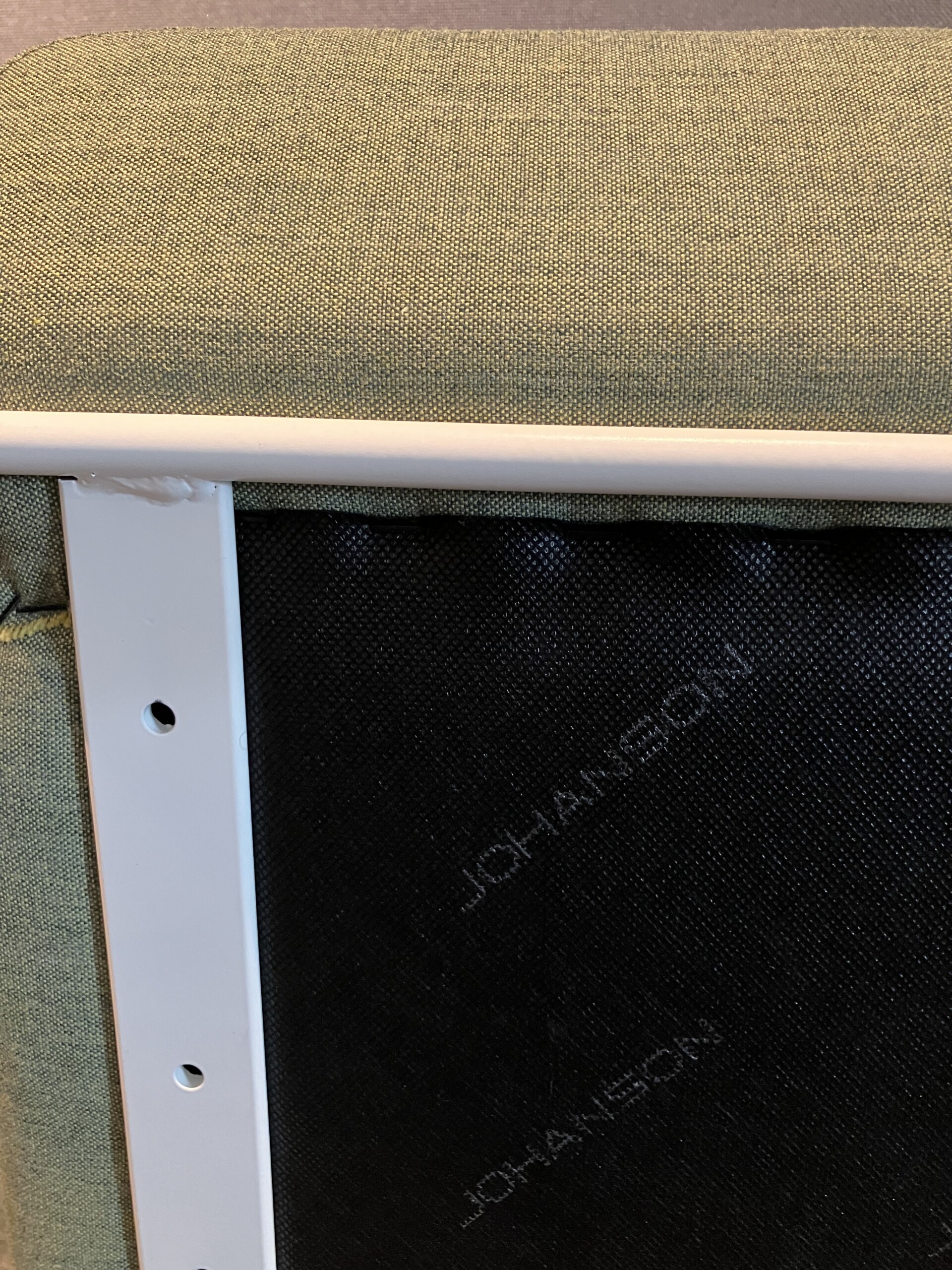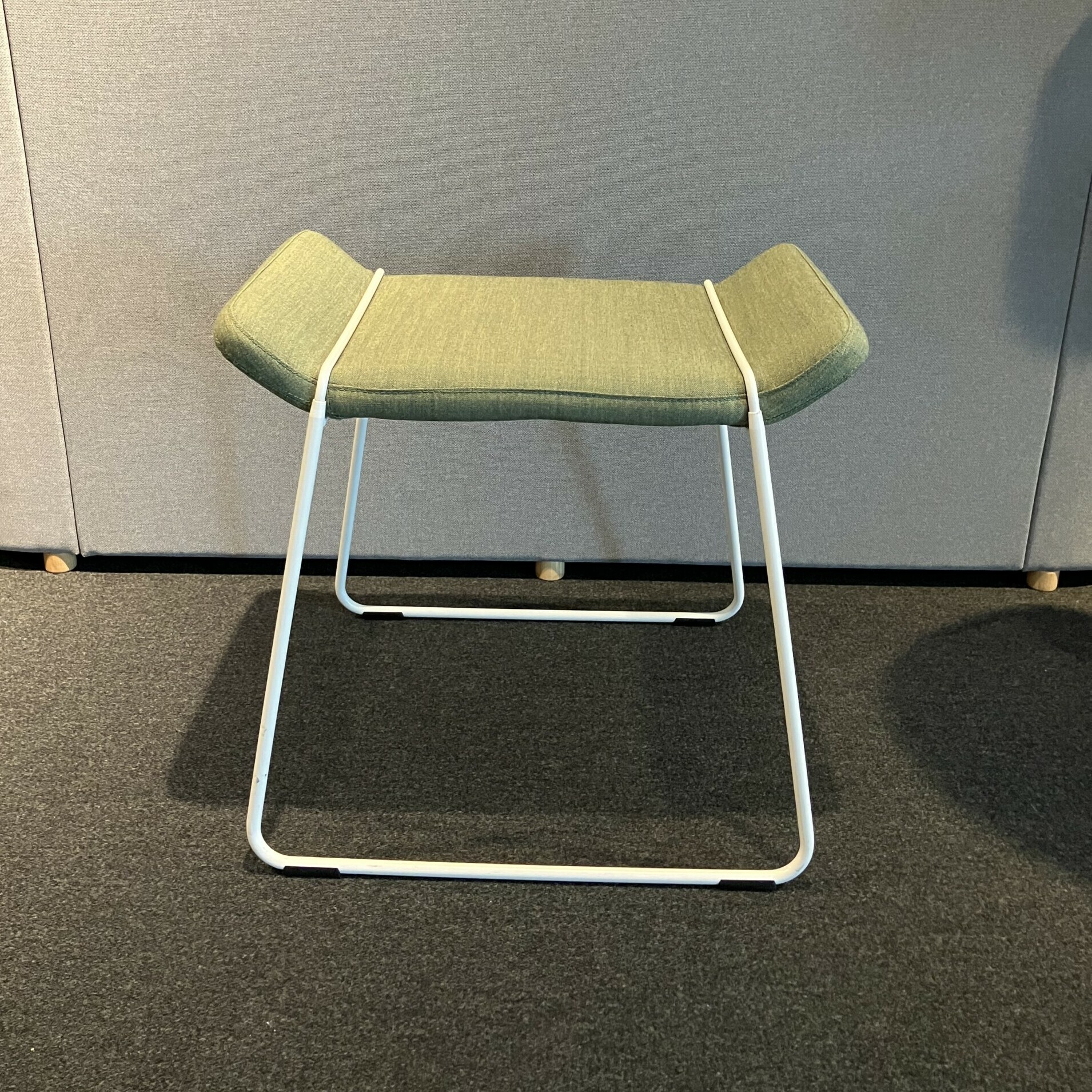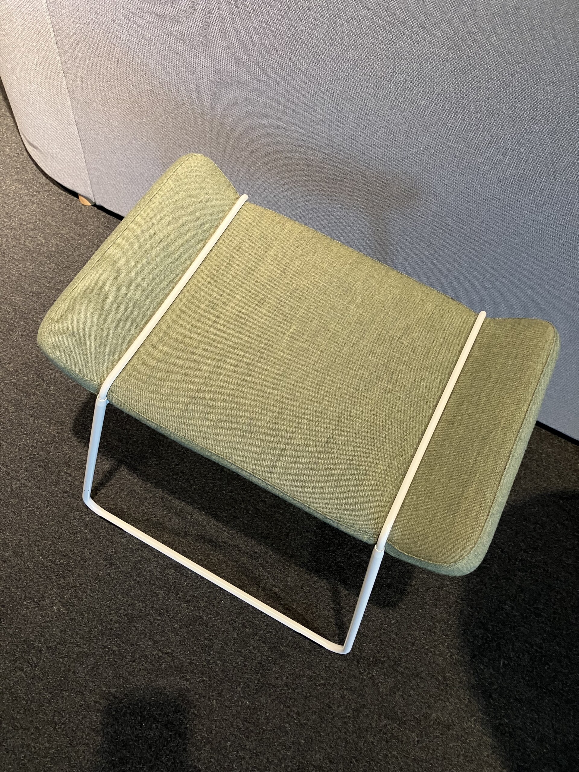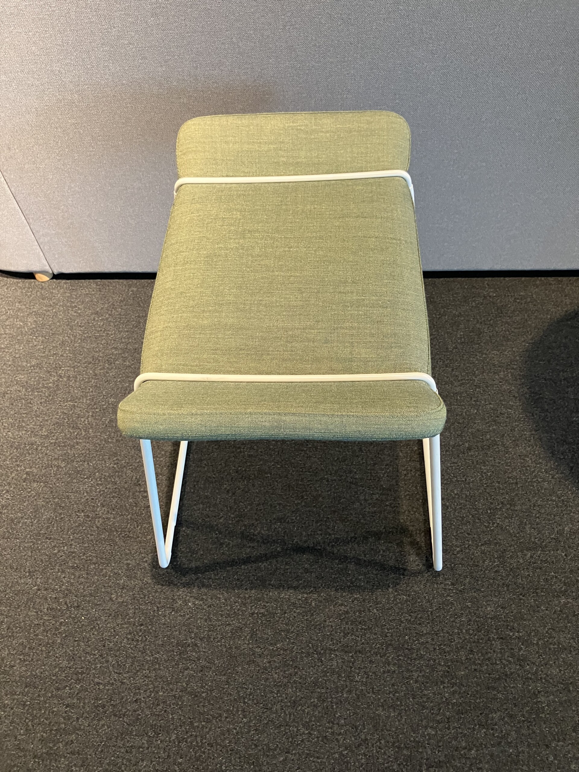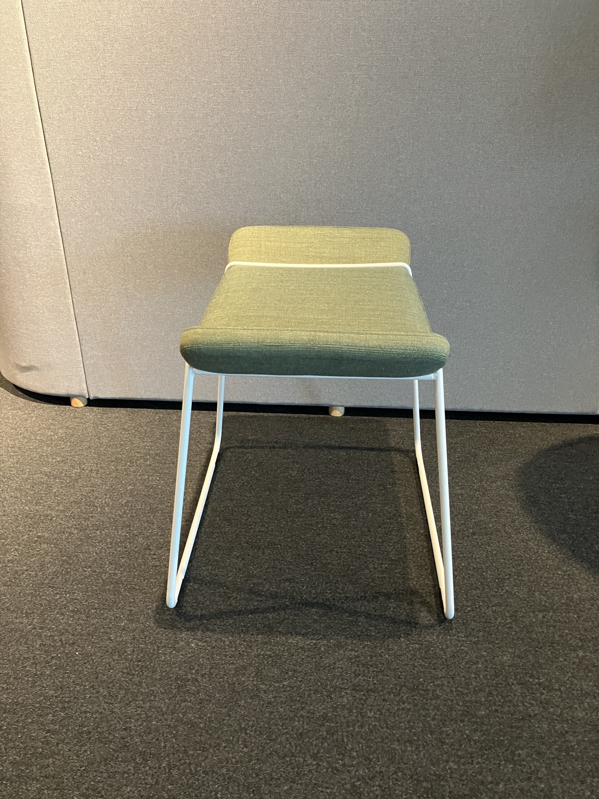 Sæde i stof (grøn). Medestel i metal (hvid).