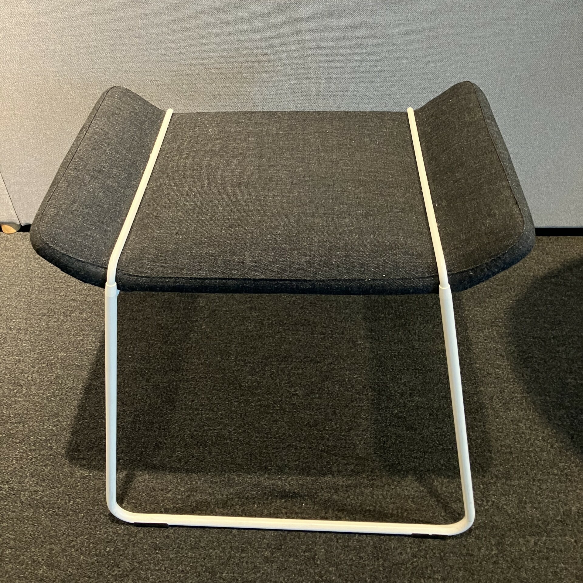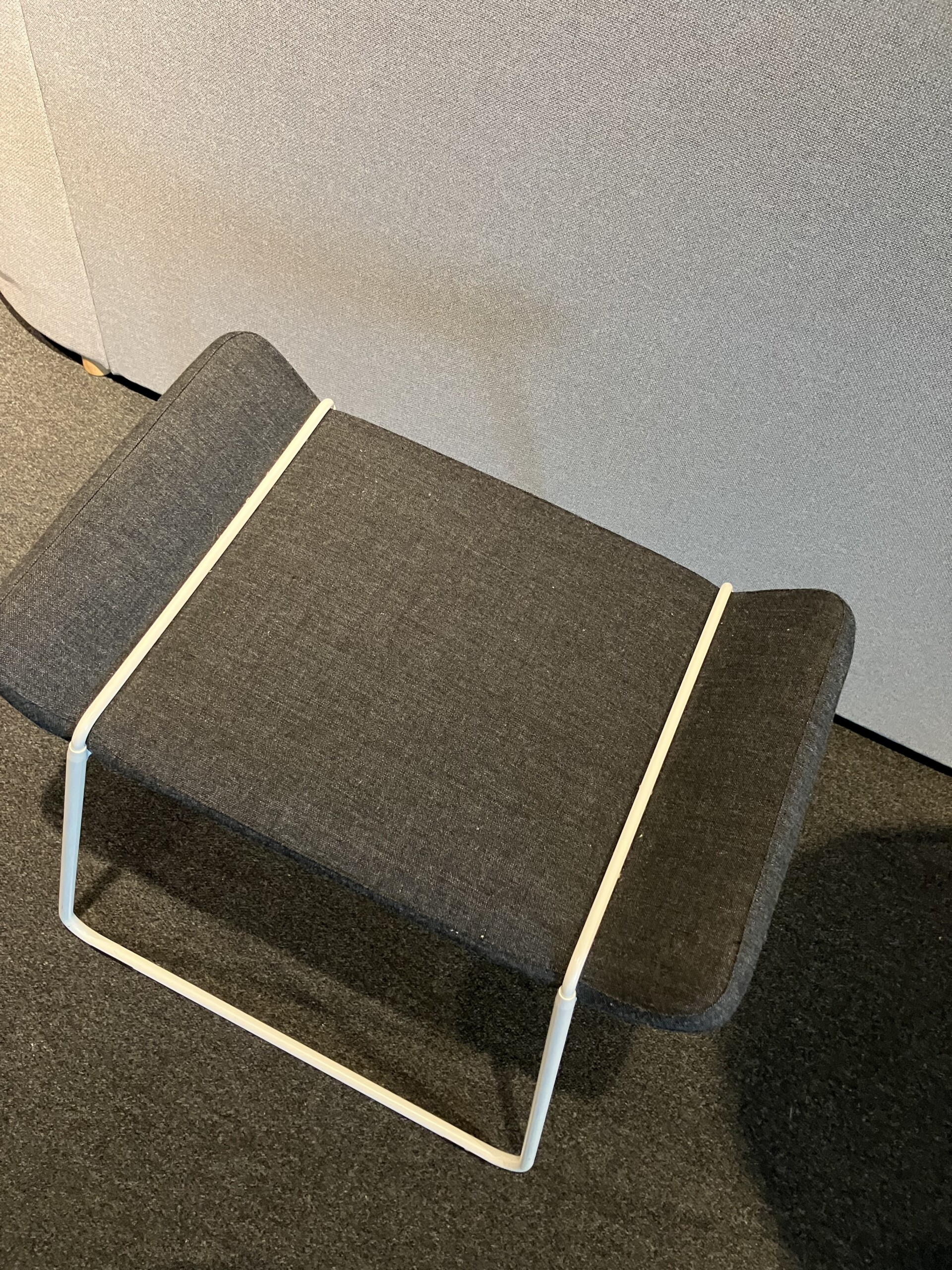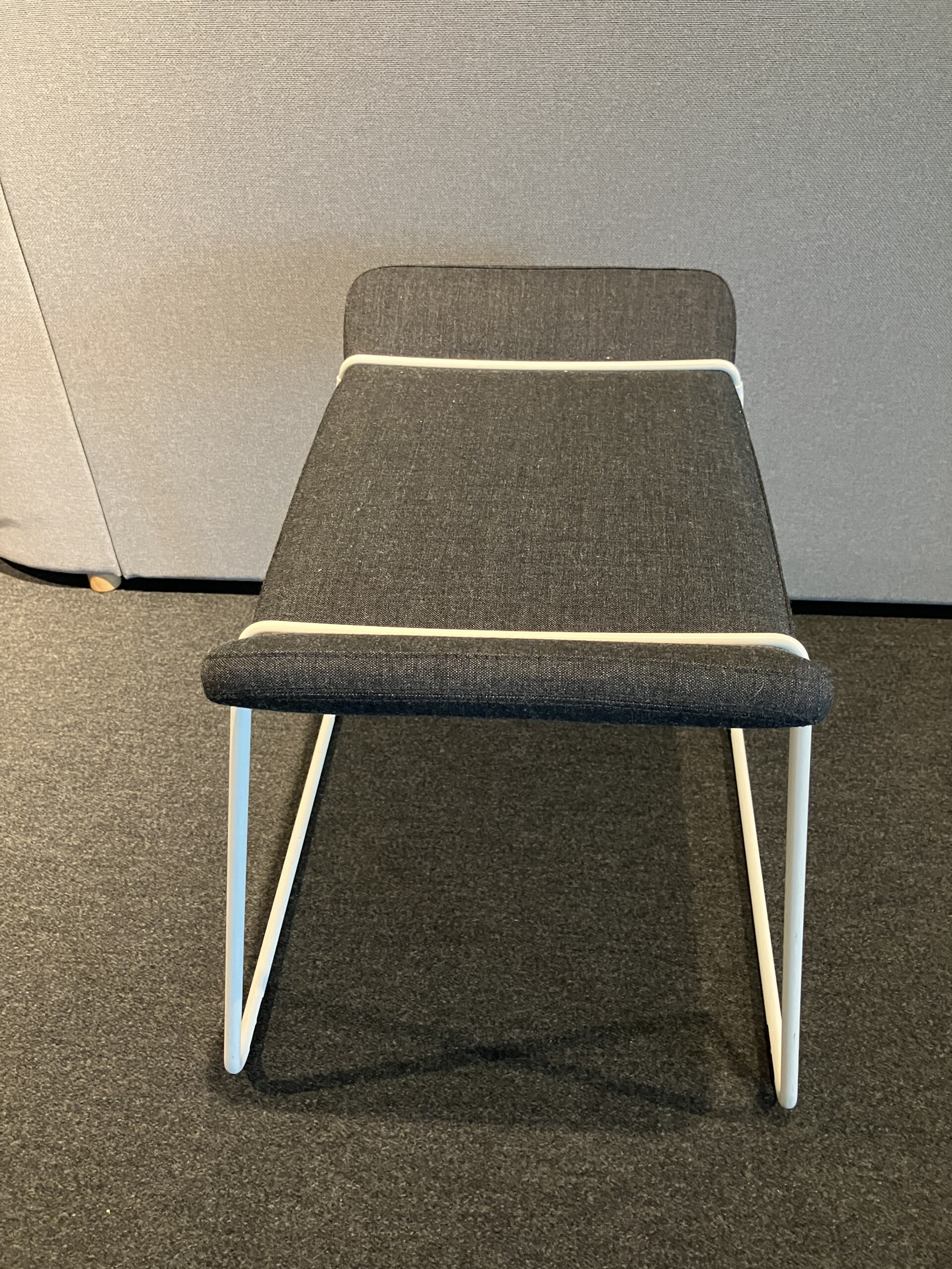 Sæde i stof (grå). Medestel i metal (hvid).