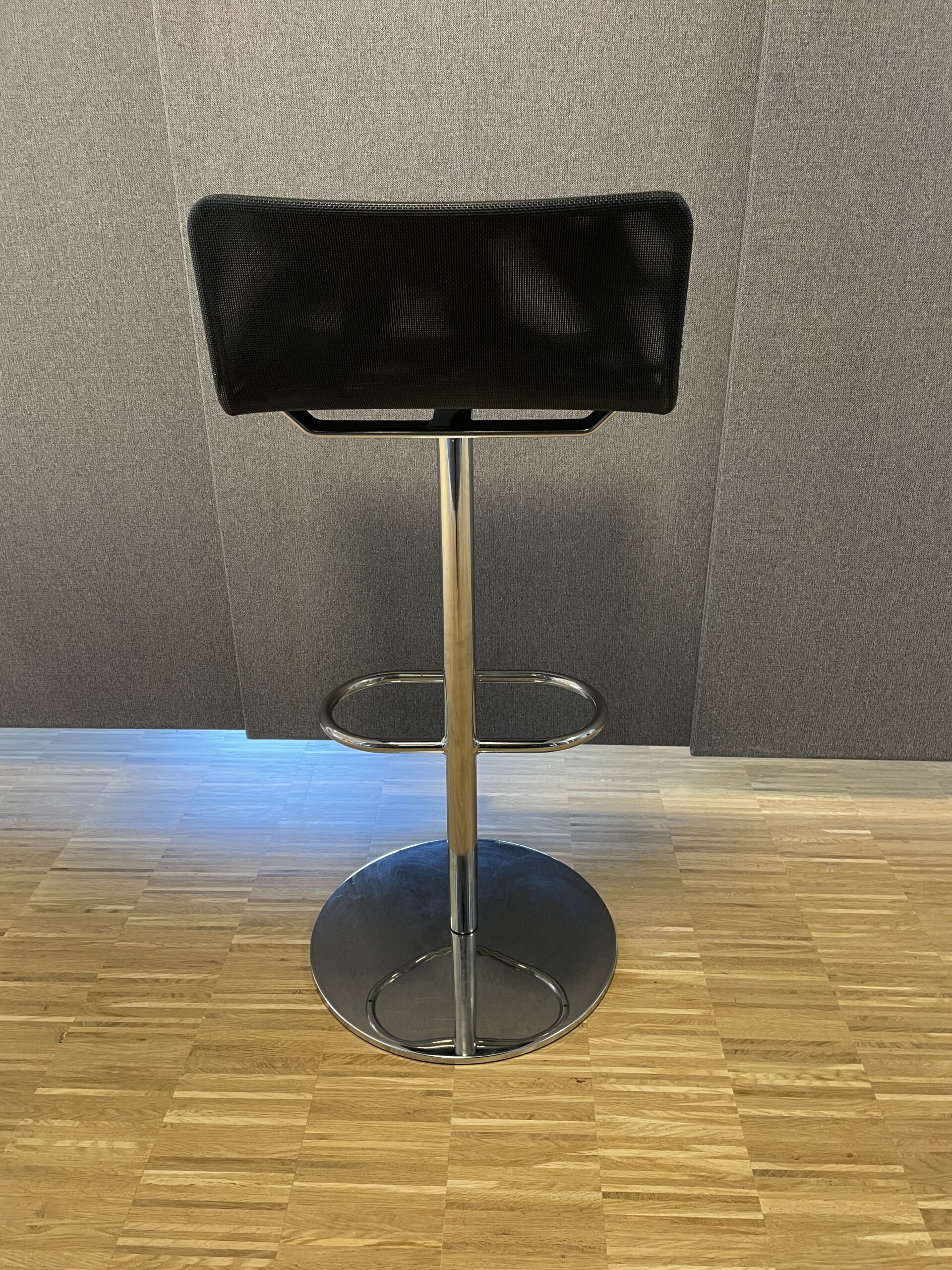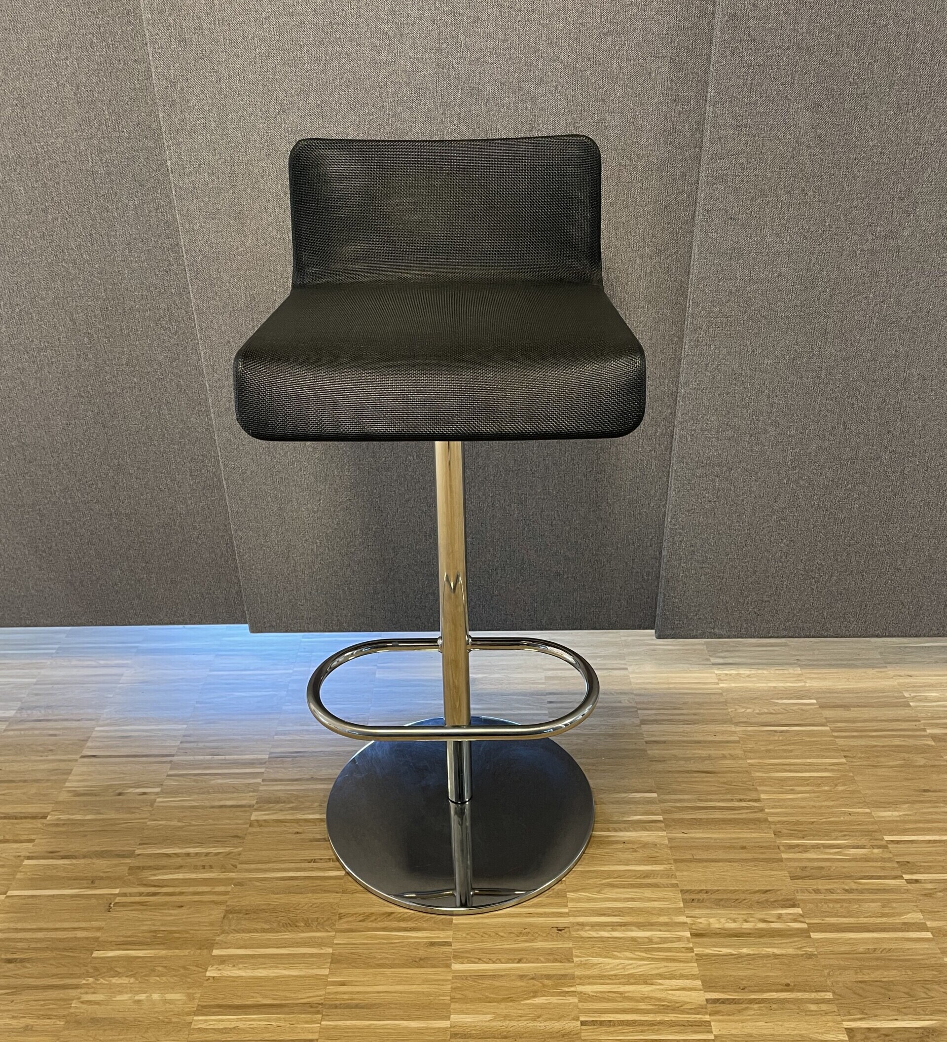 Sæde og ryg i stof (sort). Søjlefod i metal (krom).
