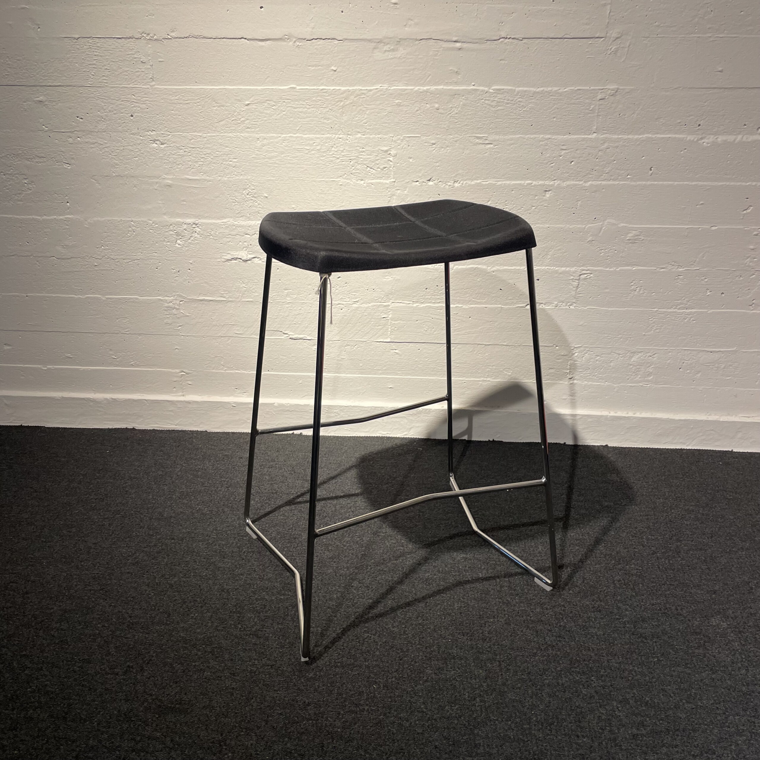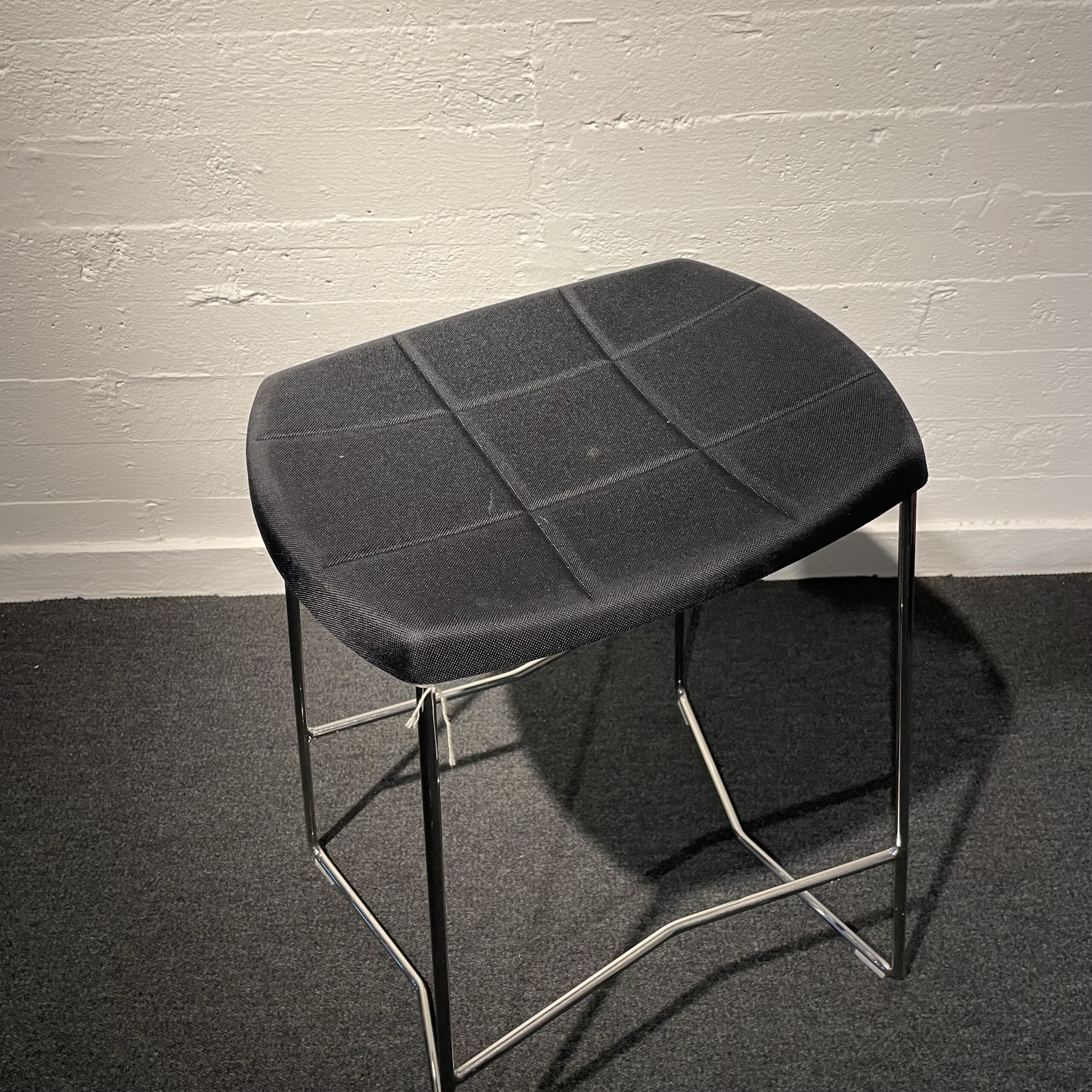 Sæde i stof (sort). Medestel i metal (krom).