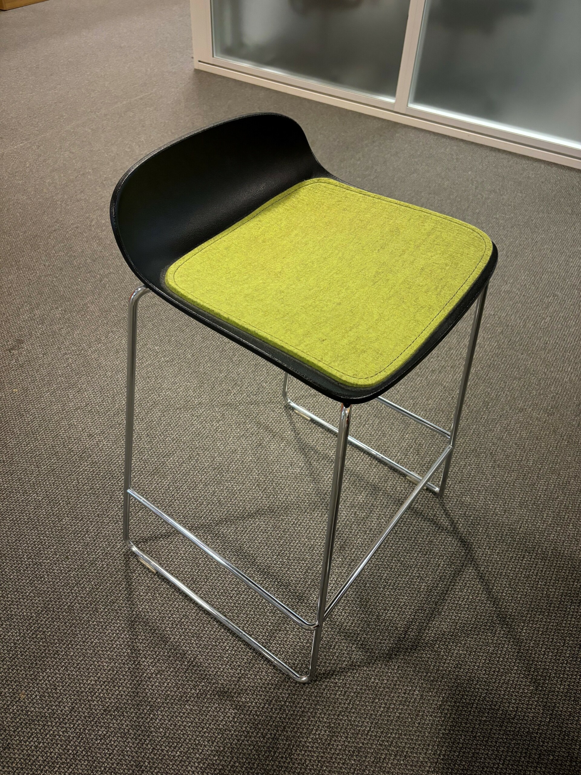 Sæde i stof (grøn). Ryg i træ (sort). Medestel i metal (krom).