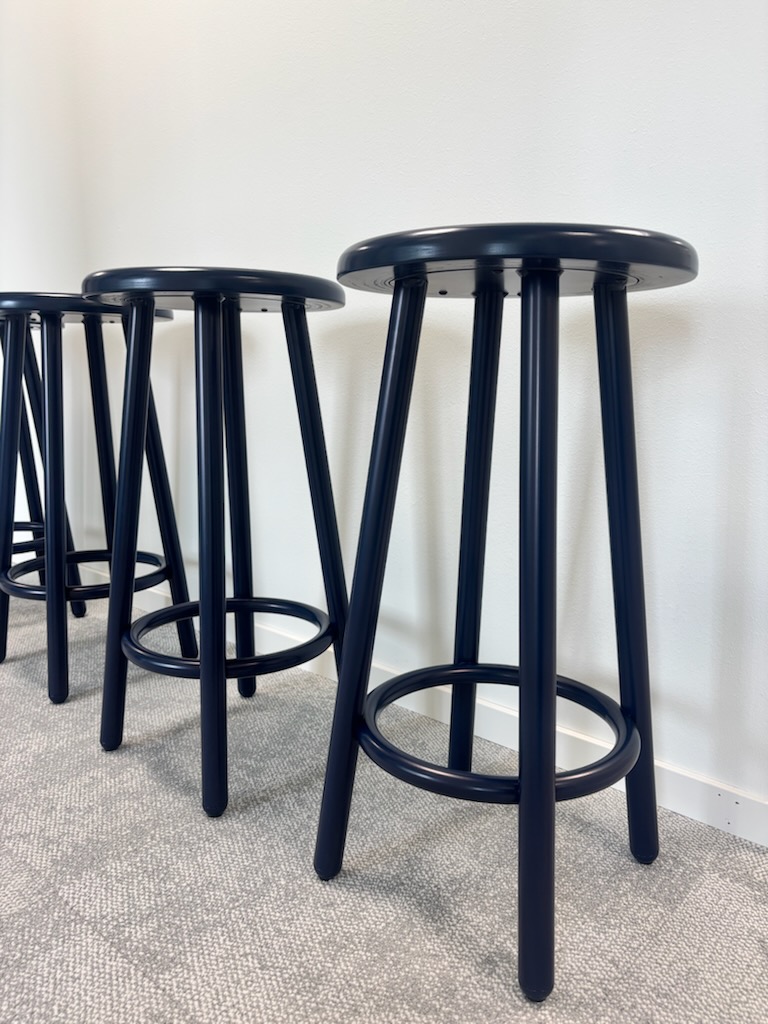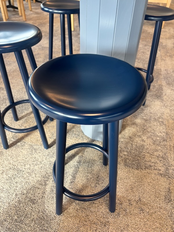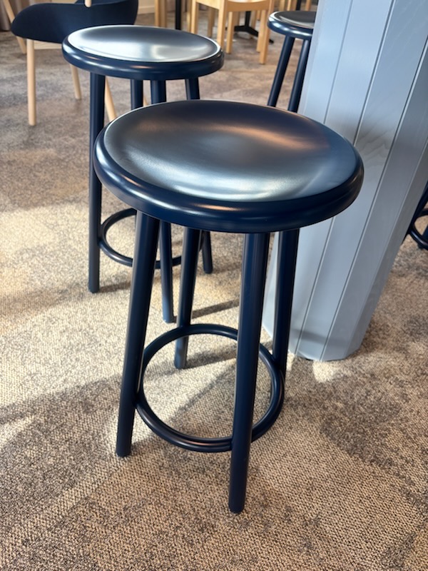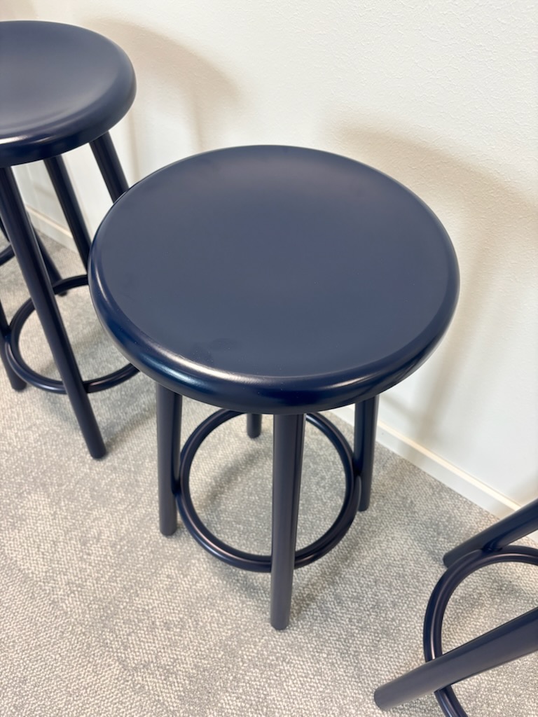 Sæde i træ (blå). 4-bensstel i metal (blå).