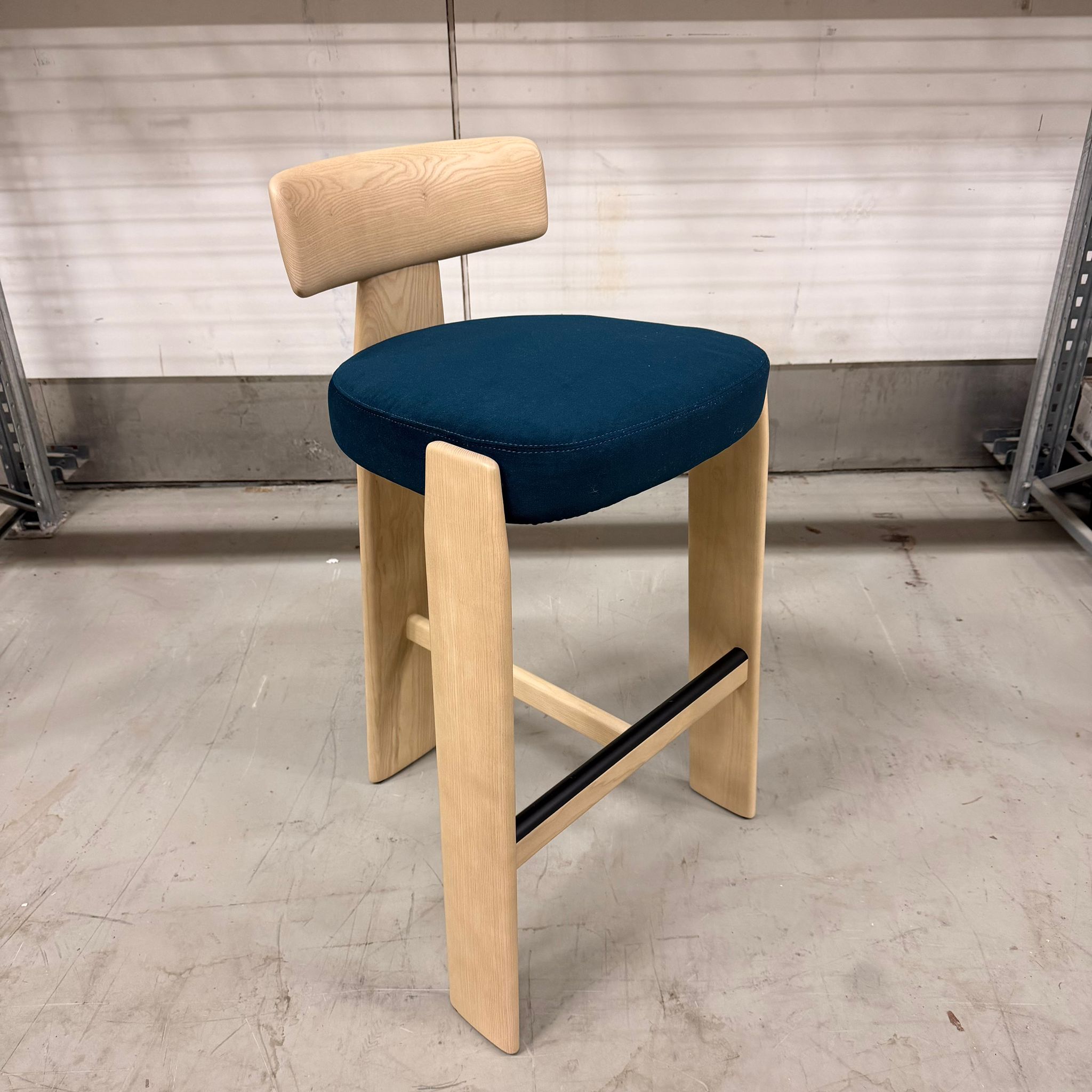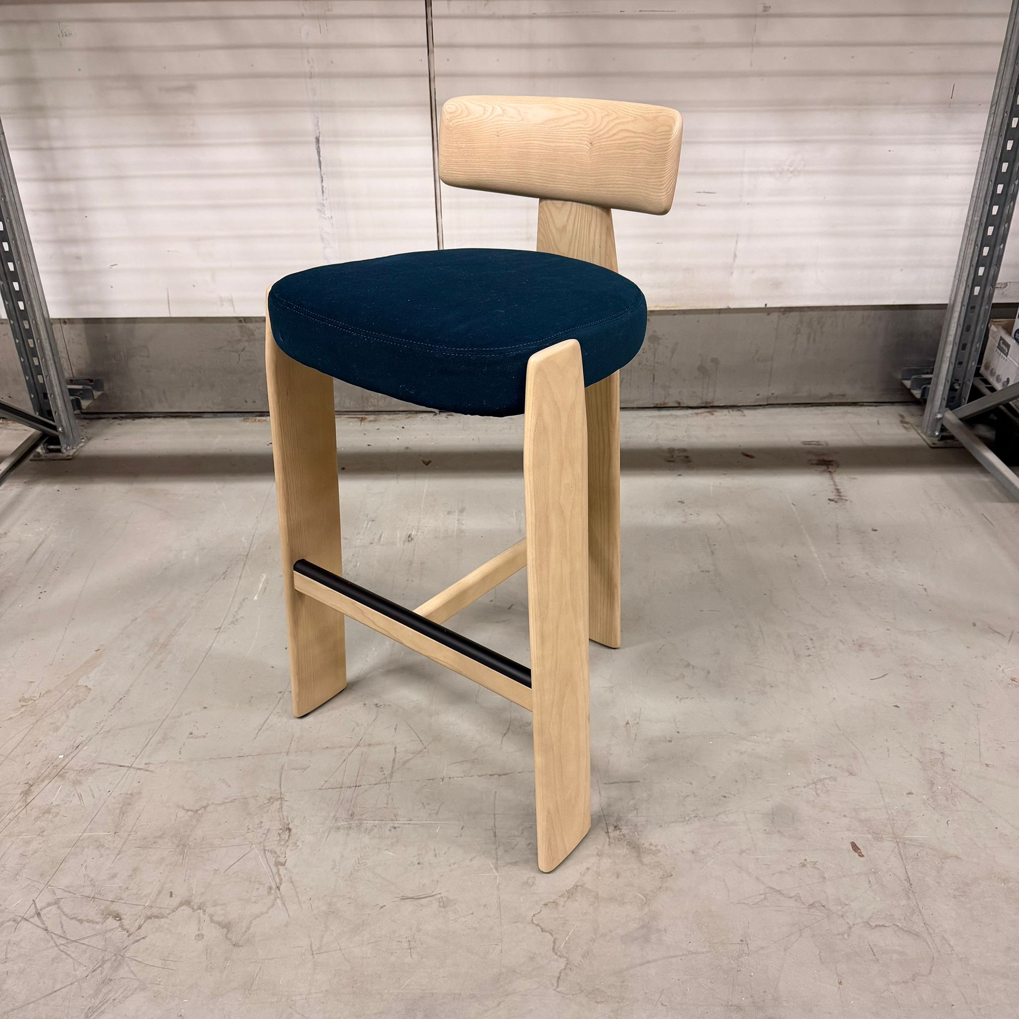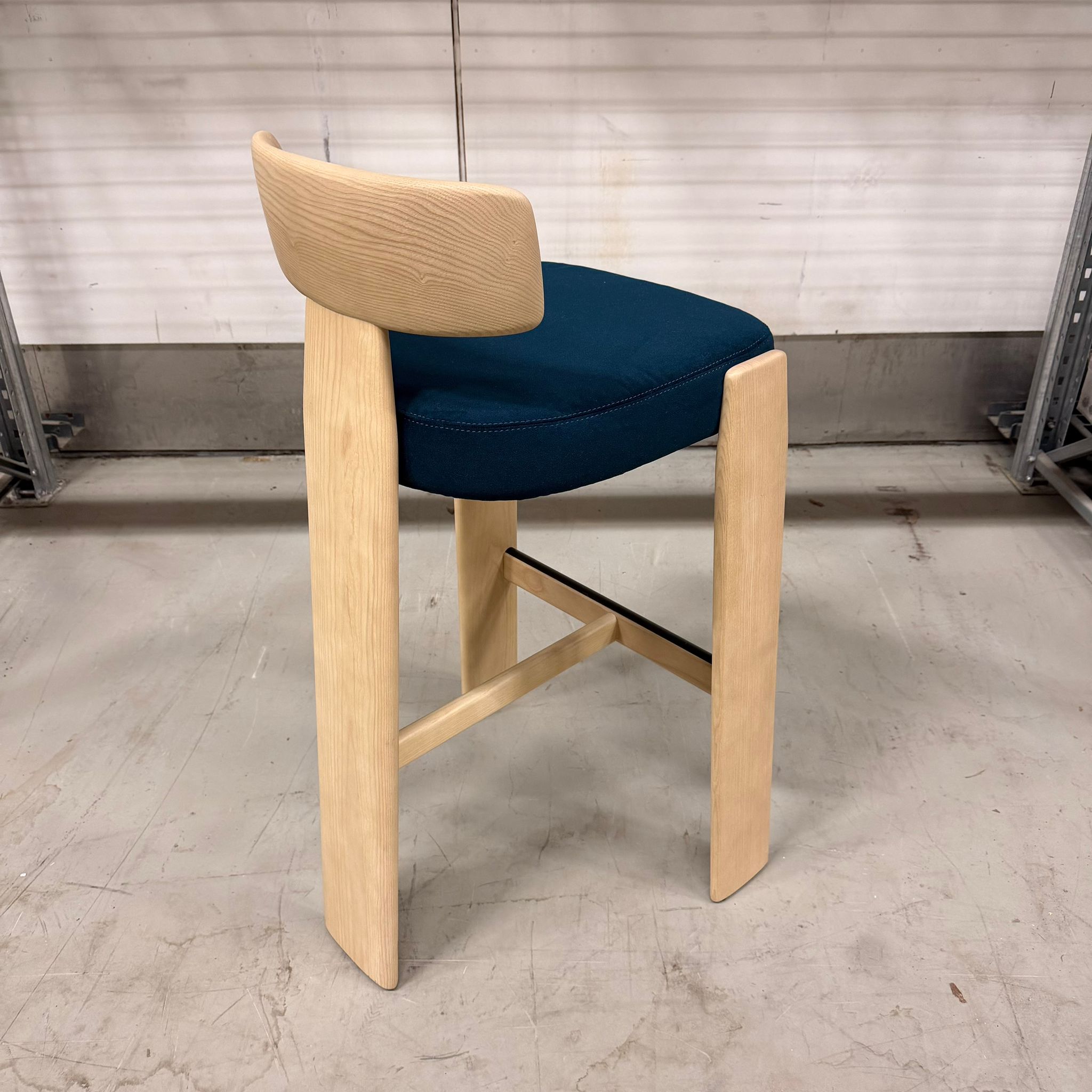 Sæde i stof (blå). Ryg i træ (eg). 4-bensstel i træ (eg).