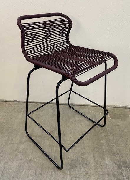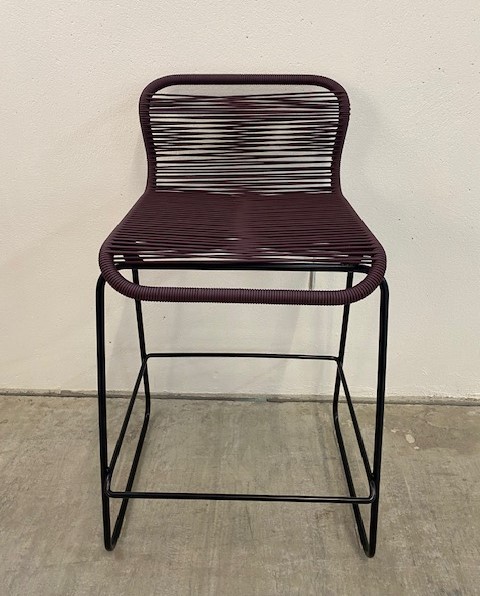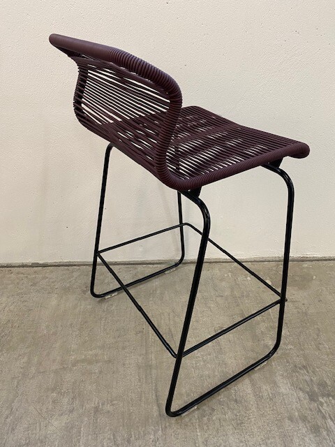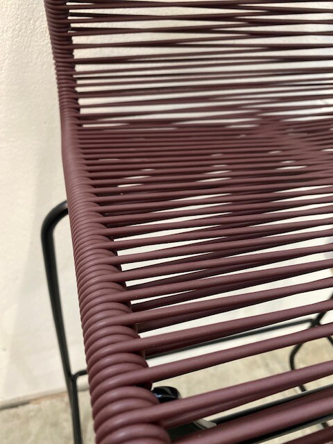 Sæde og ryg i gummi (rød). Medestel i metal (sort).