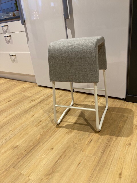 Sæde i stof (grå). Medestel i metal (hvid).