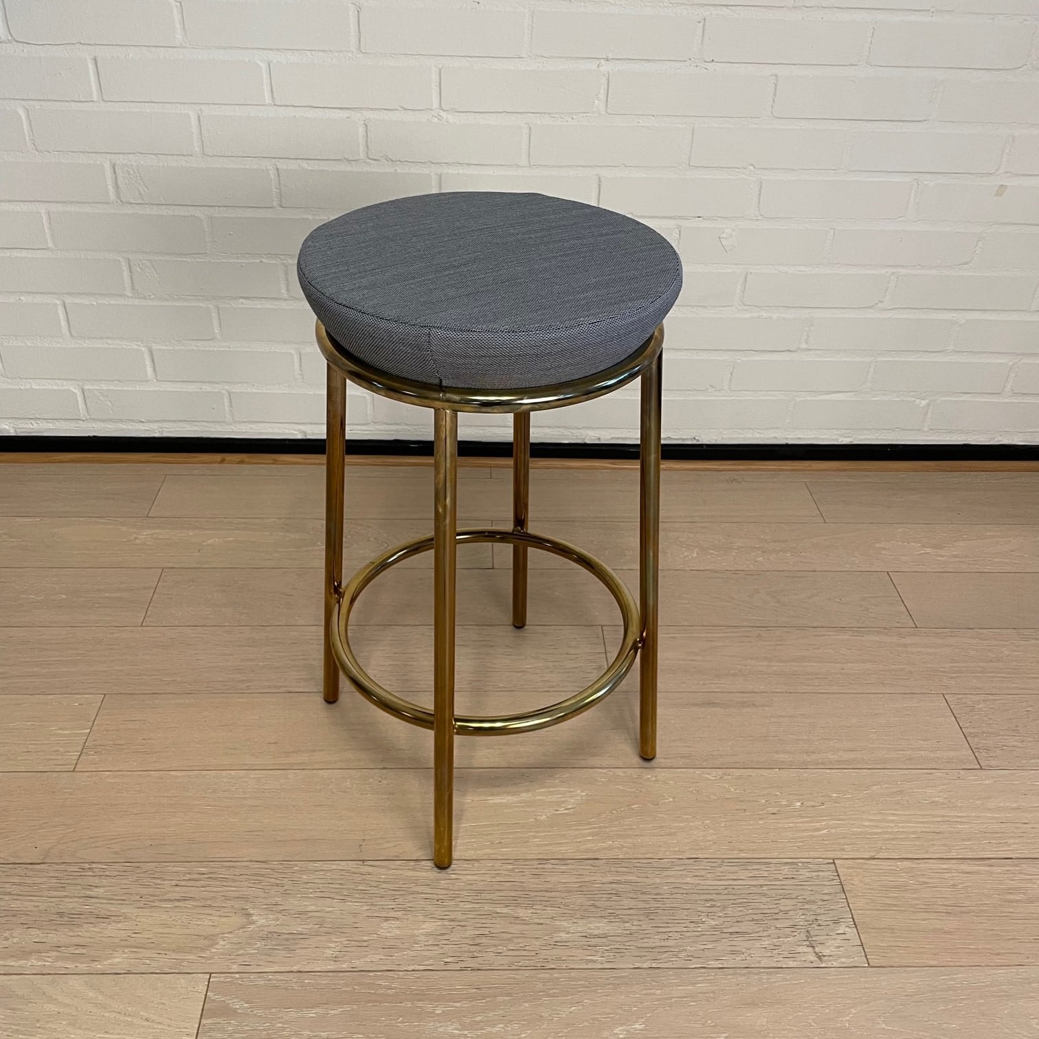 Sæde i stof (blå). 4-bensstel i metal (mässing).