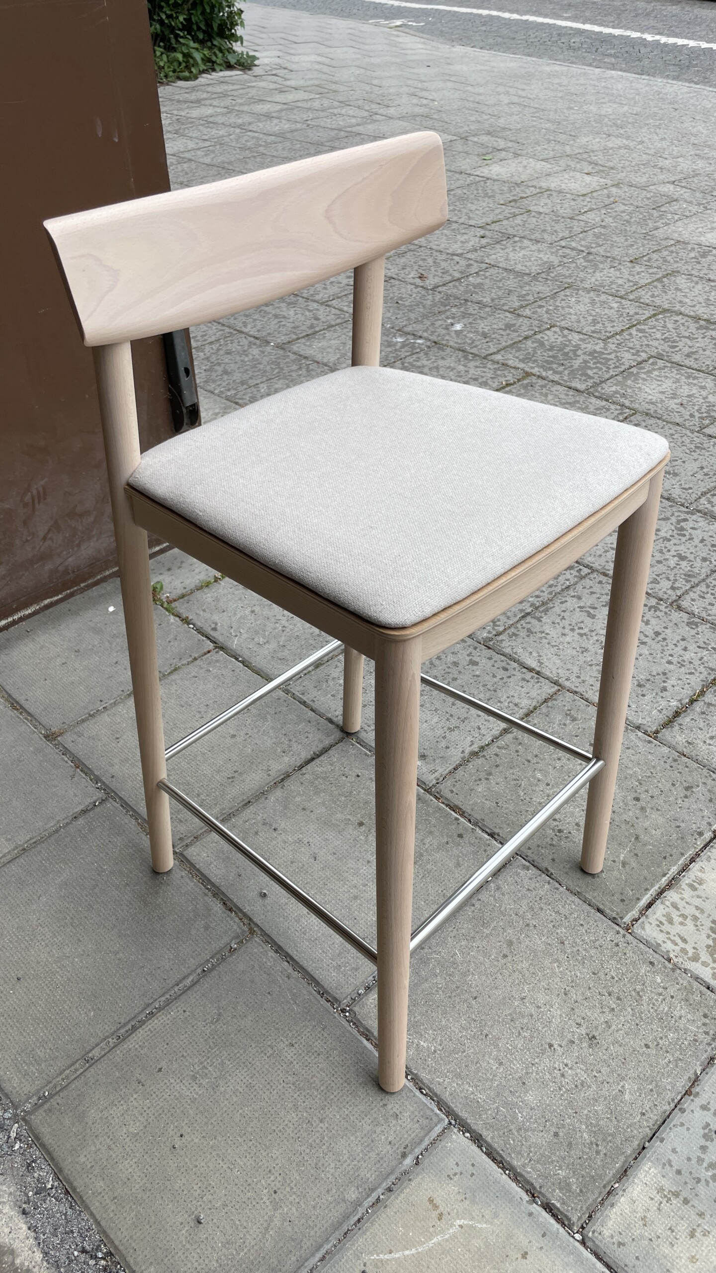 Sæde i stof (beige). Ryg i træ (birk). 4-bensstel i træ (birk).