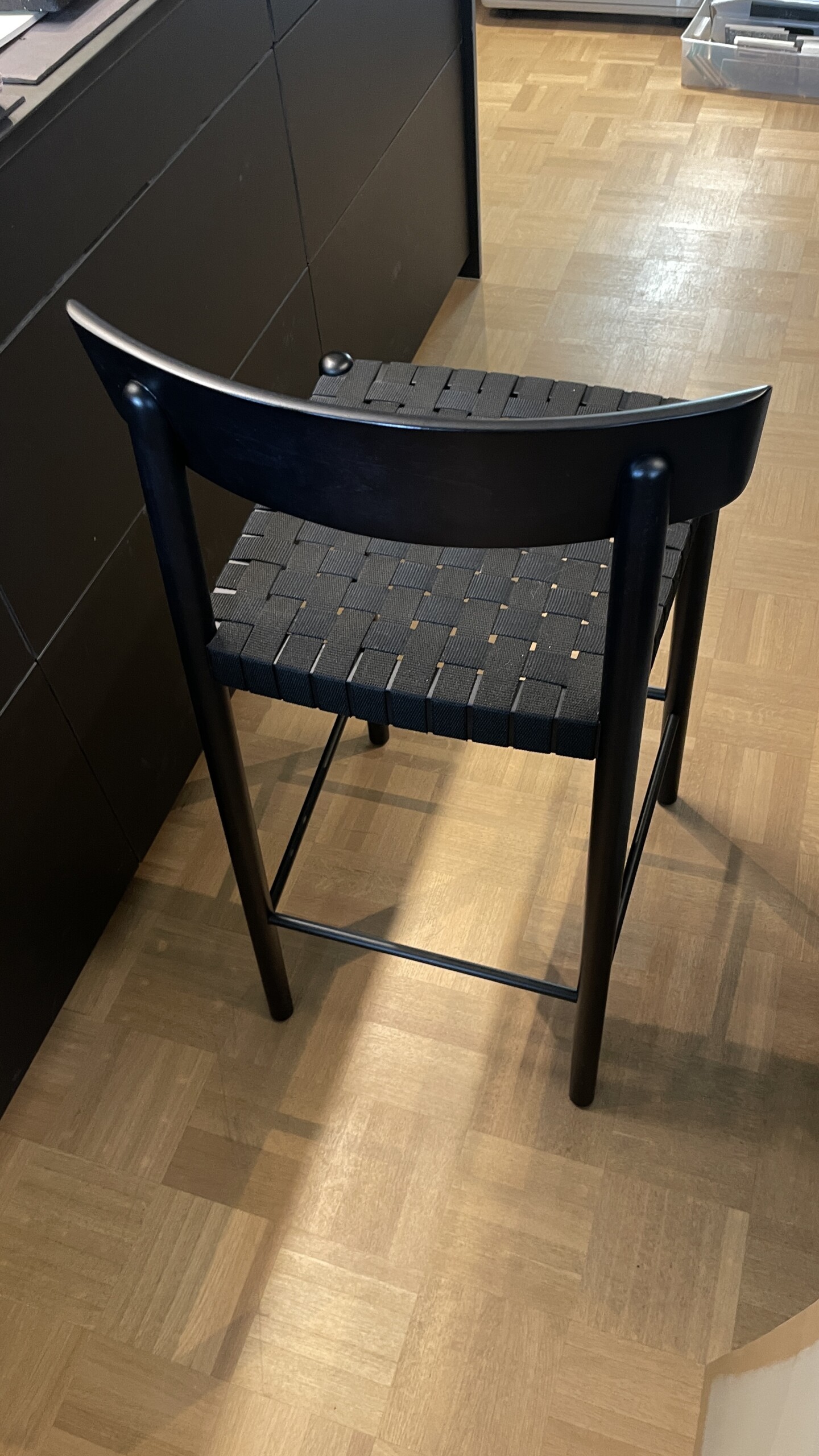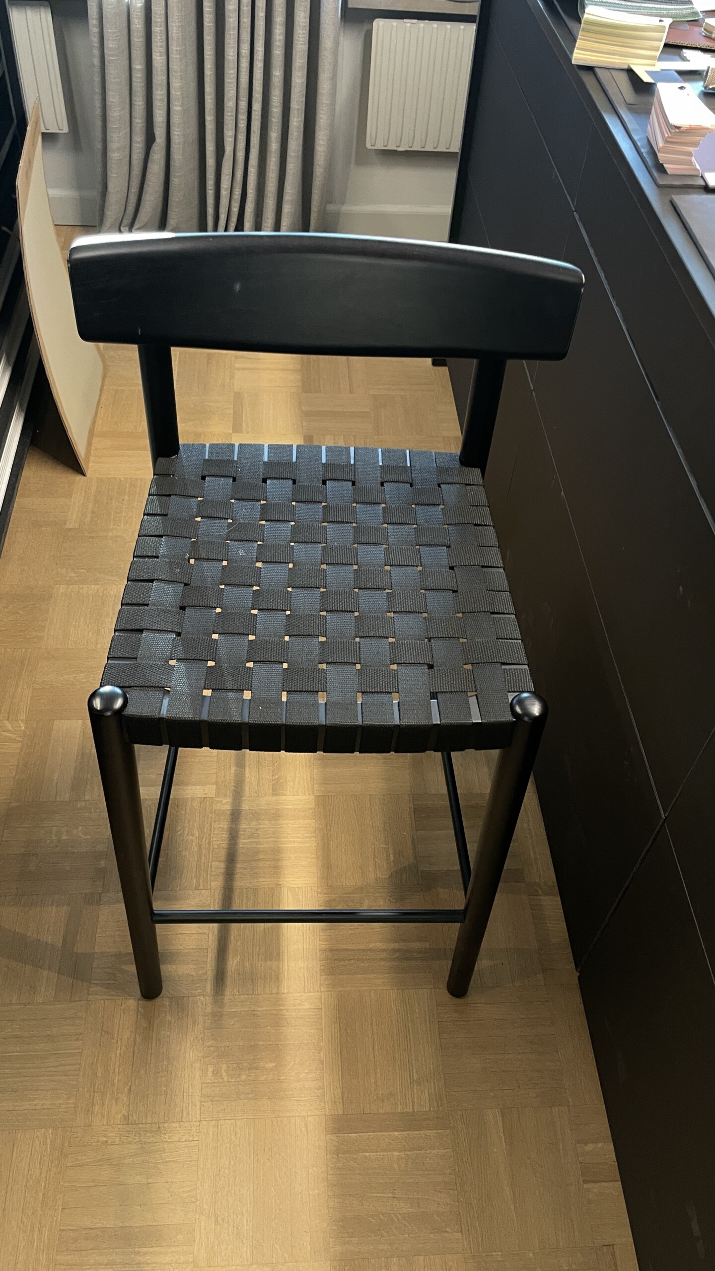 Sæde i sadelgjord (sort). Ryg i træ (sort). 4-bensstel i træ (sort).