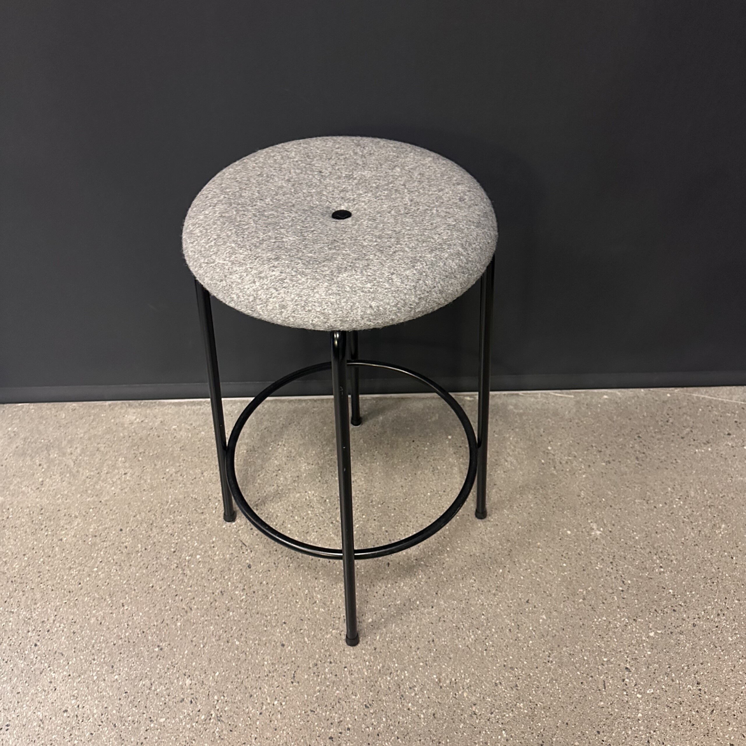Sæde i stof (grå). 4-bensstel i metal (sort).