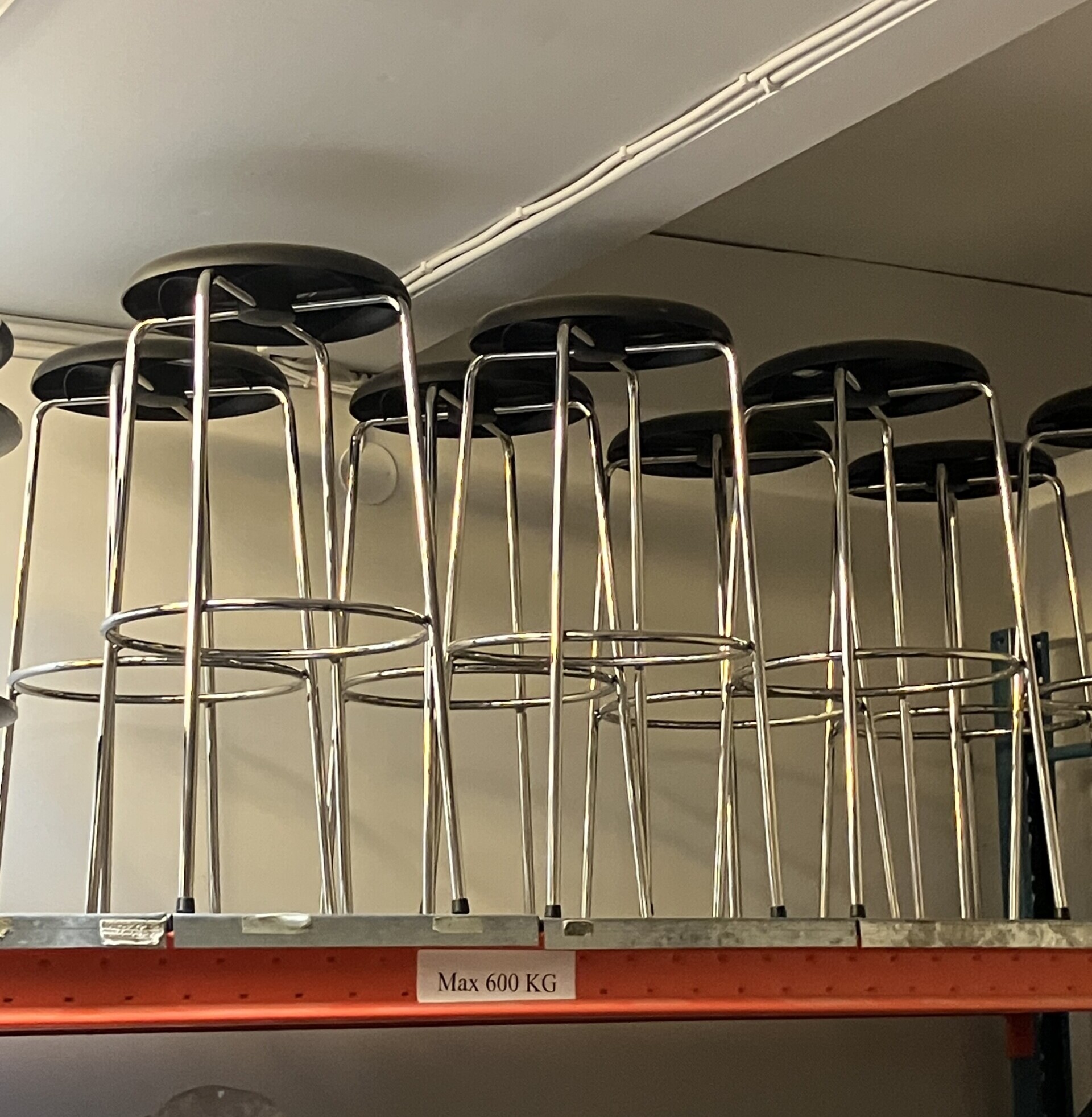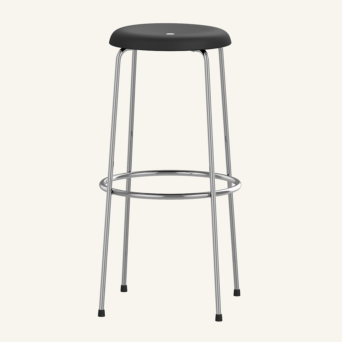 Sæde i plast (sort). 4-bensstel i metal (krom).