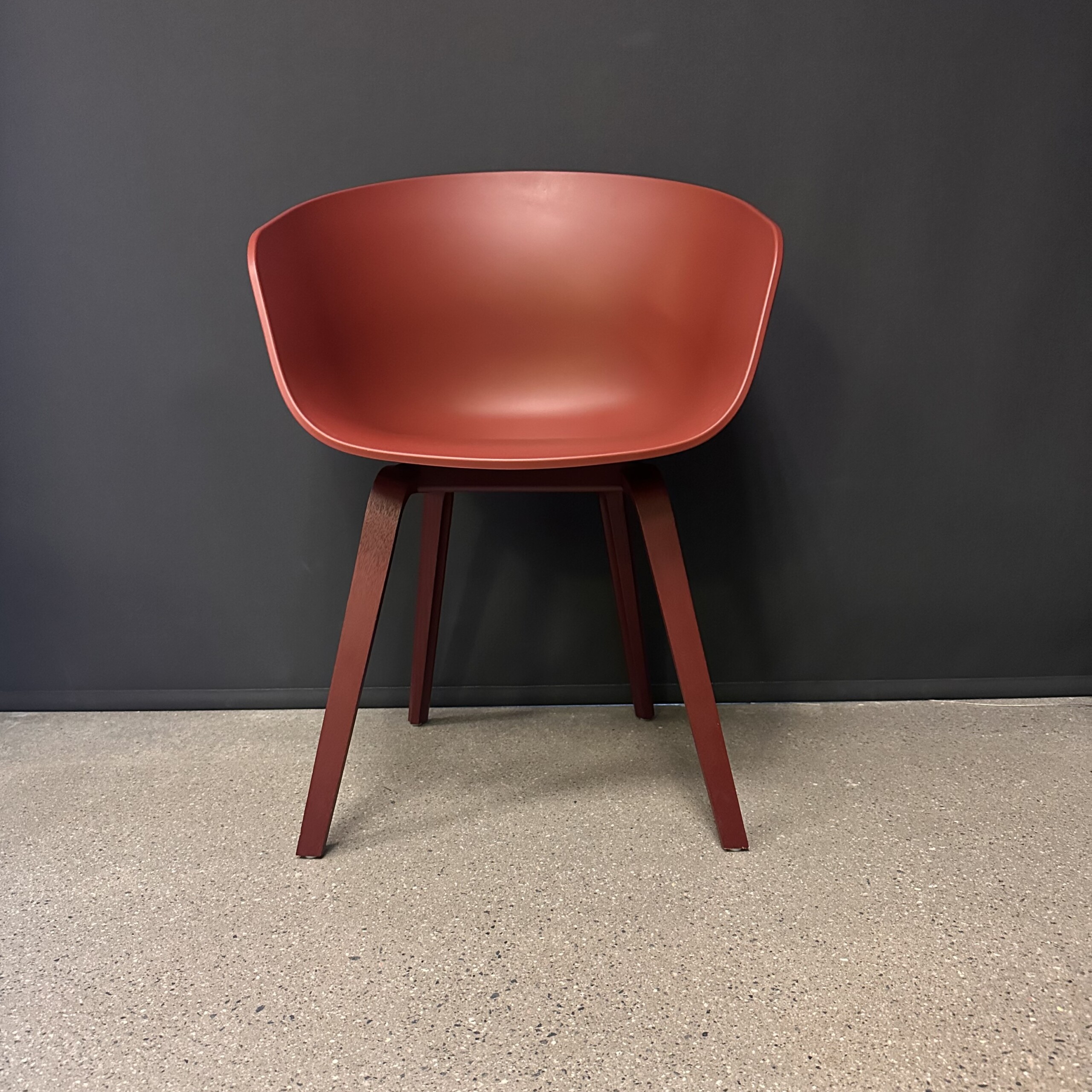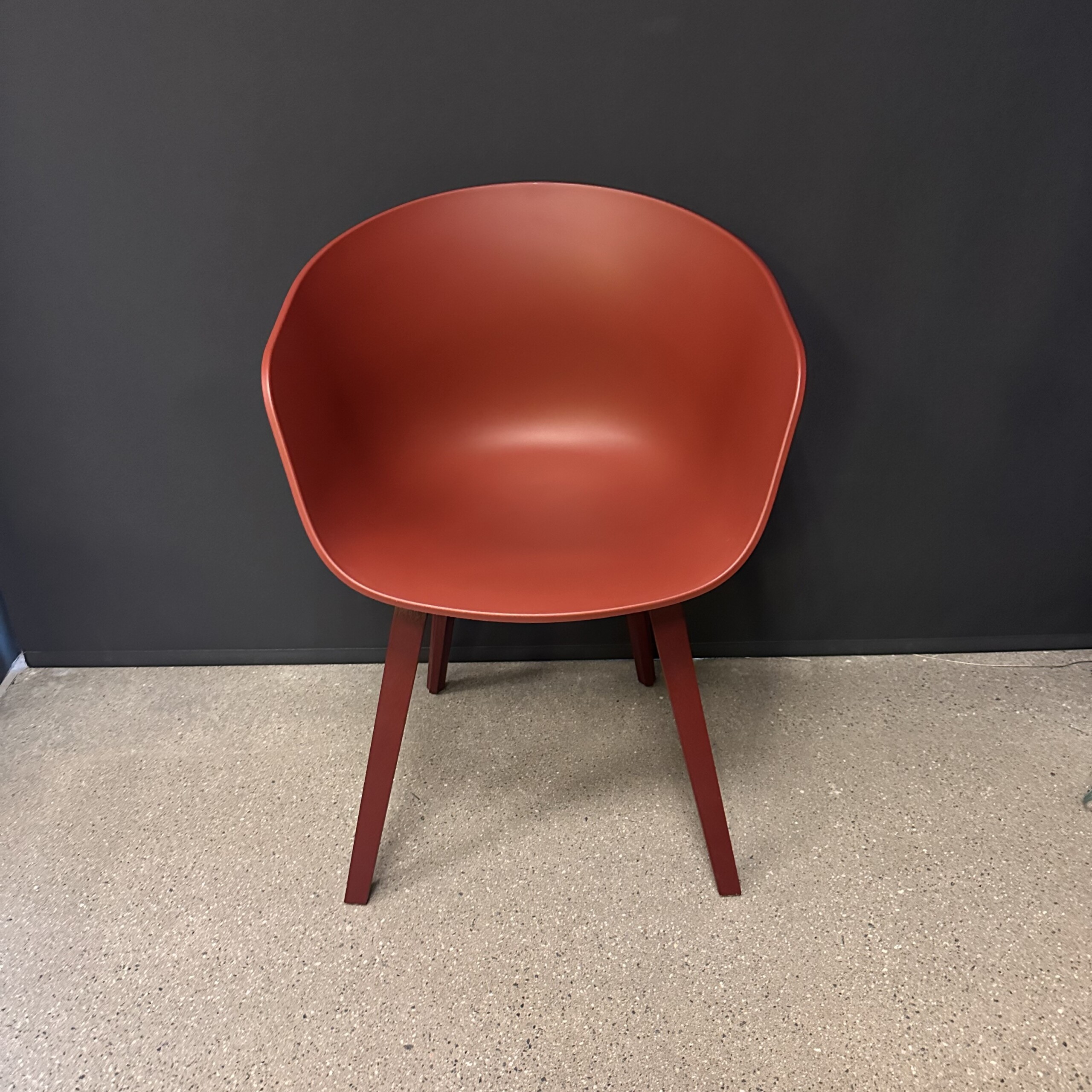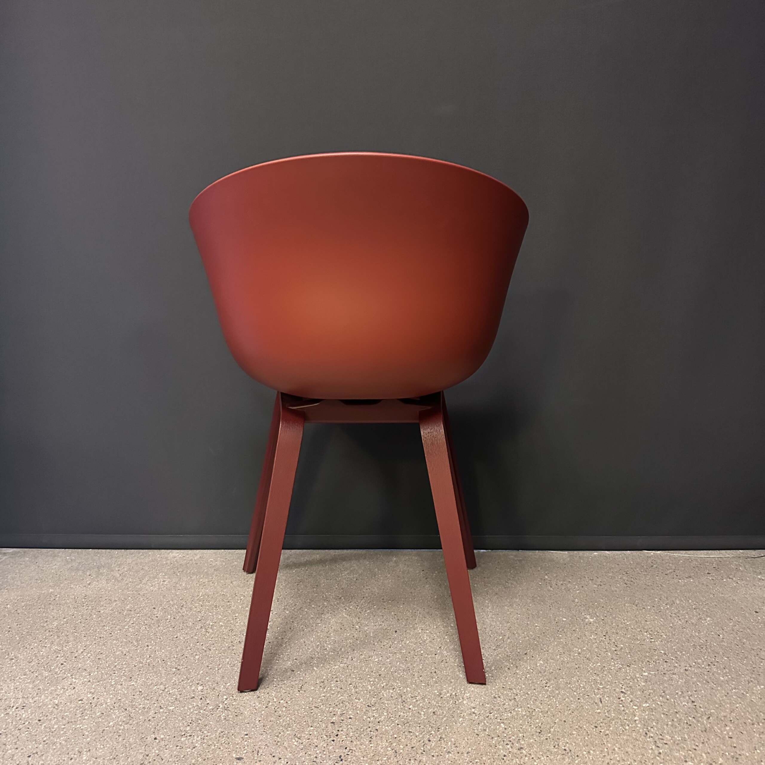 Sæde og ryg i plast (rød). 4-bensstel i træ (rød).