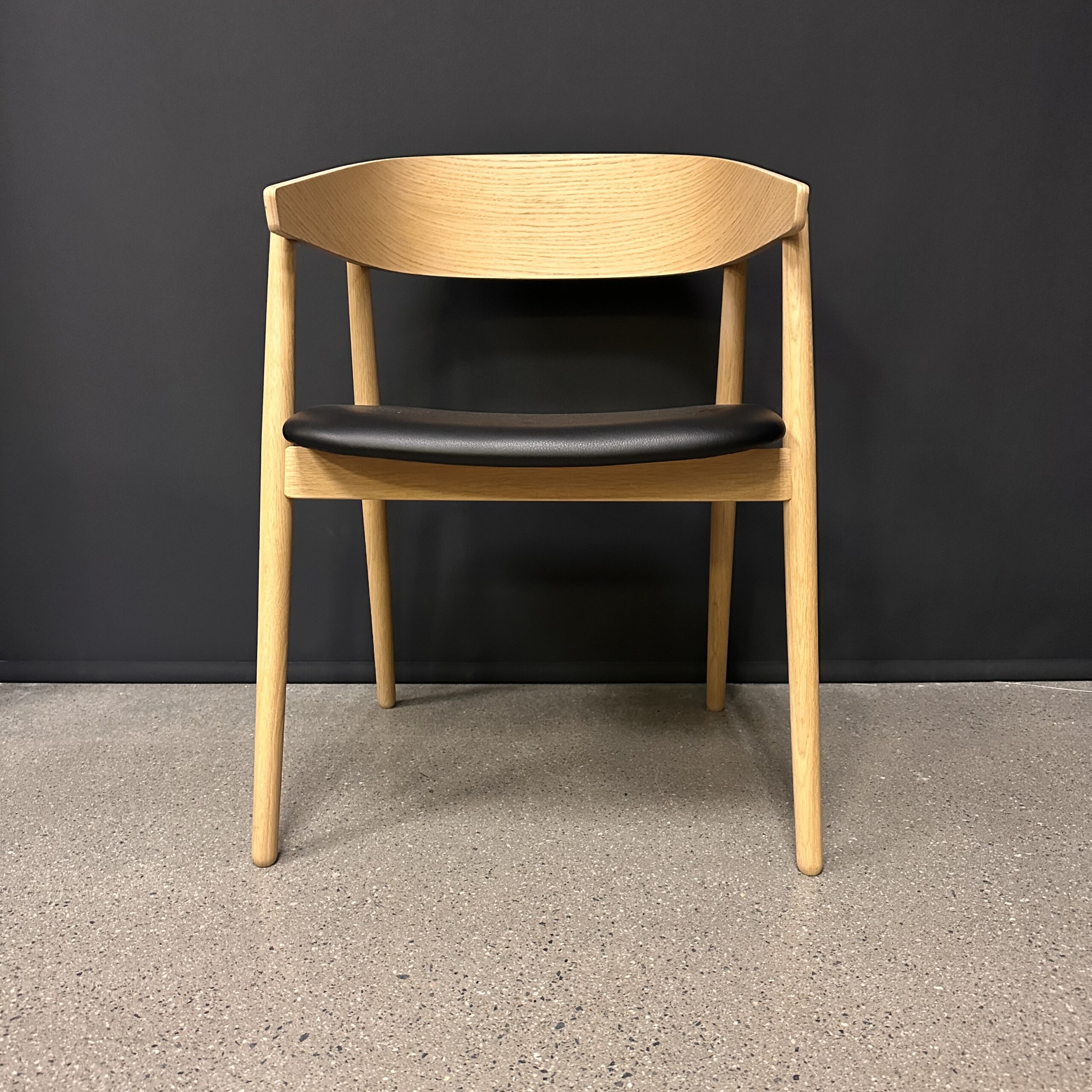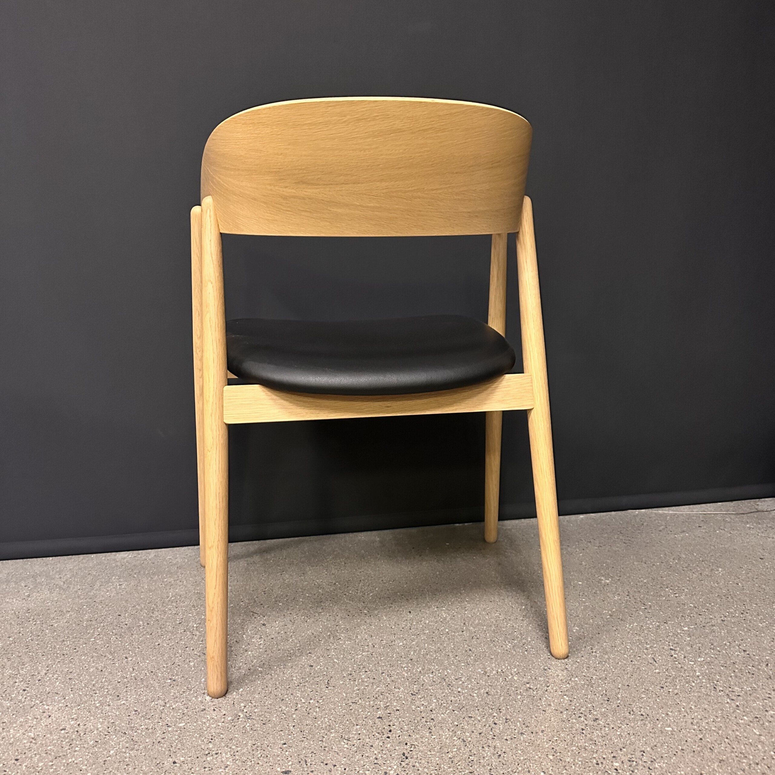 Sæde i læder (sort). Ryg i træ (eg). 4-bensstel i træ (eg).