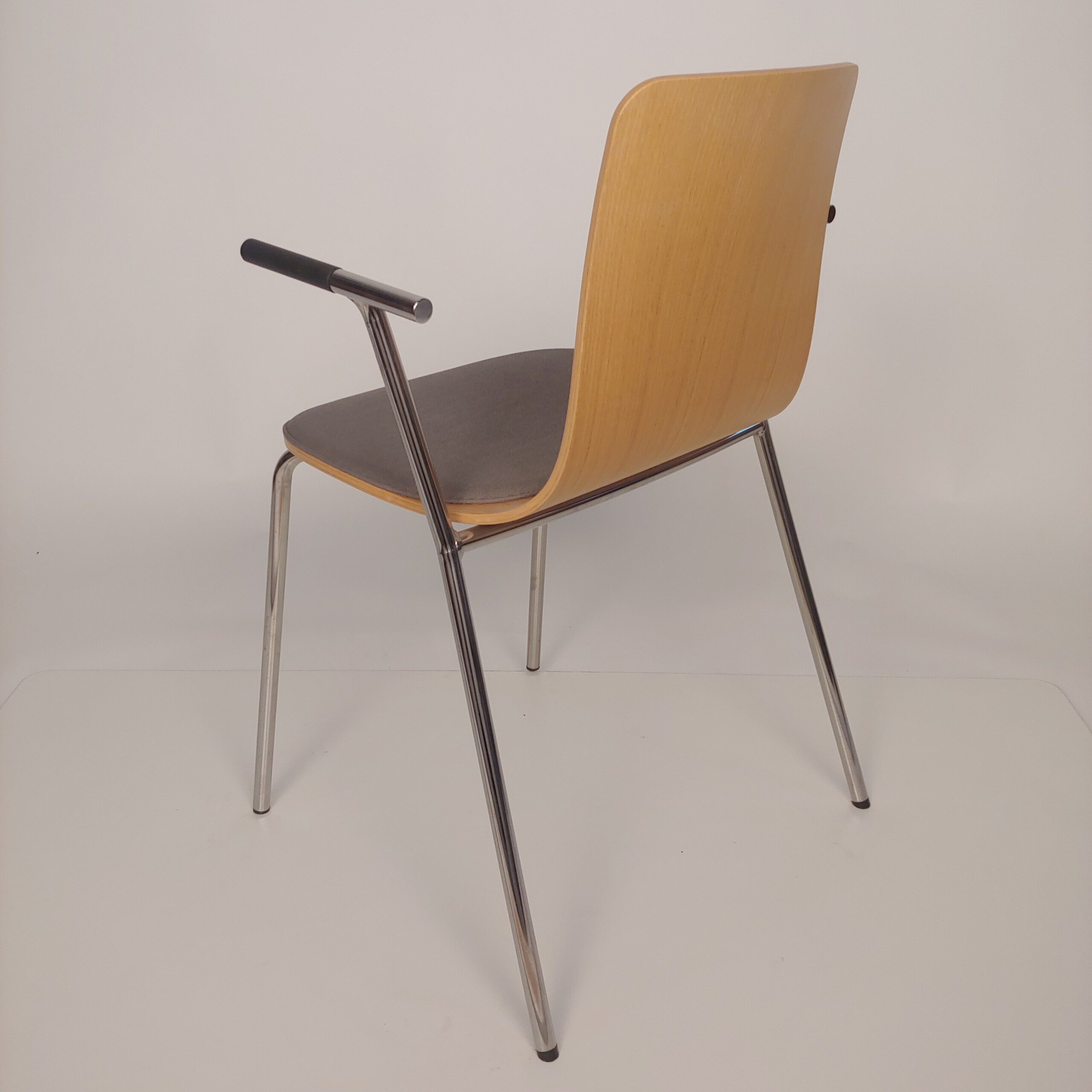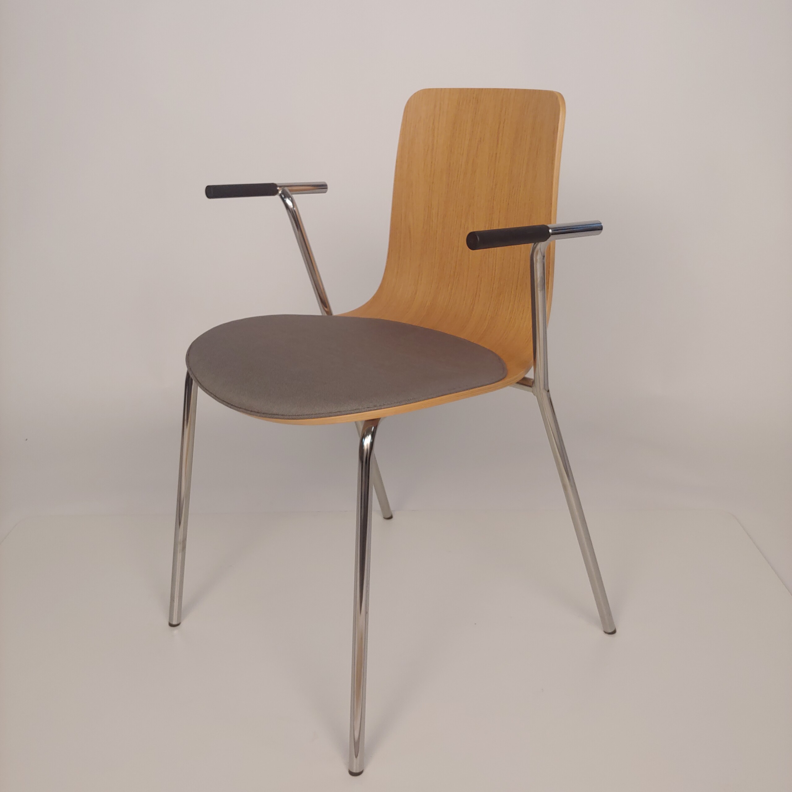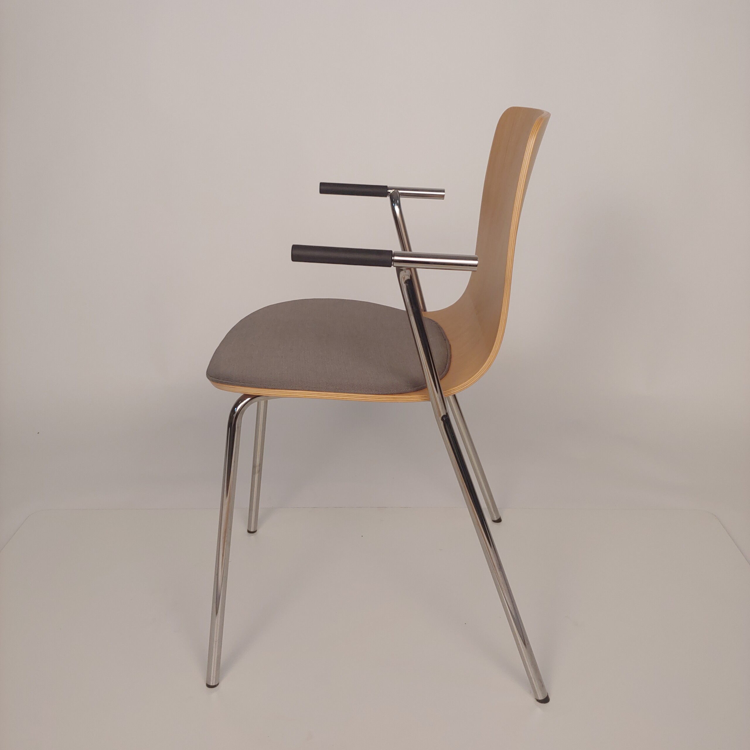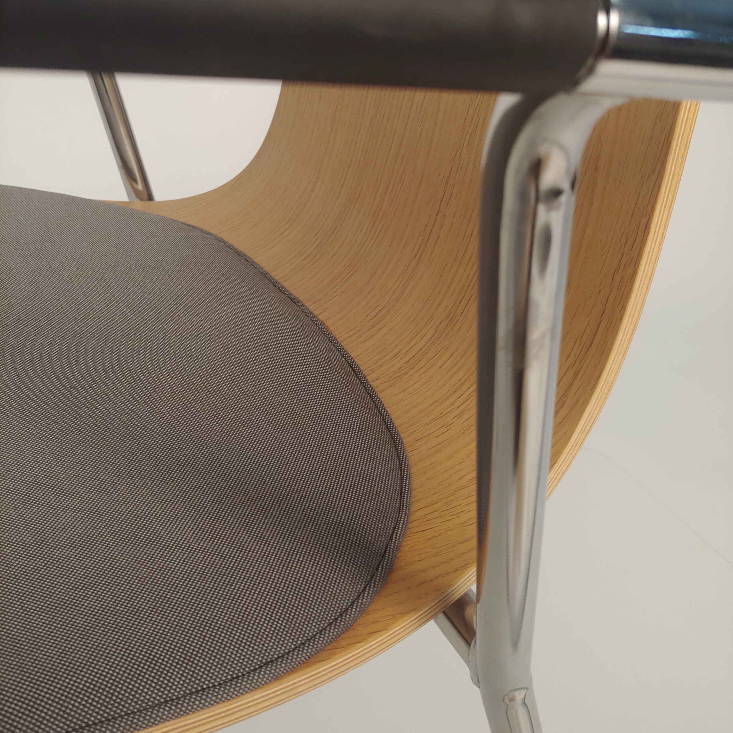 Sæde i stof (grå). Ryg i træ (eg). 4-bensstel i metal (krom).