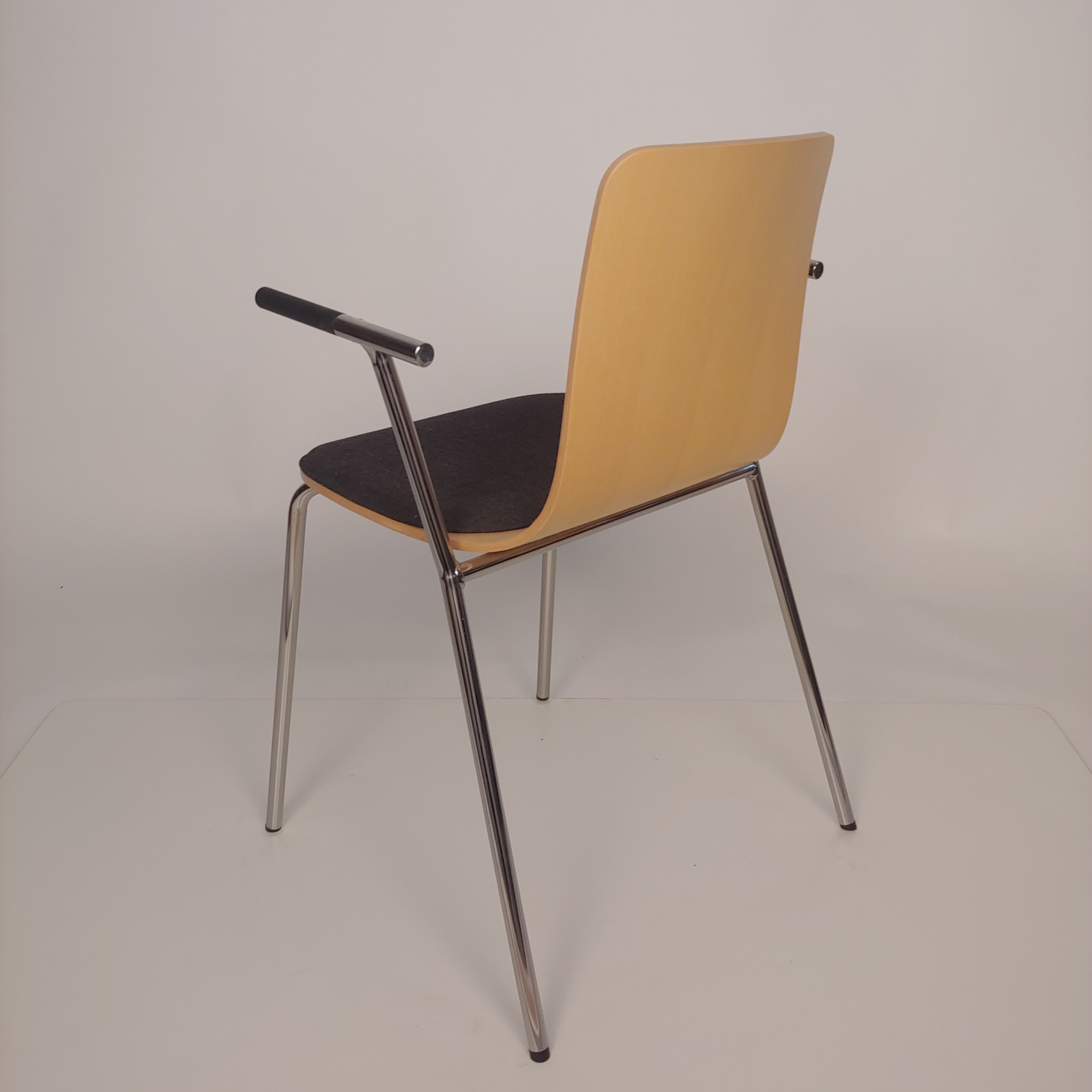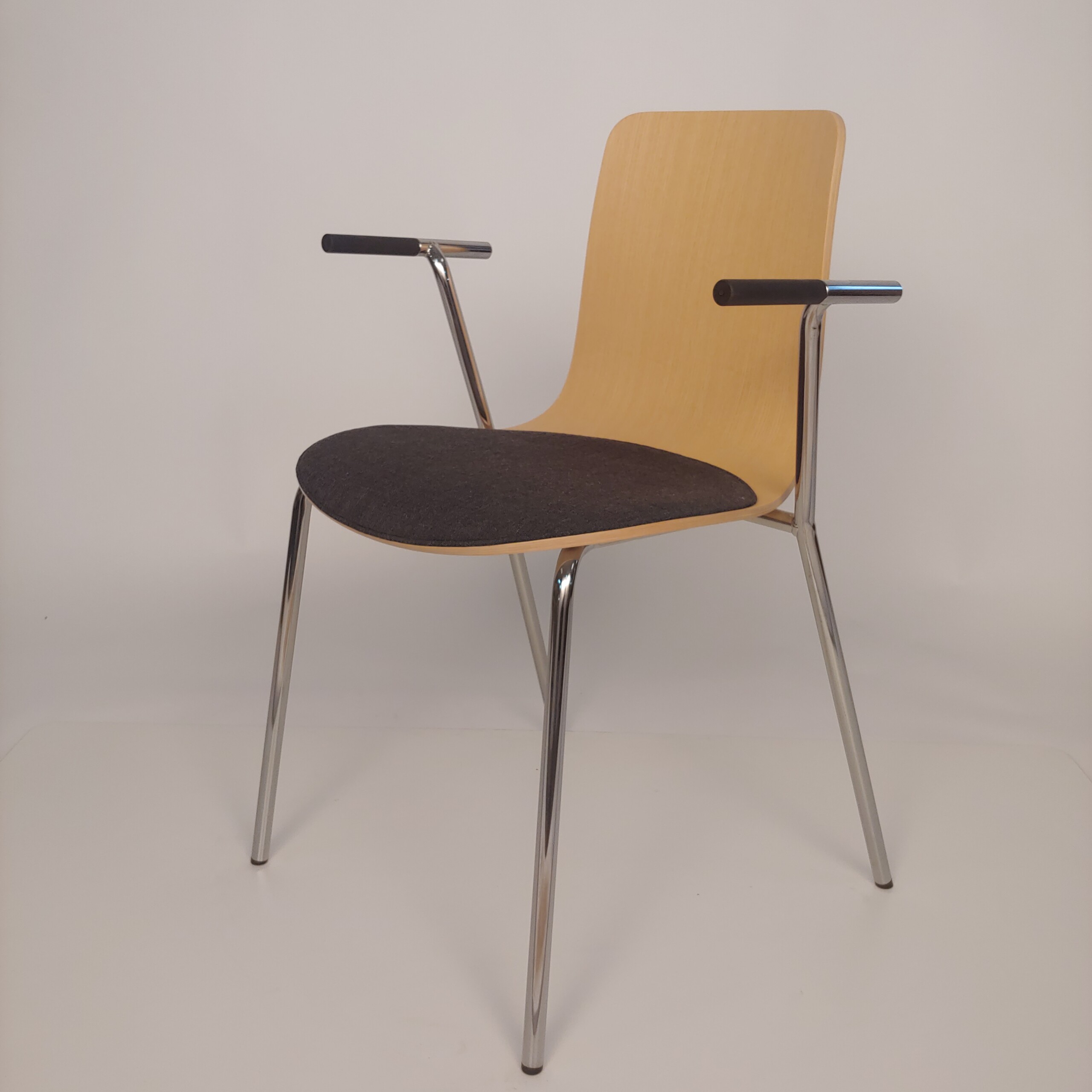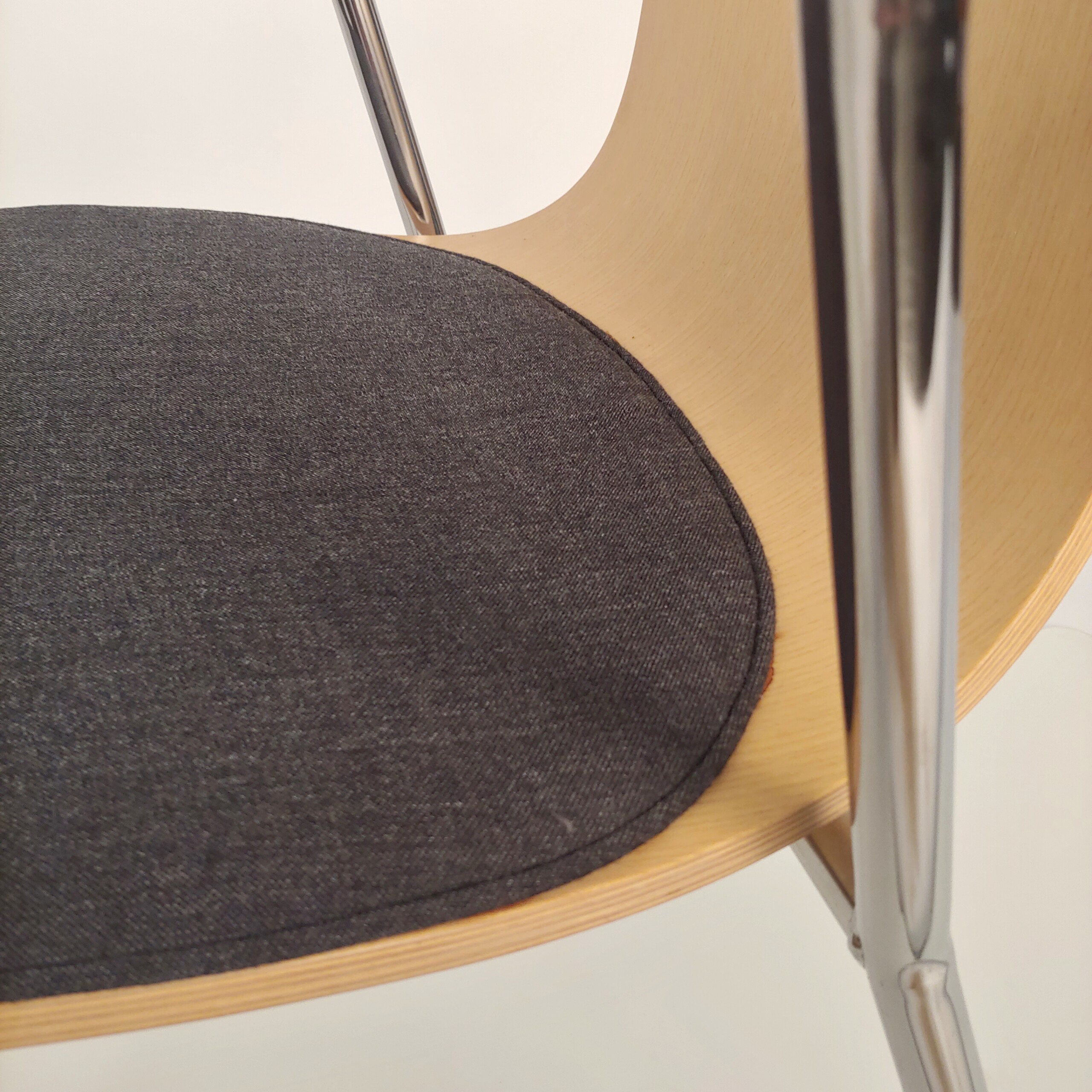 Sæde i stof (grå). Ryg i træ (eg). 4-bensstel i metal (krom).