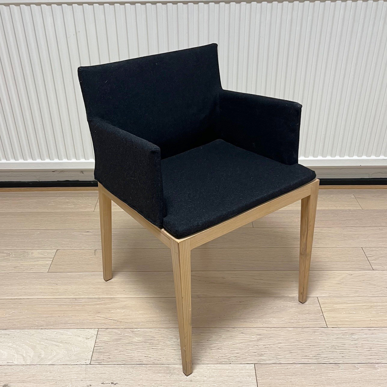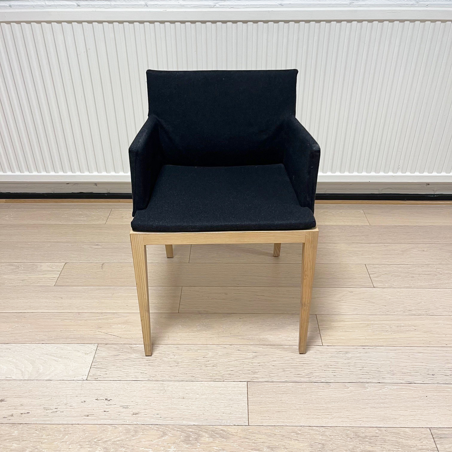 Sæde og ryg i stof (grå). 4-bensstel i træ (ask).