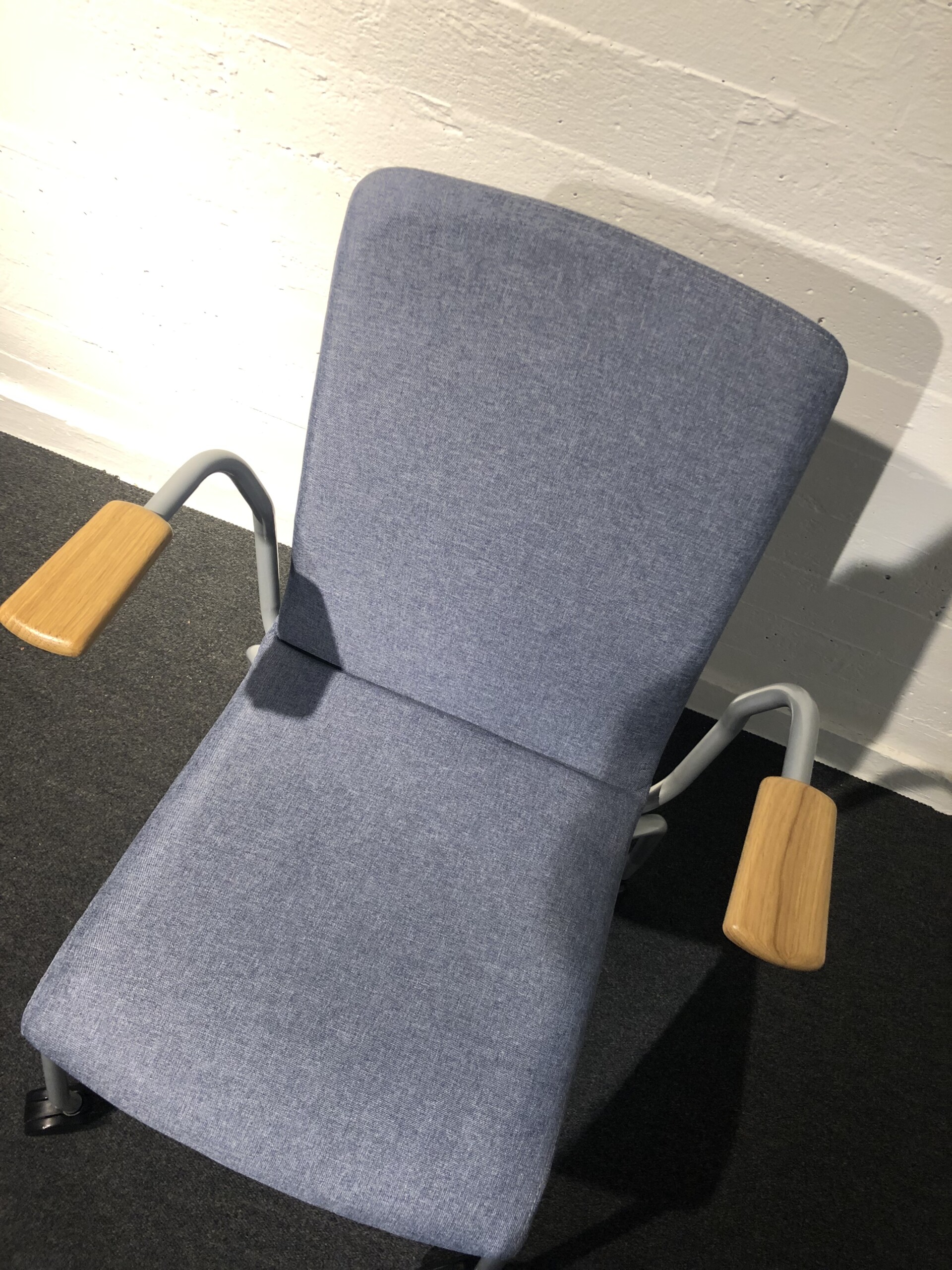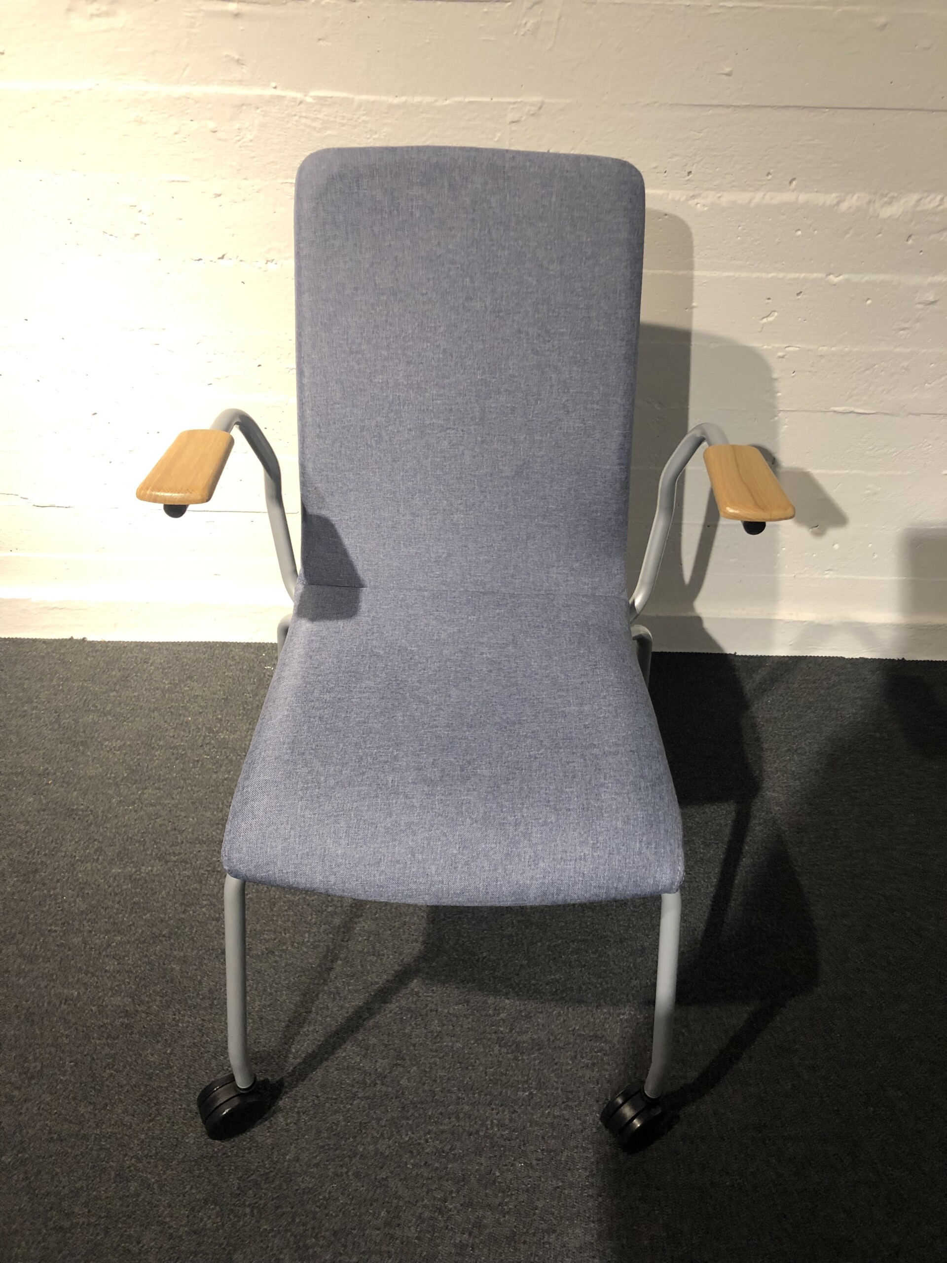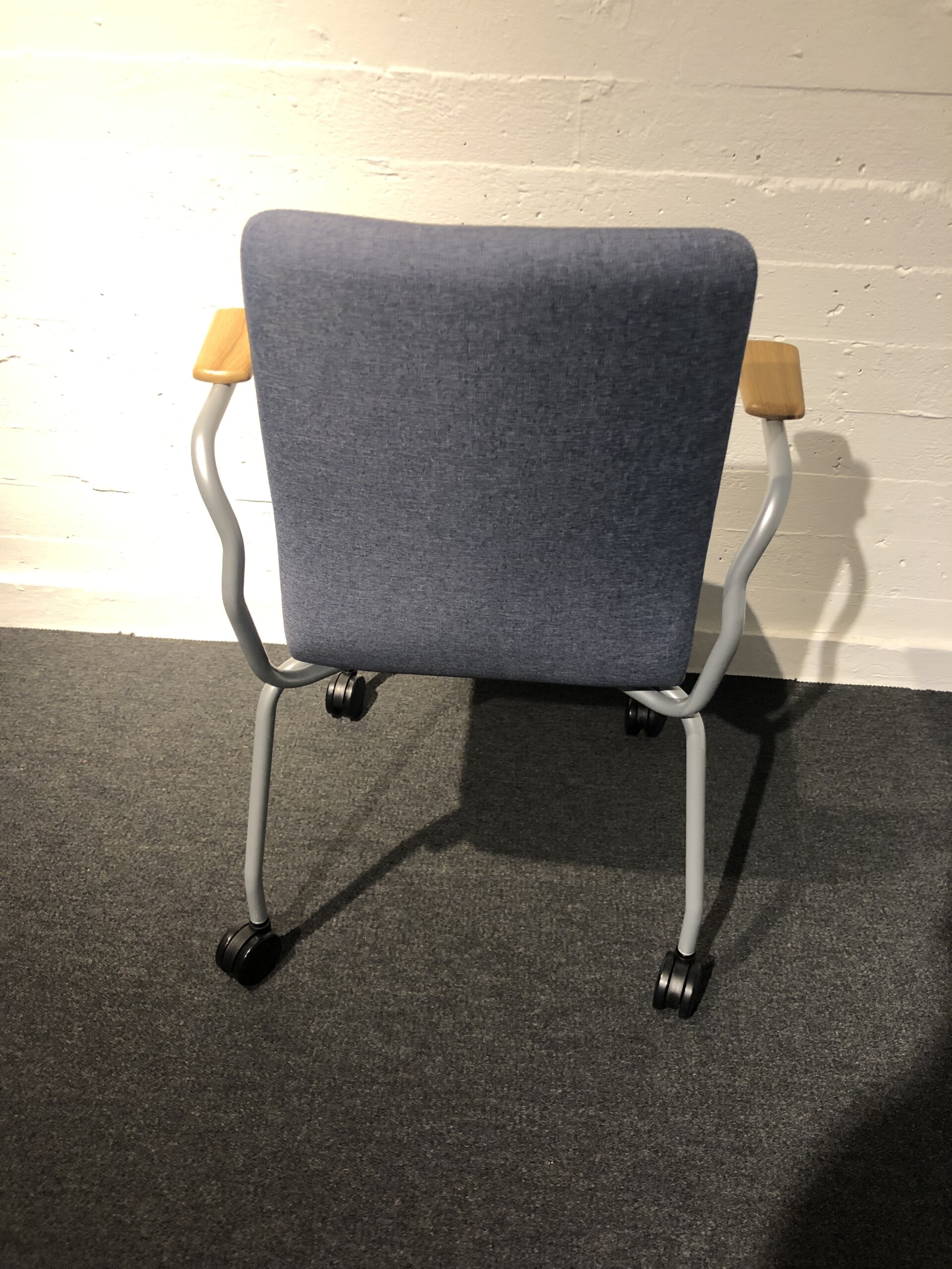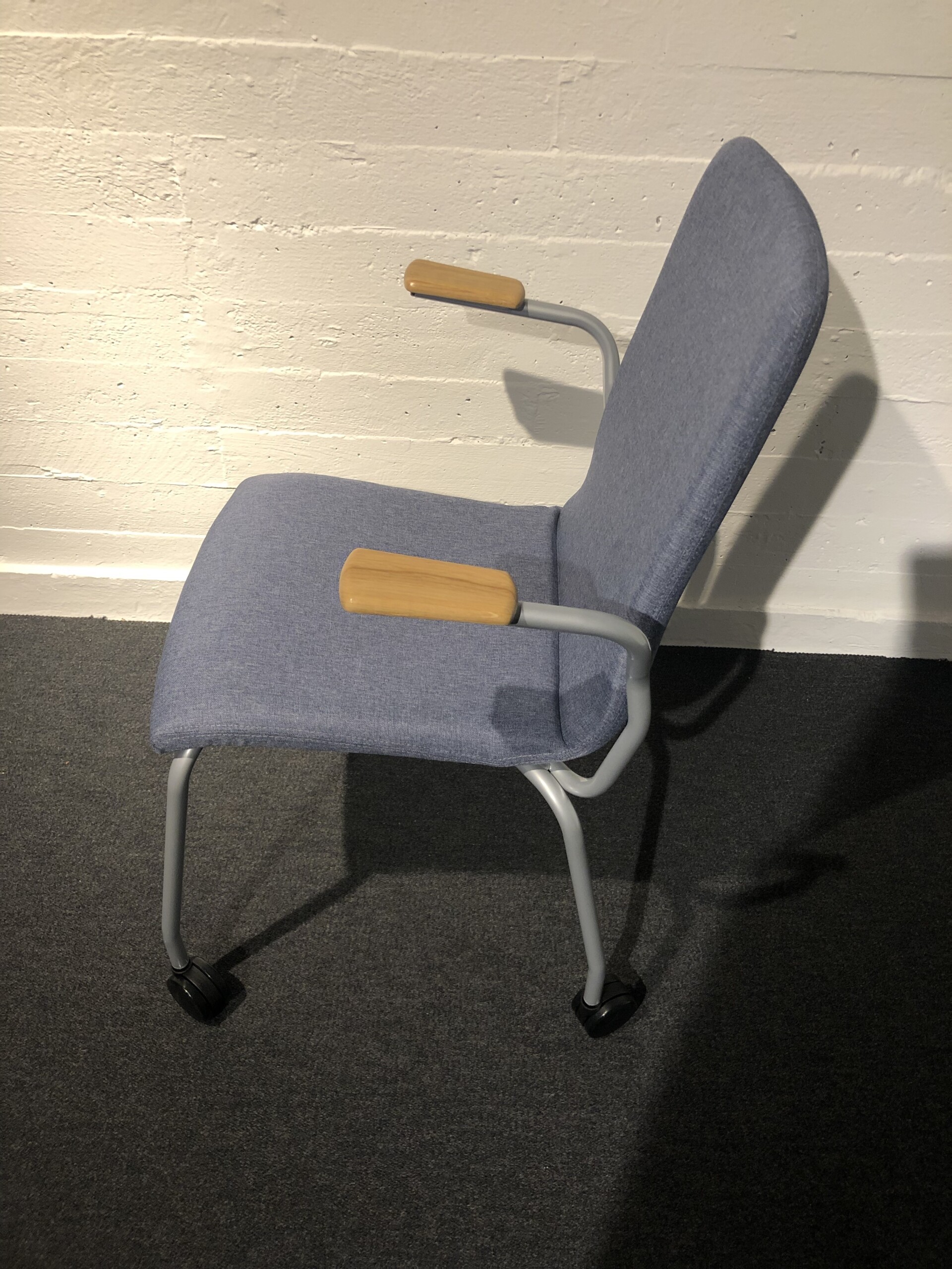 Sæde og ryg i stof (blå). 4-bensstel i metal (sølv).