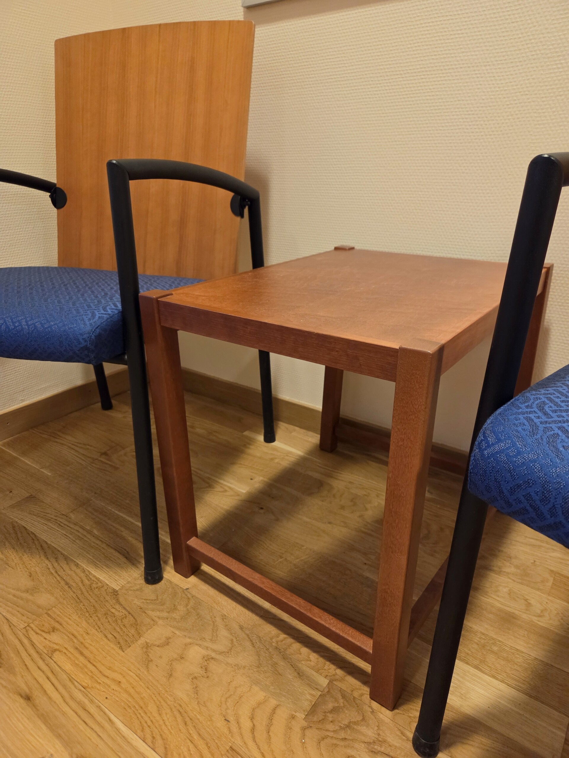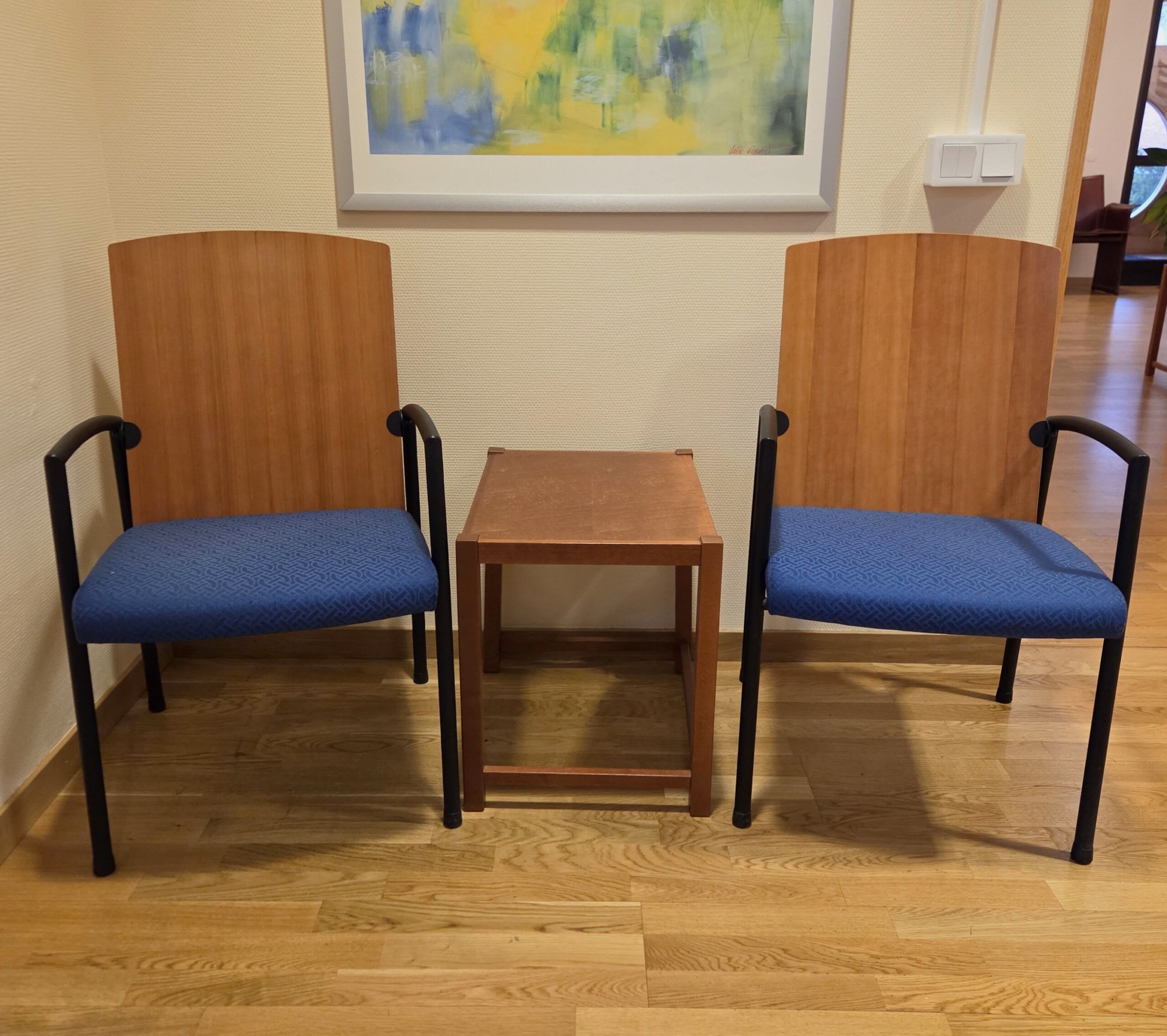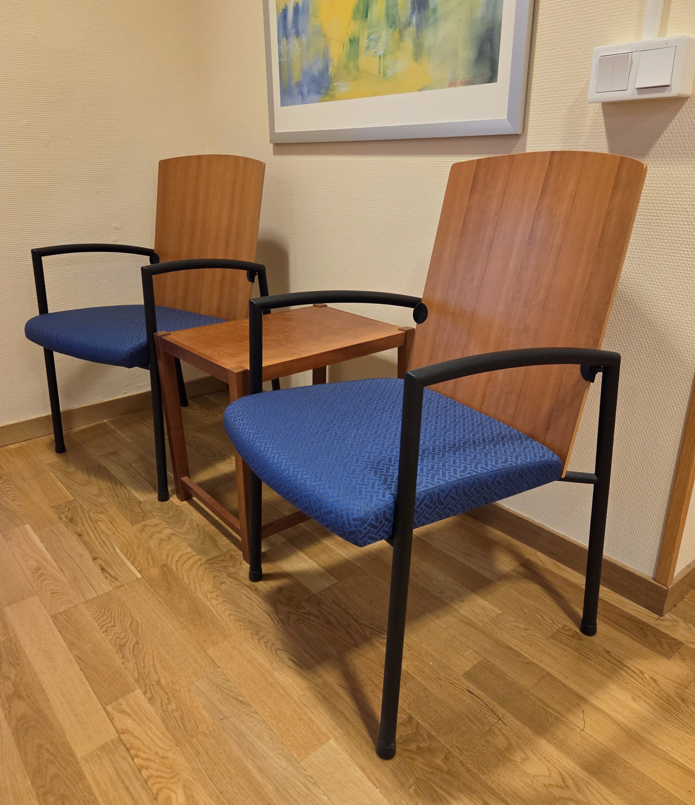 Sæde i stof (blå). Ryg i træ. 4-bensstel i metal (sort).