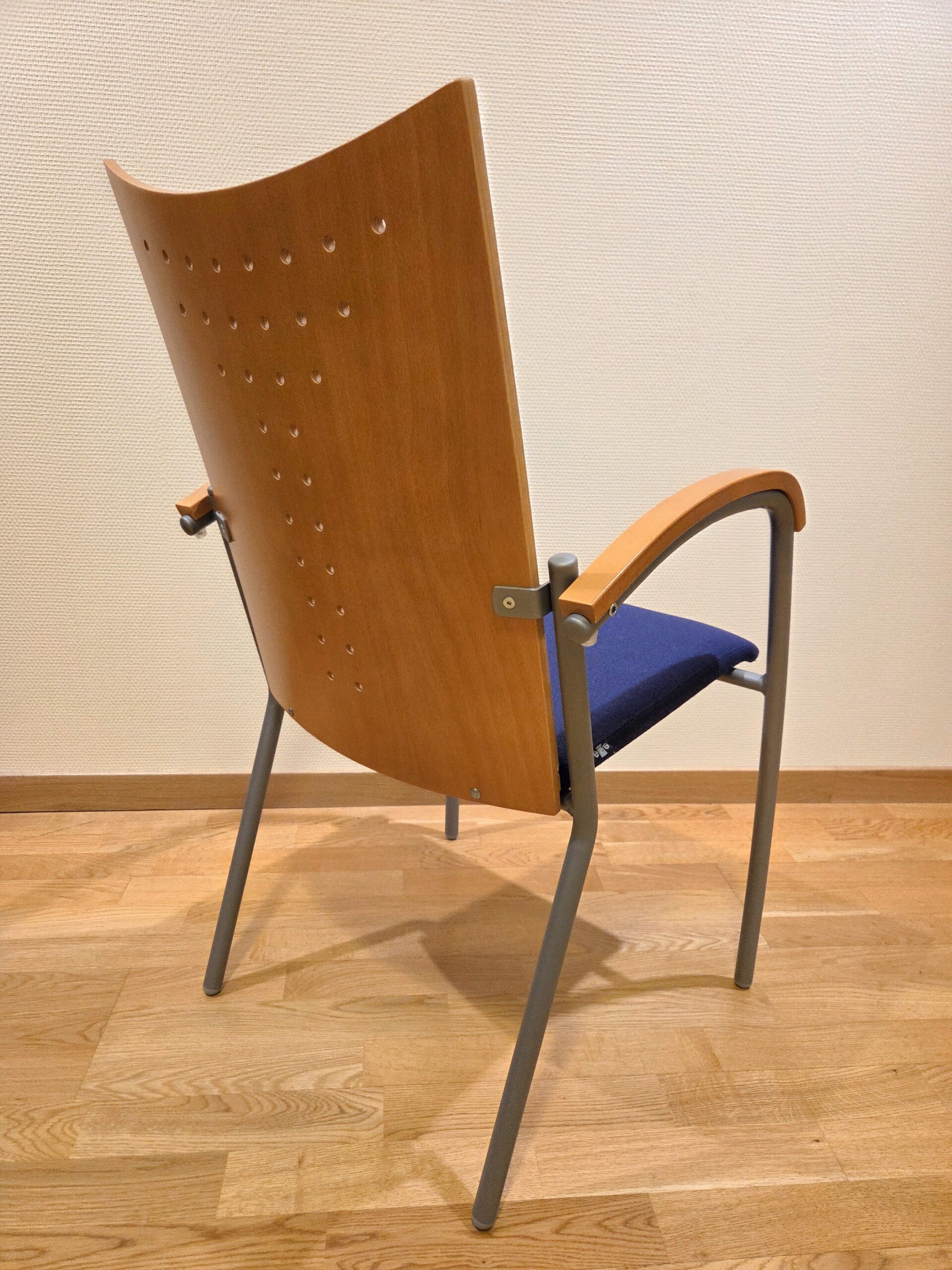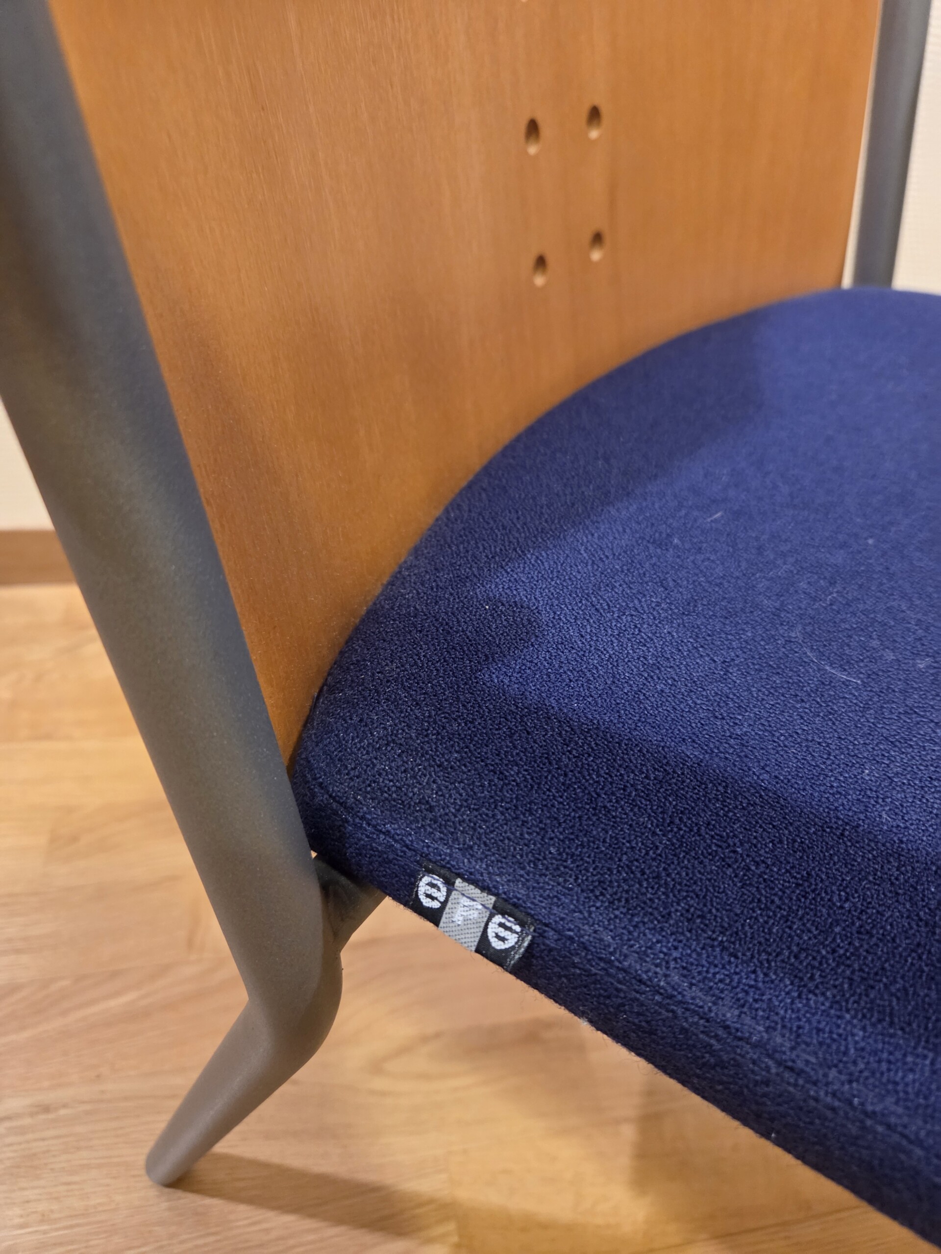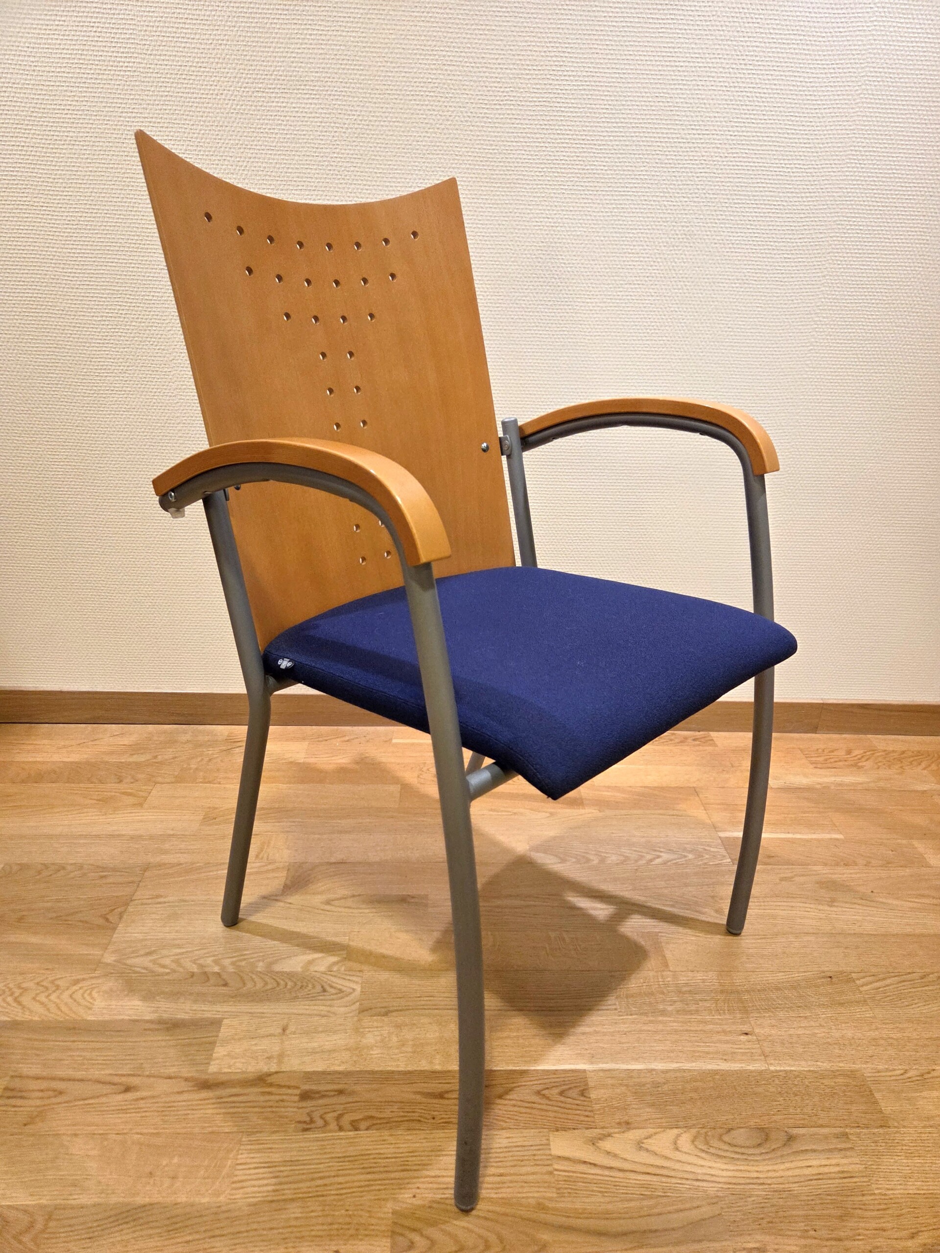 Sæde i stof (blå). Ryg i laminat. 4-bensstel i metal (grå).
