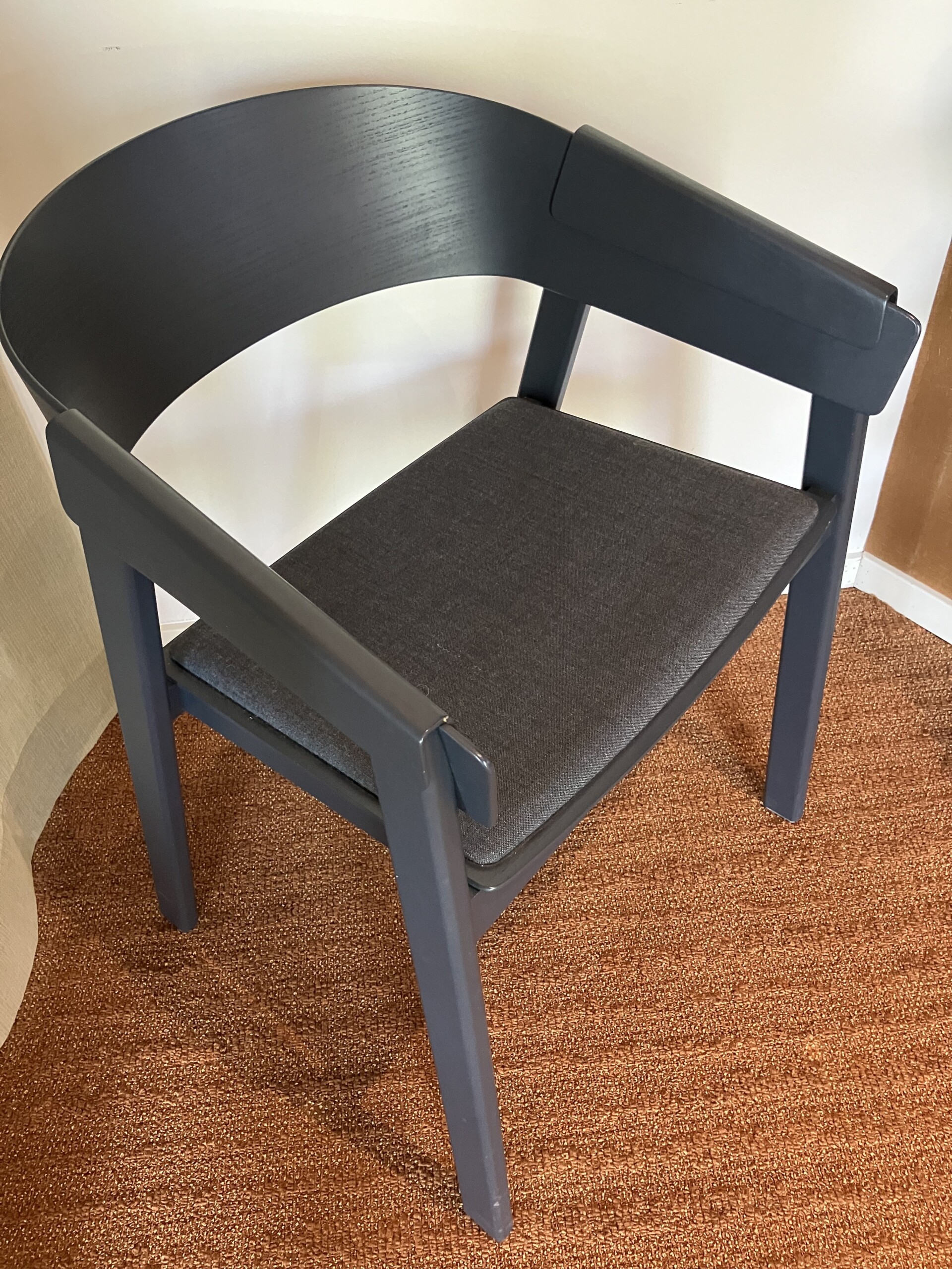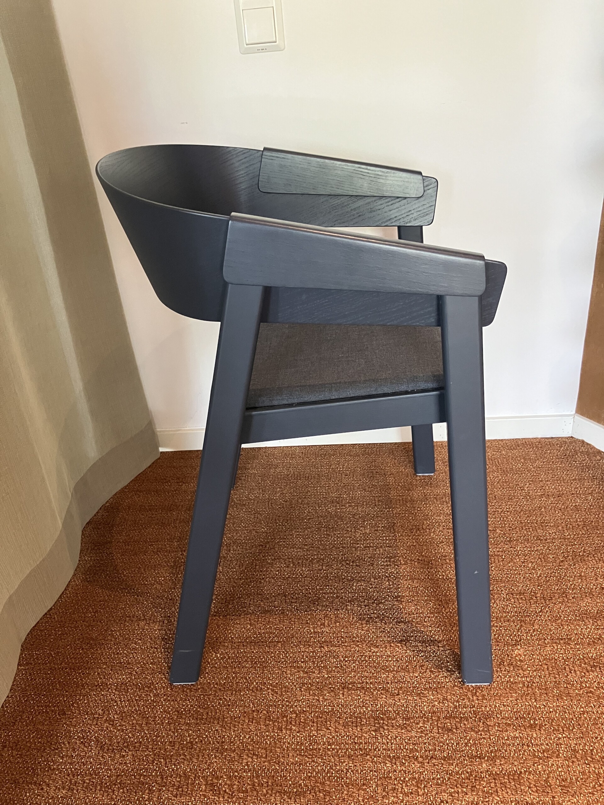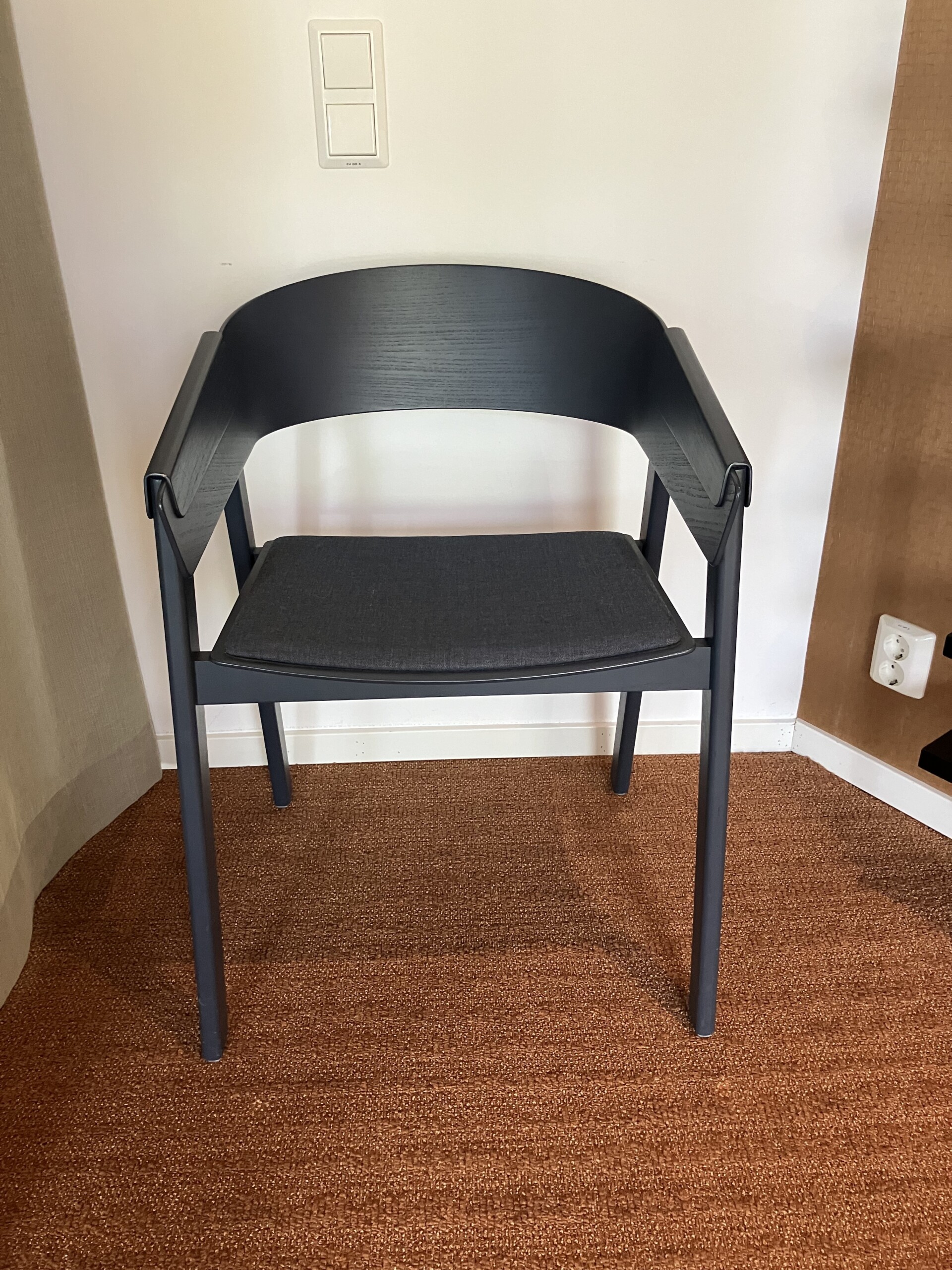 Sæde i stof (grå). Ryg i træ (grå). 4-bensstel i træ (grå).