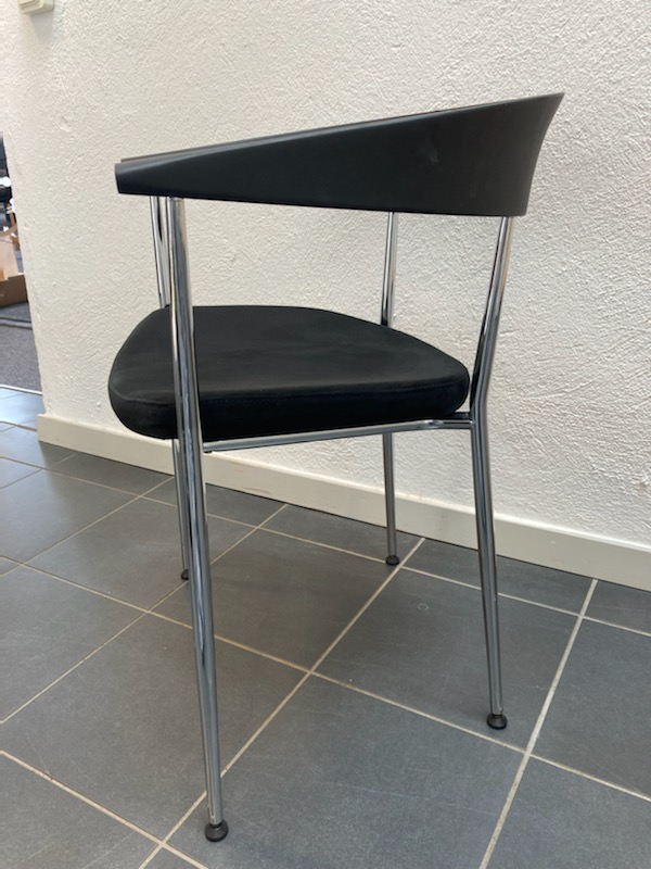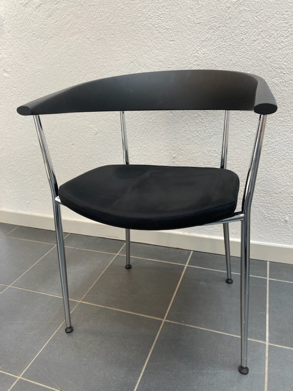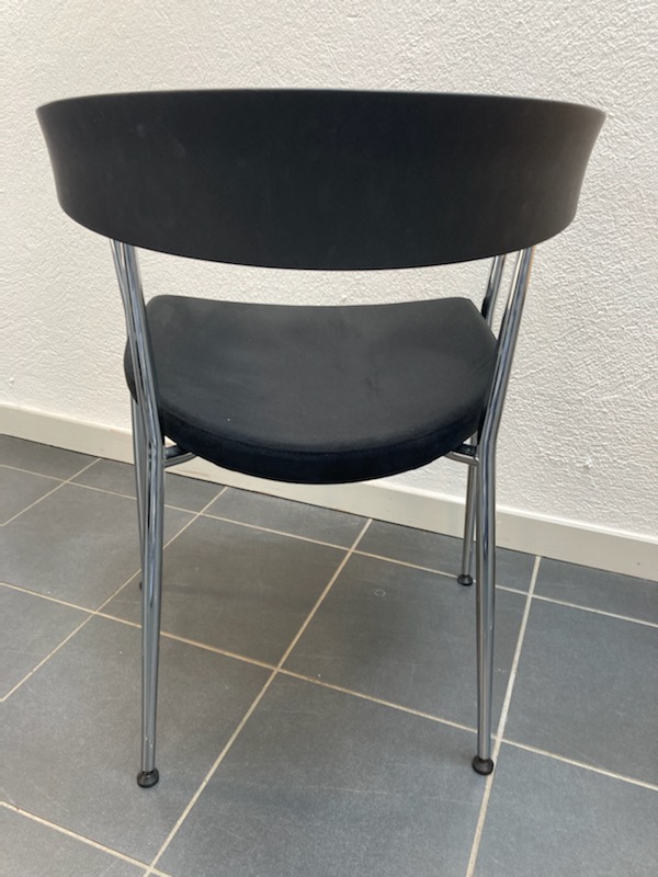 Sæde og ryg i stof (sort). 4-bensstel i metal (aluminium).
