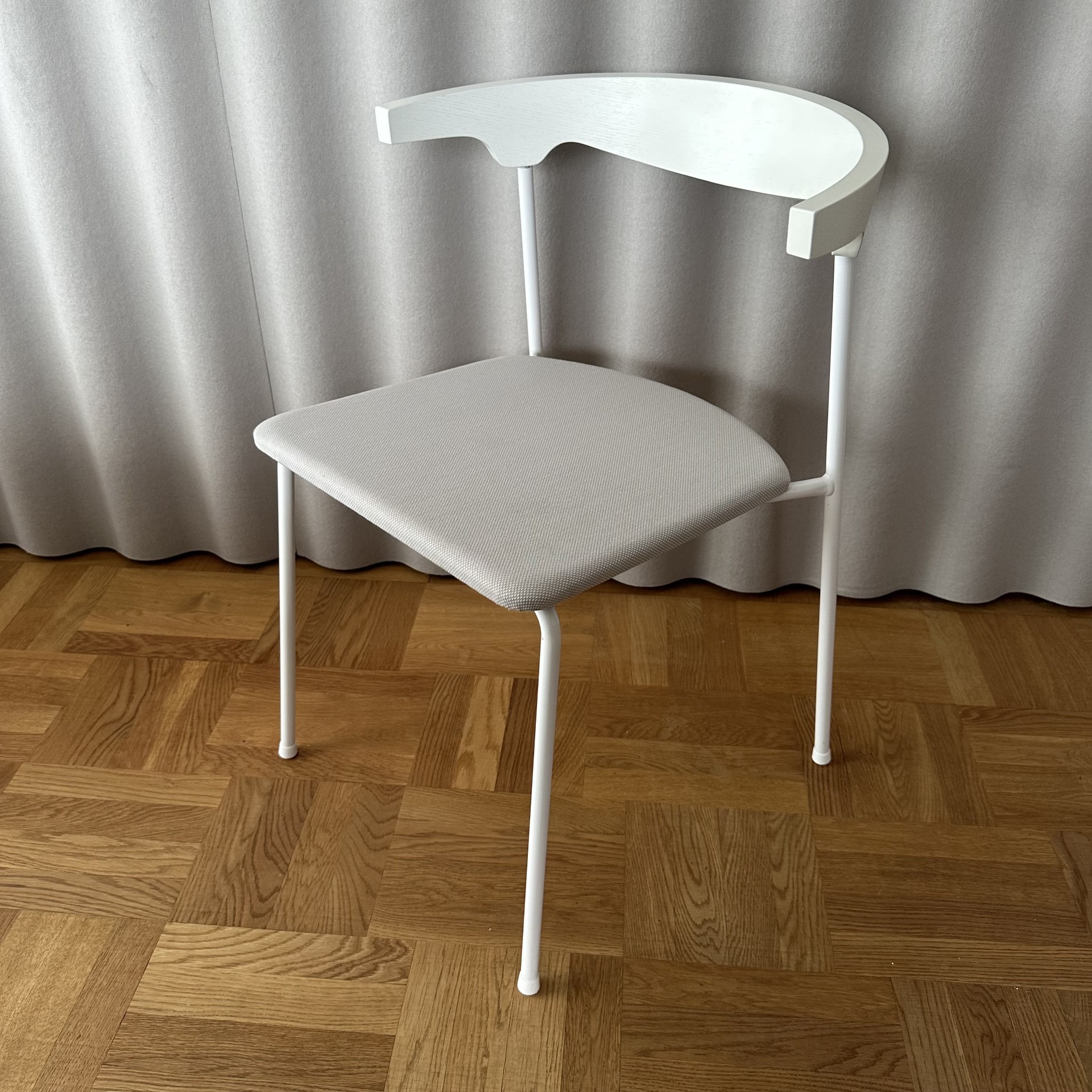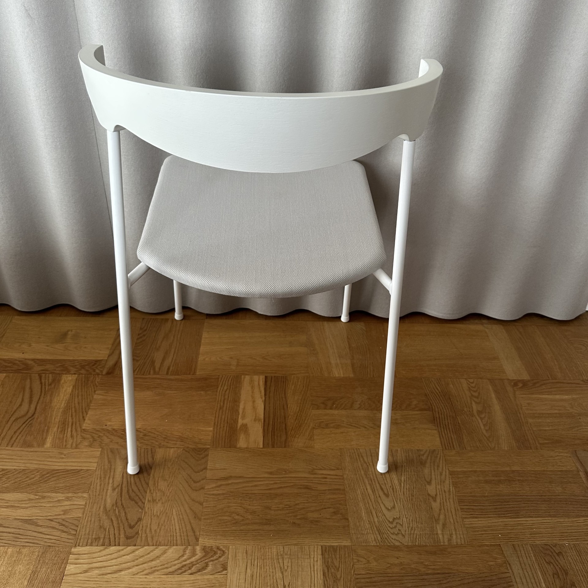 Sæde i stof (grå). Ryg i træ (hvid). 4-bensstel i metal (hvid).