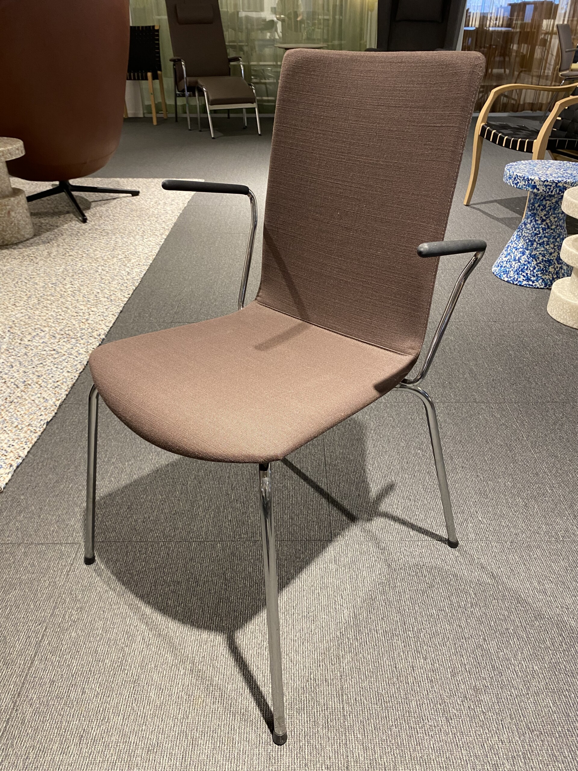 Sæde og ryg i stof (rød). 4-bensstel i metal (sølv).