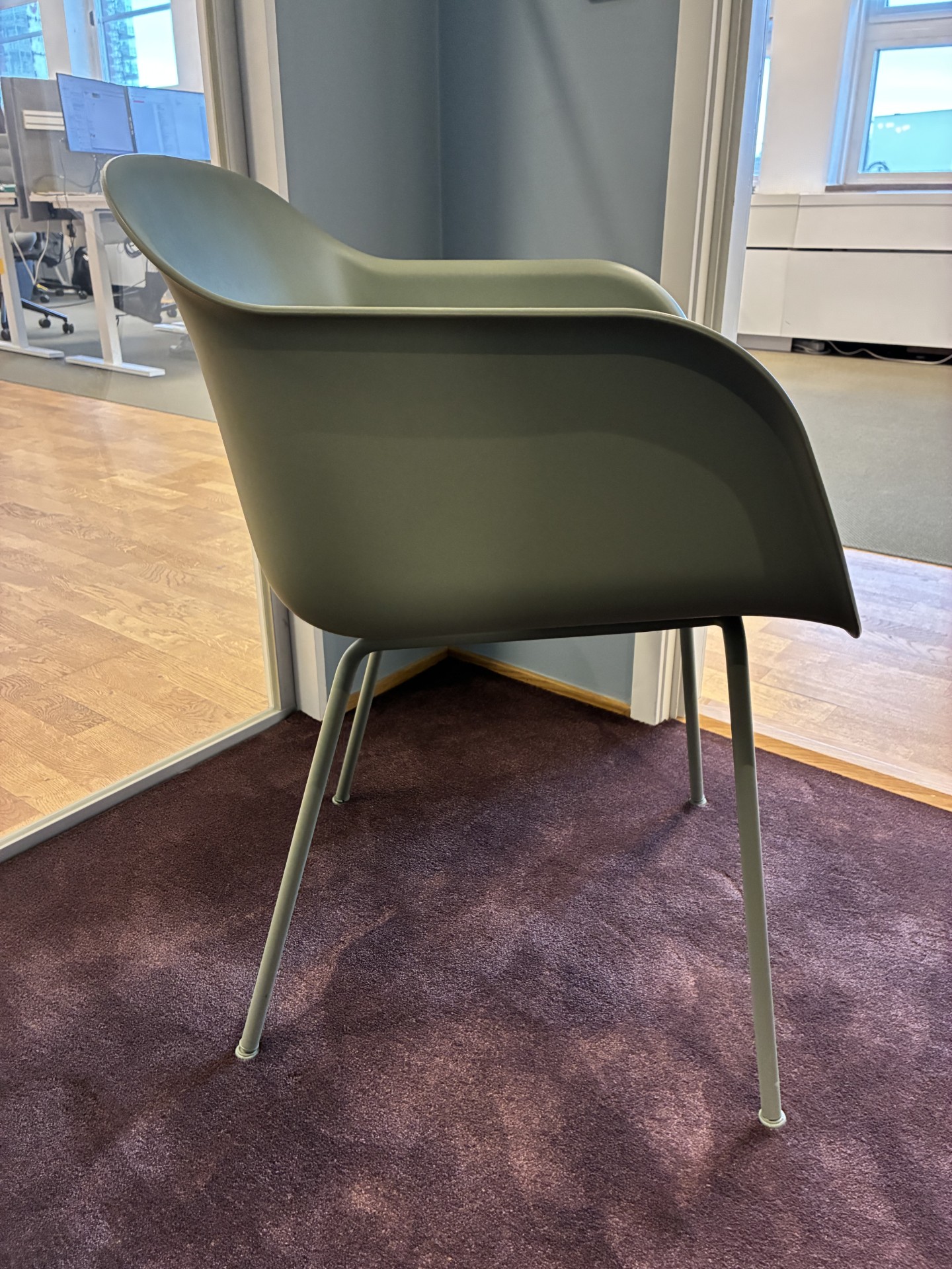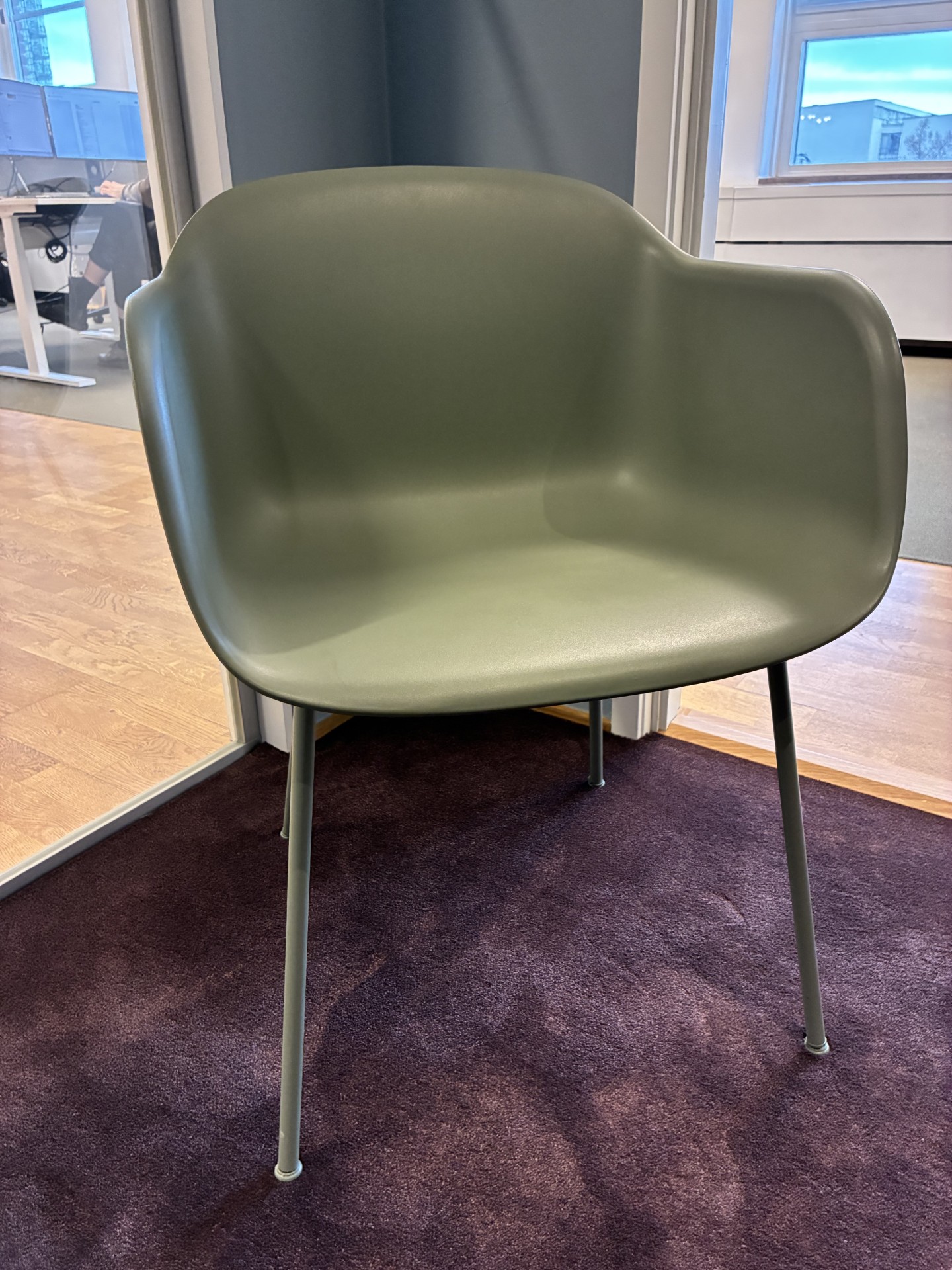 Sæde og ryg i plast (grøn). 4-bensstel i metal (grøn).