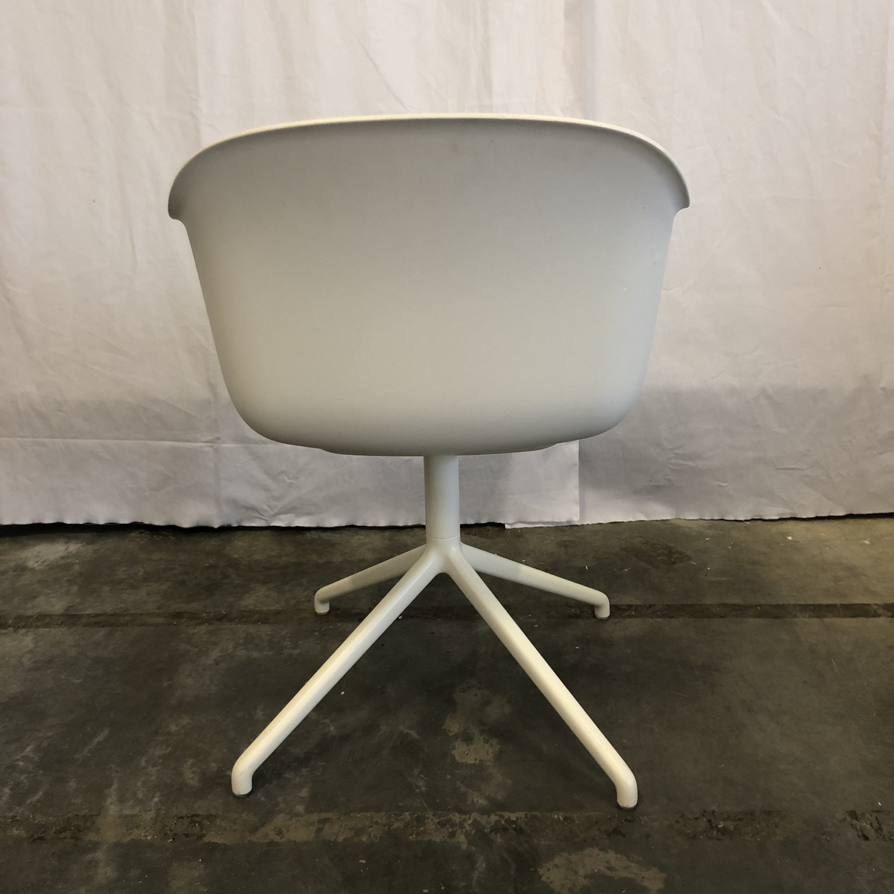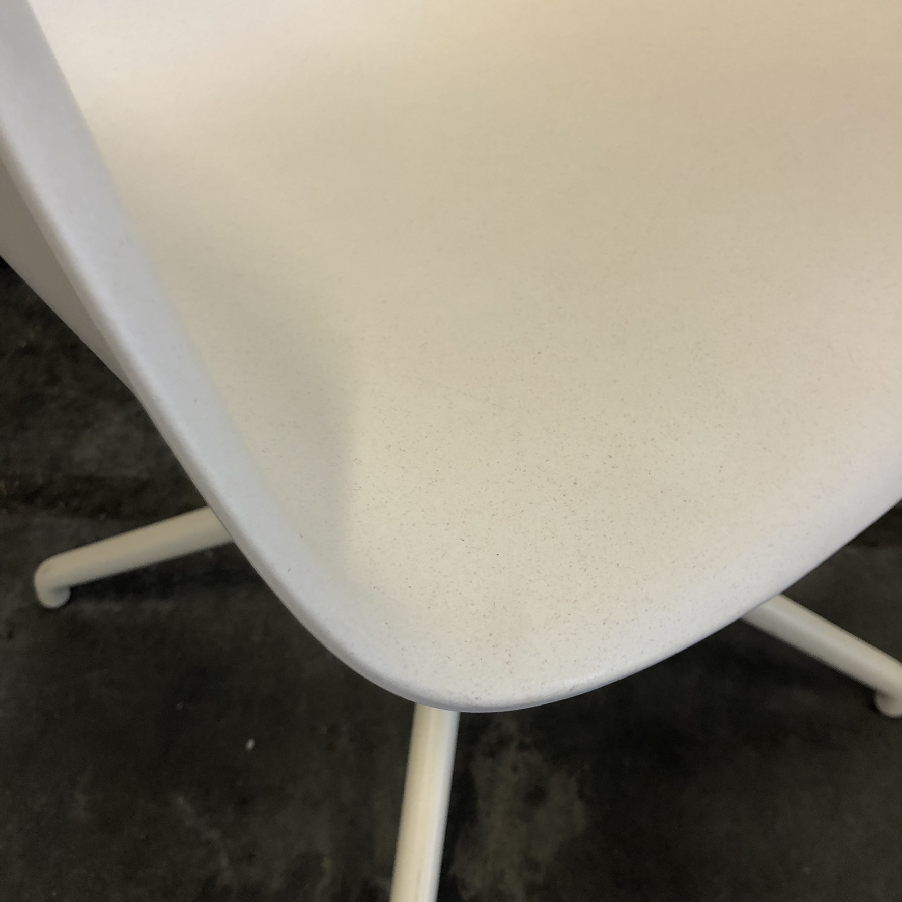 Sæde og ryg i plast (hvid). Fodkryds i metal (hvid).