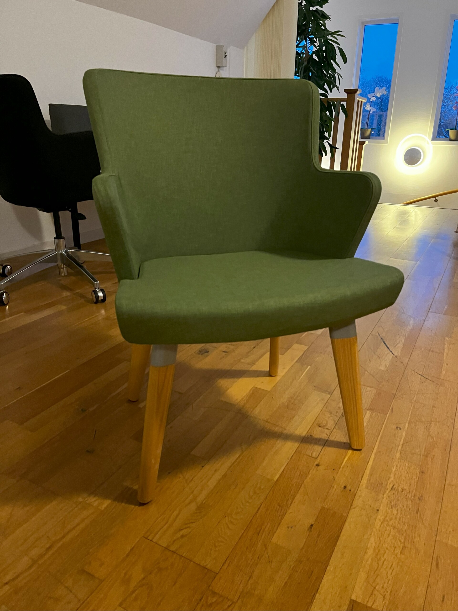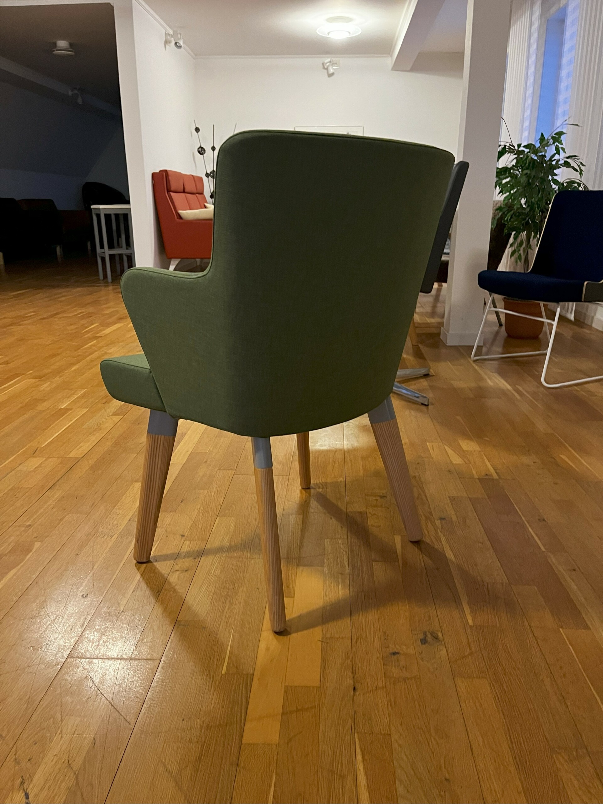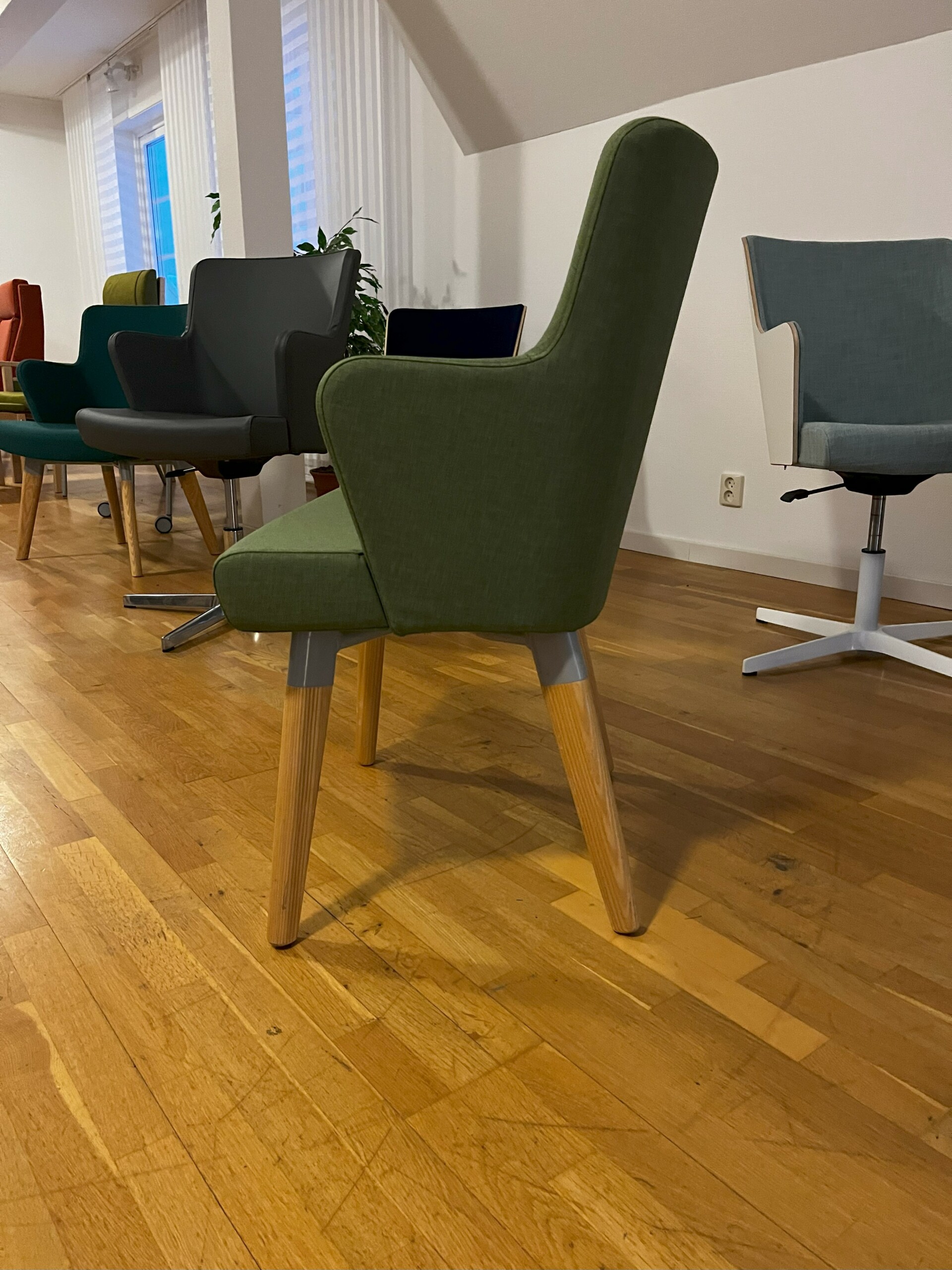 Sæde og ryg i stof (grøn). 4-bensstel i træ (ask).