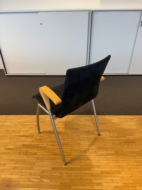 Sæde og ryg i stof (blå). 4-bensstel i metal (grå).