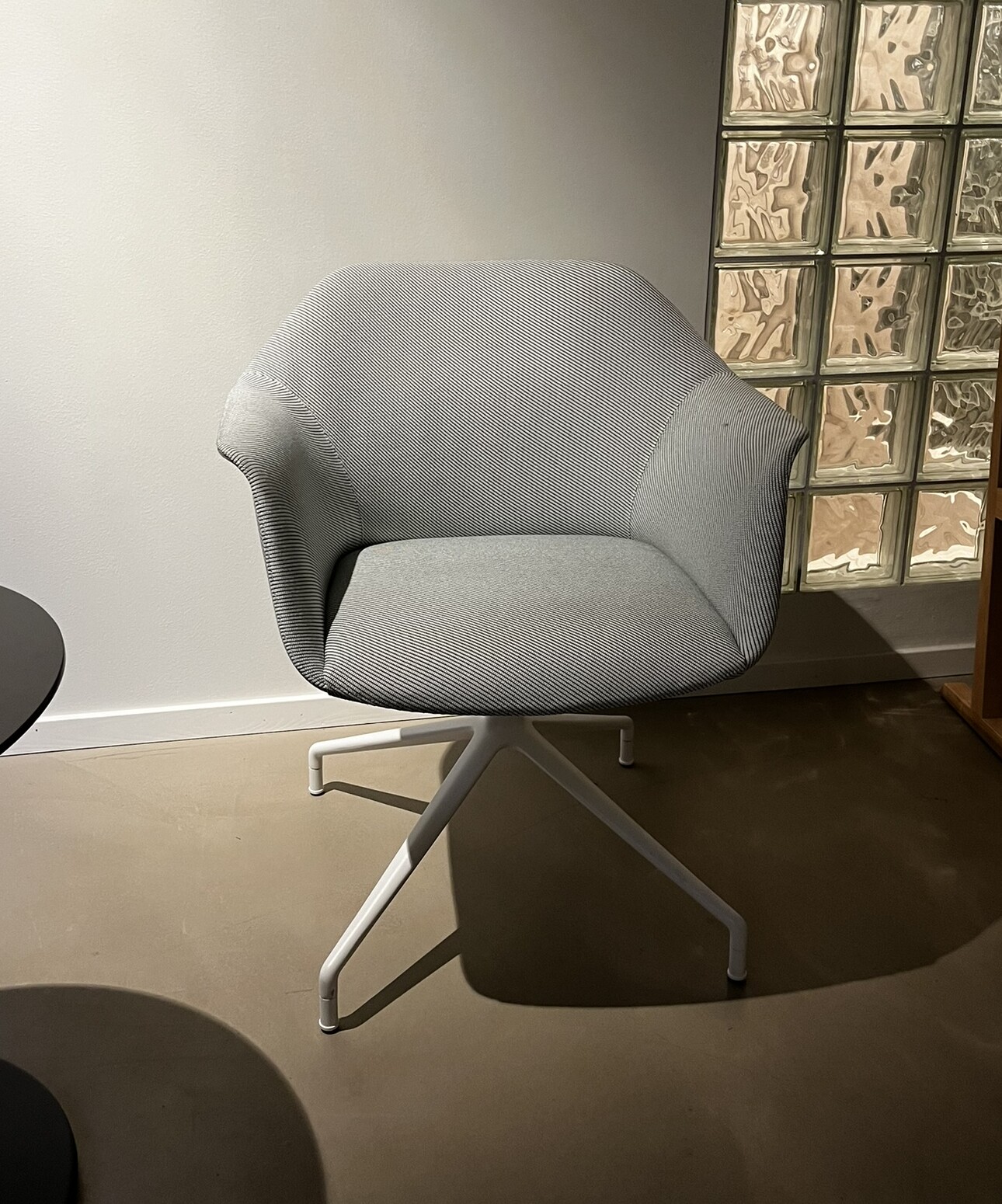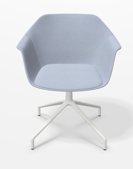 Sæde og ryg i stof (blå). Fodkryds i metal (aluminium).