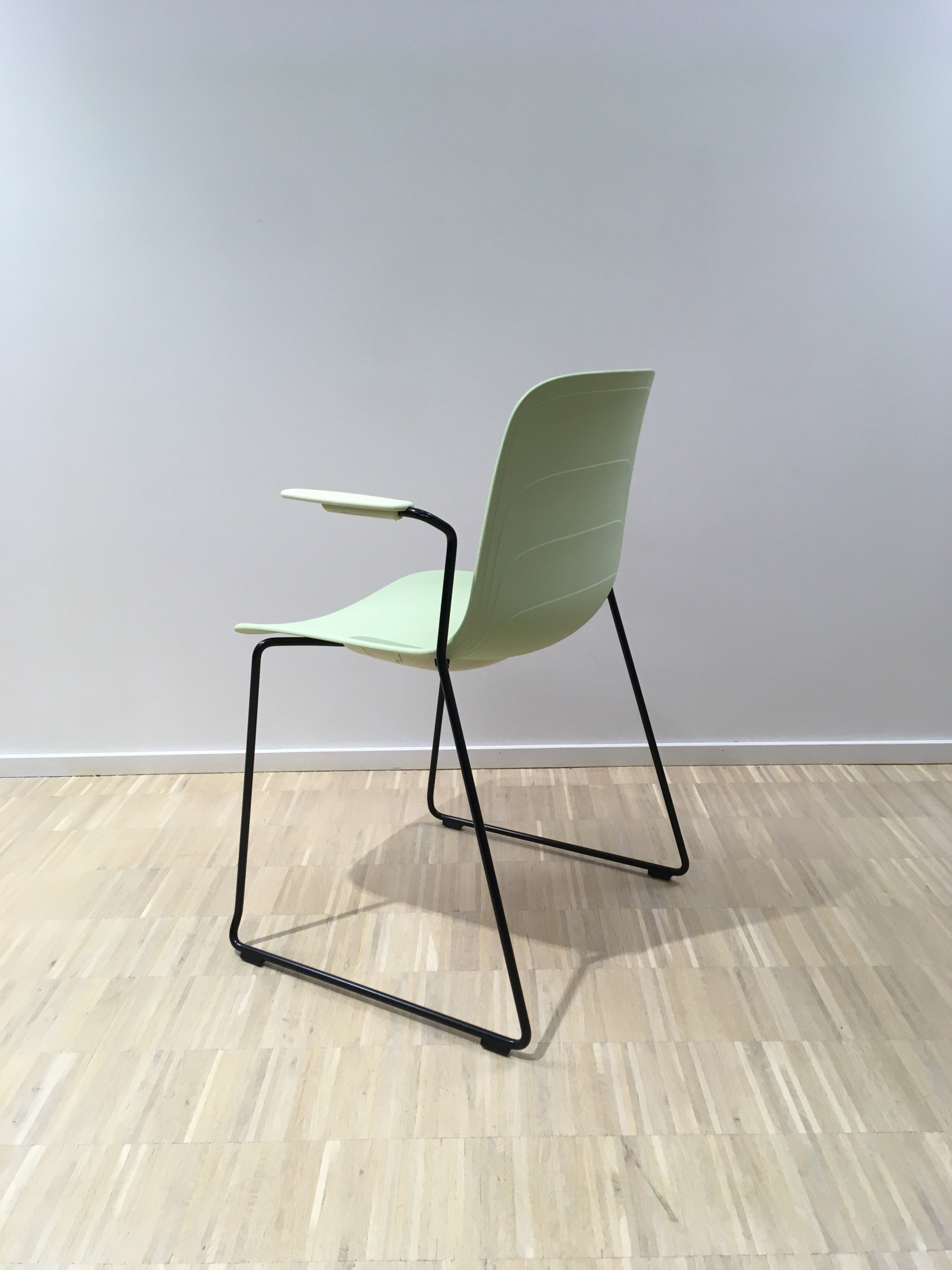 Sæde og ryg i plast (grøn). Medestel i metal (aluminium).
