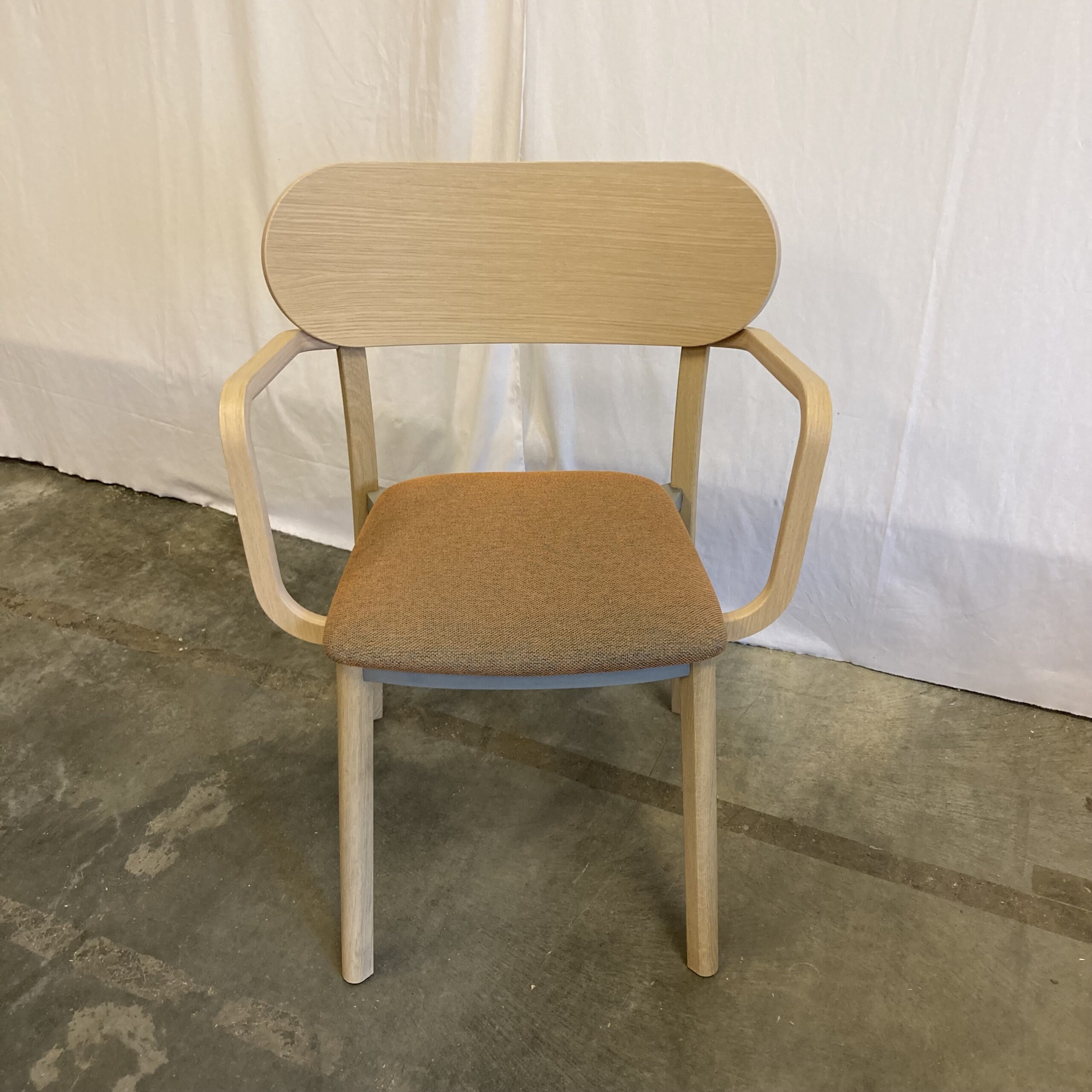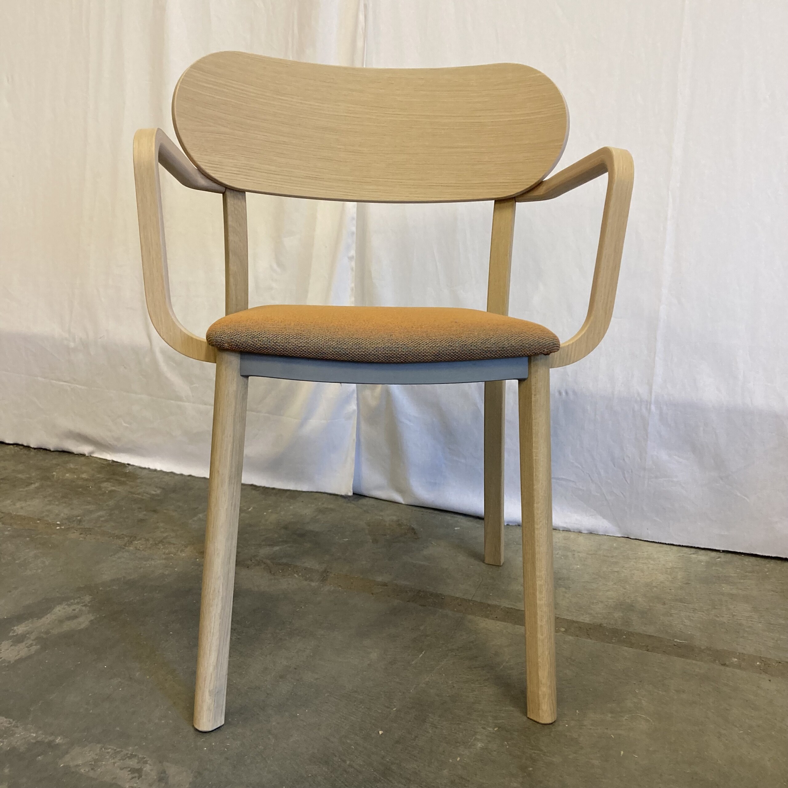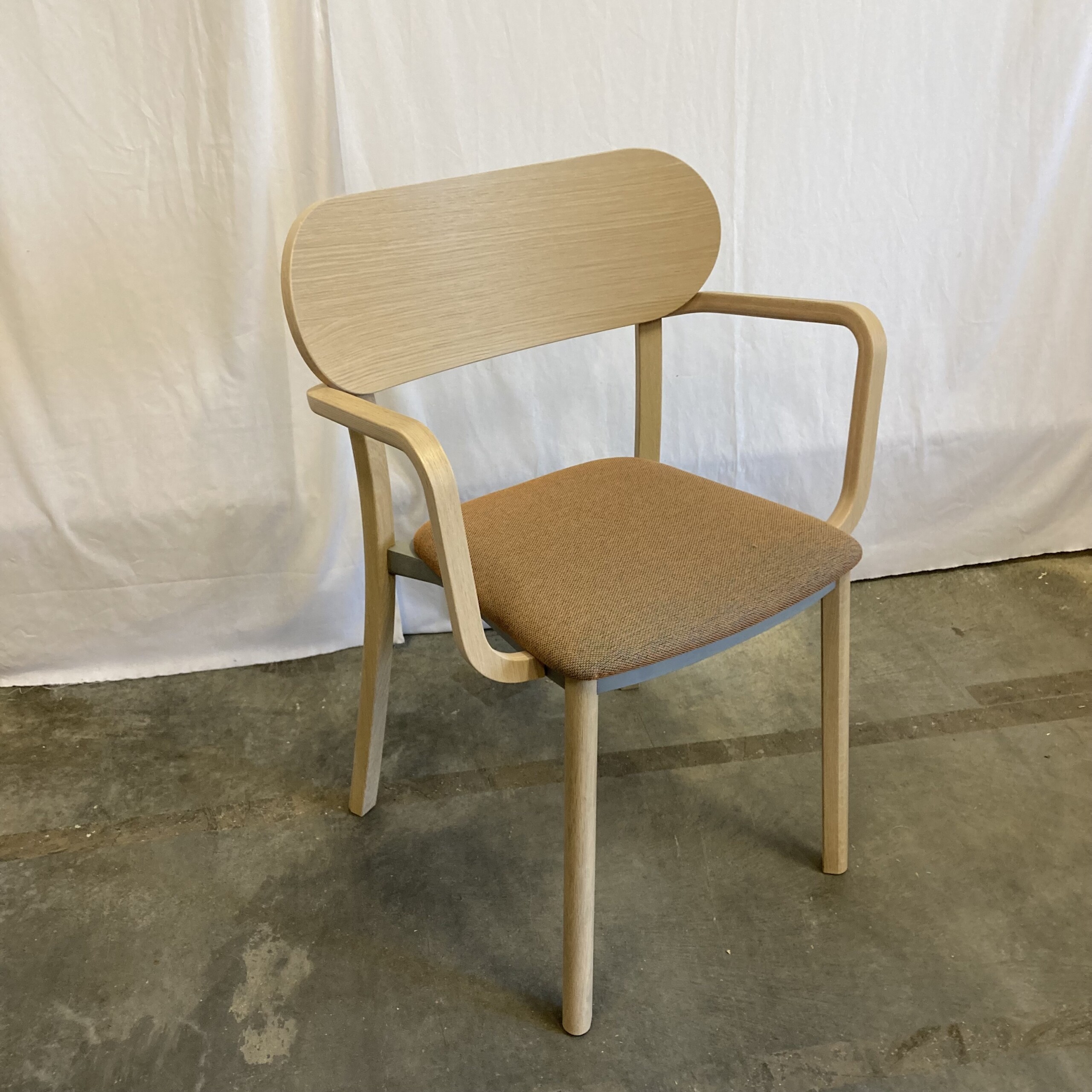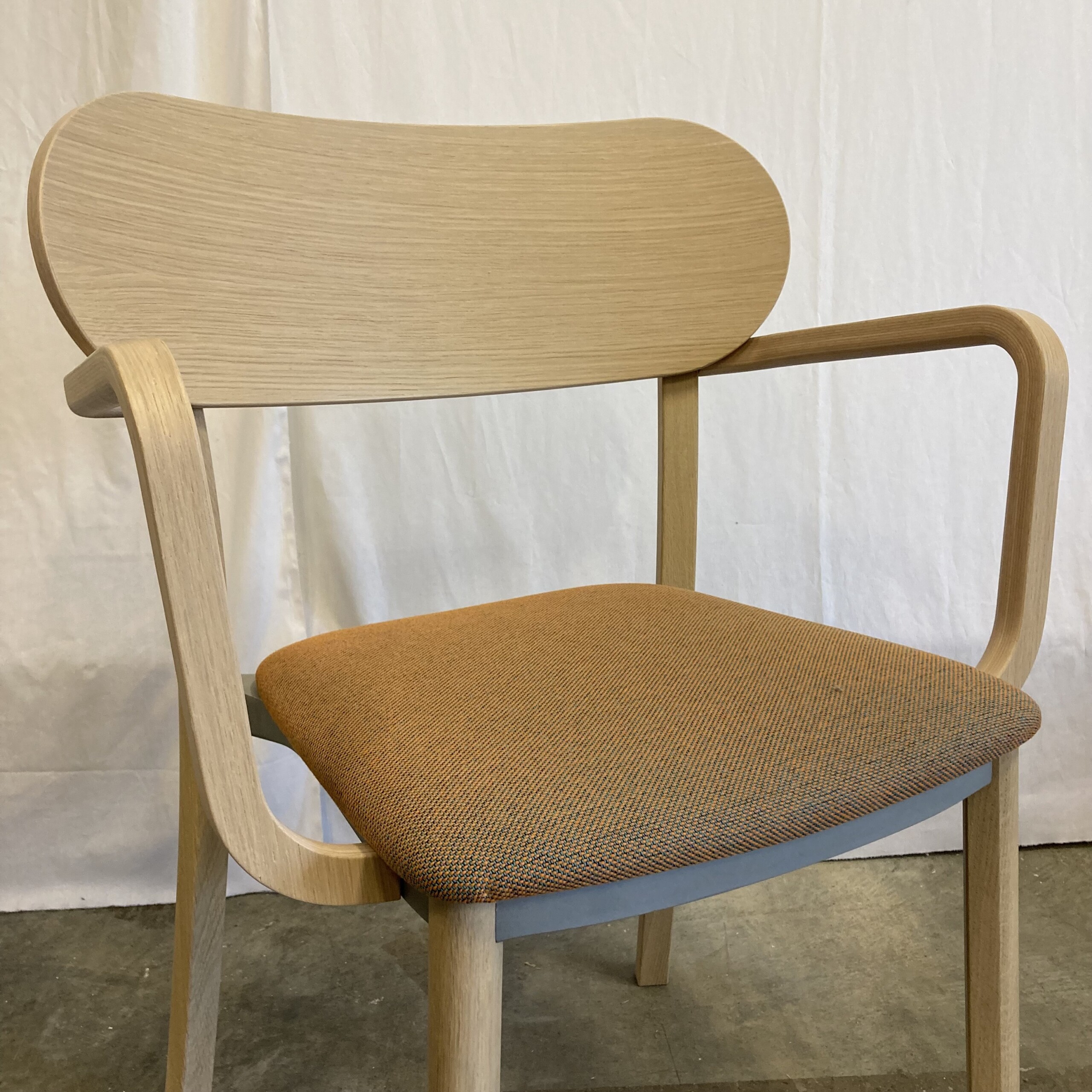 Sæde i stof (orange). Ryg i træ (eg). 4-bensstel i træ (eg).