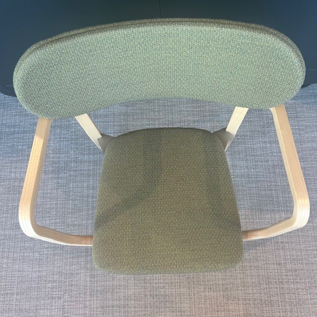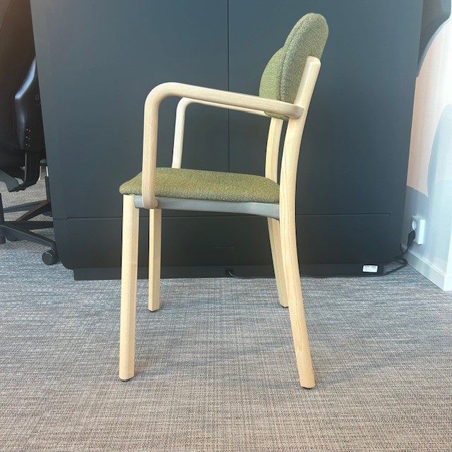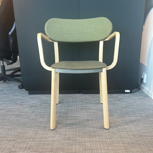 Sæde og ryg i stof (grøn). 4-bensstel i træ (ask).