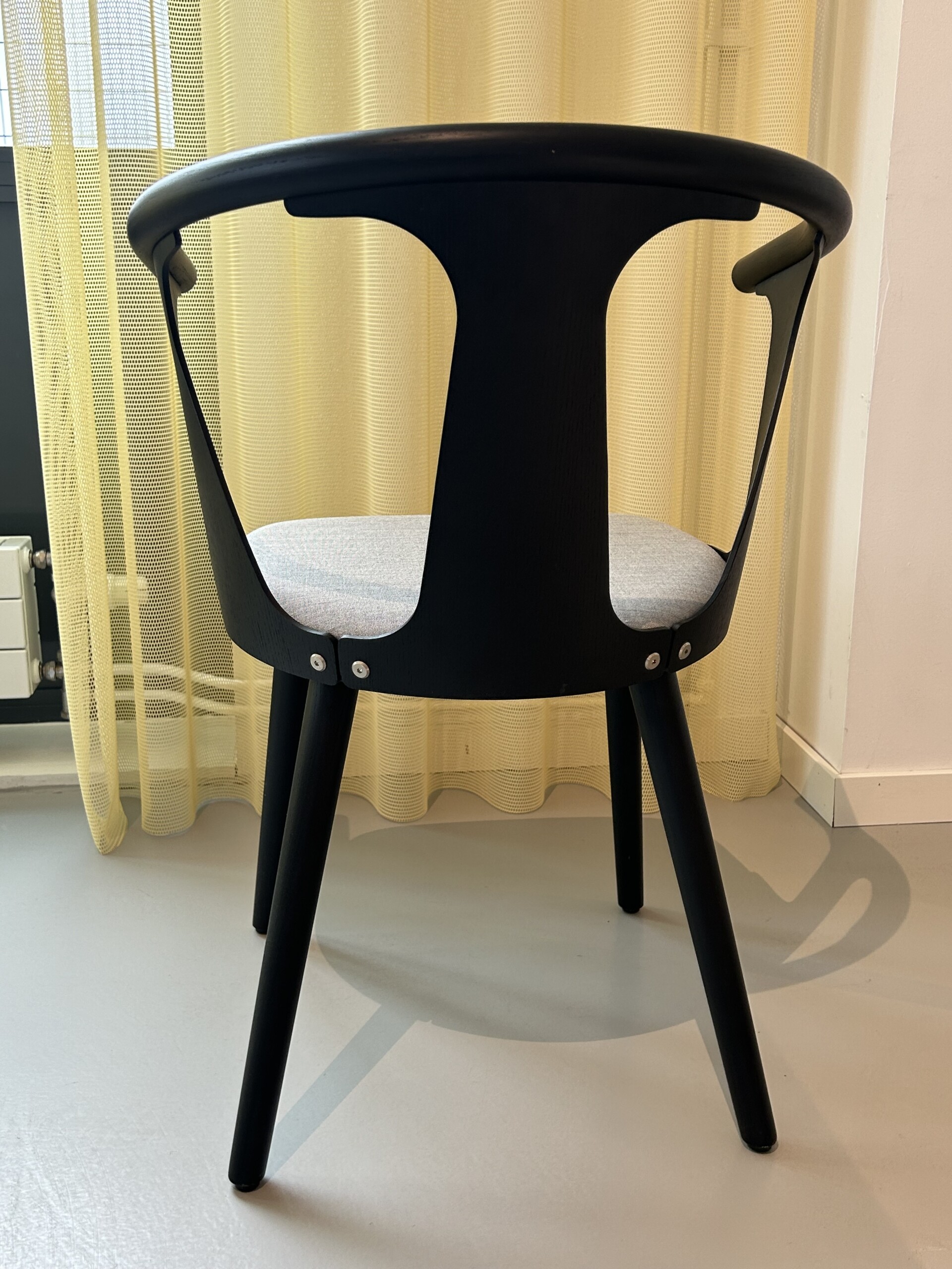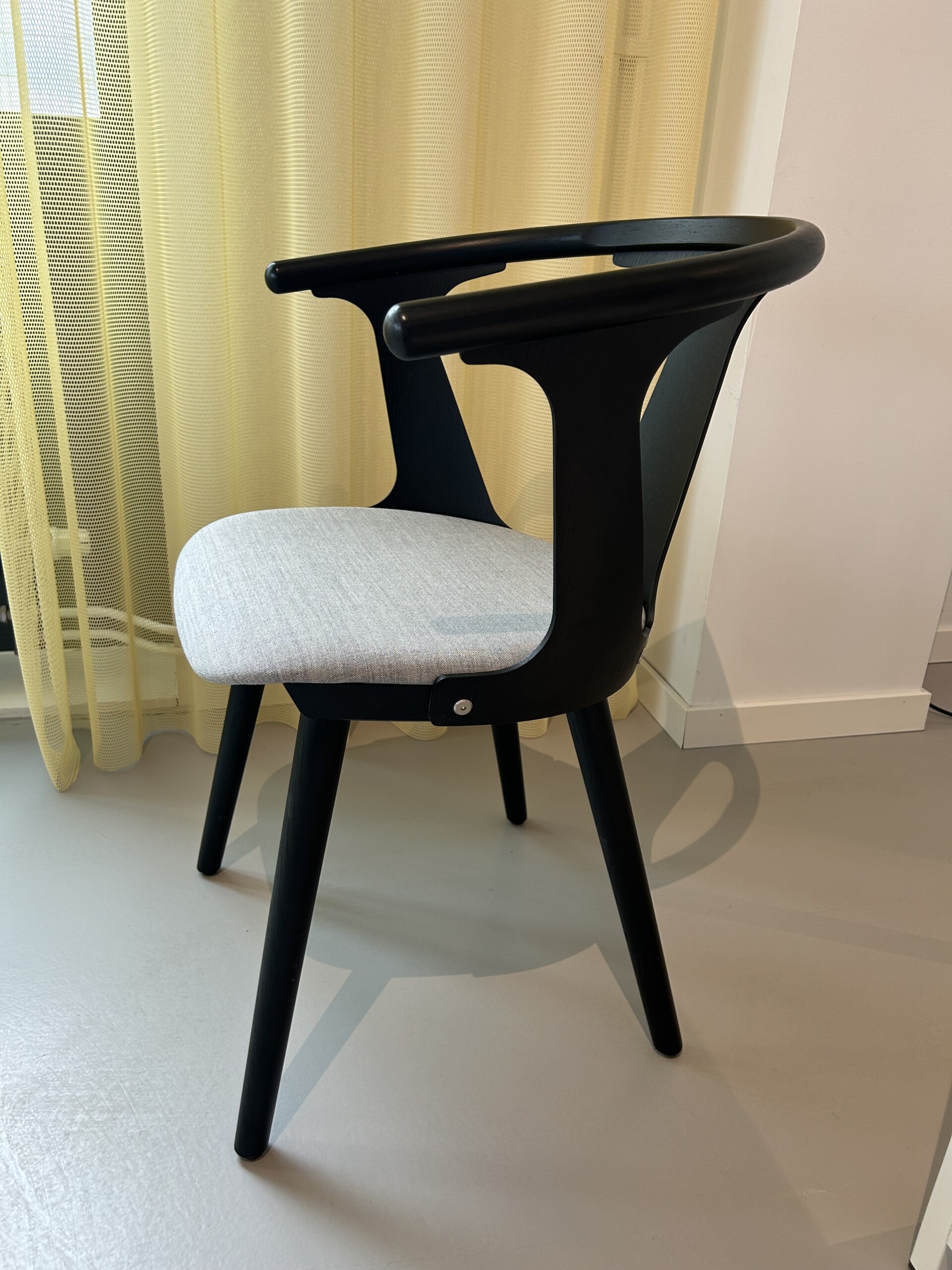 Sæde i stof (grå). Ryg i træ (sort). 4-bensstel i træ (sort).