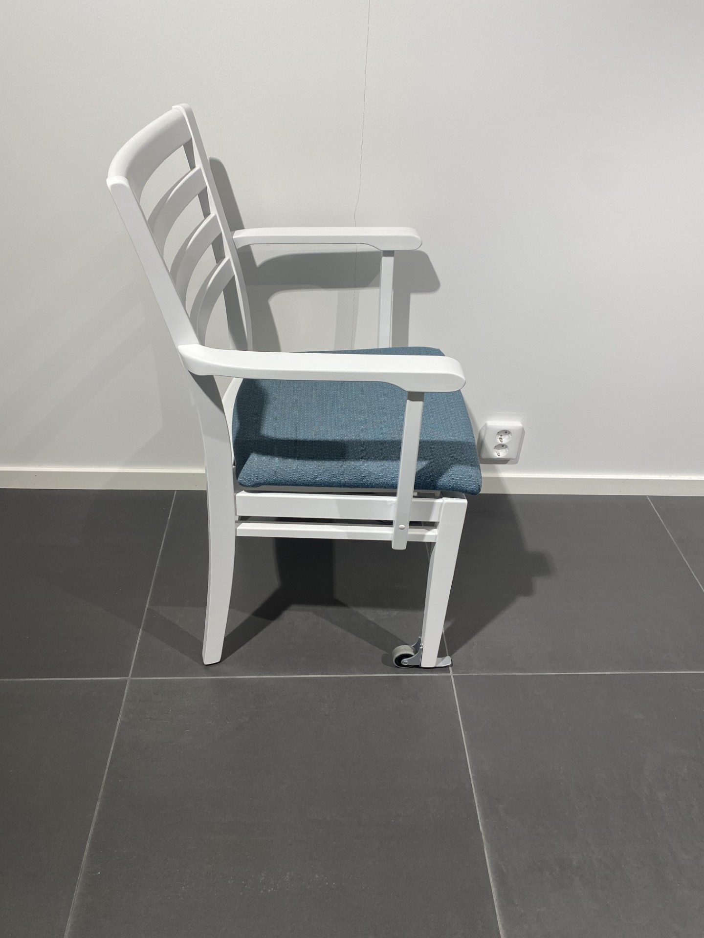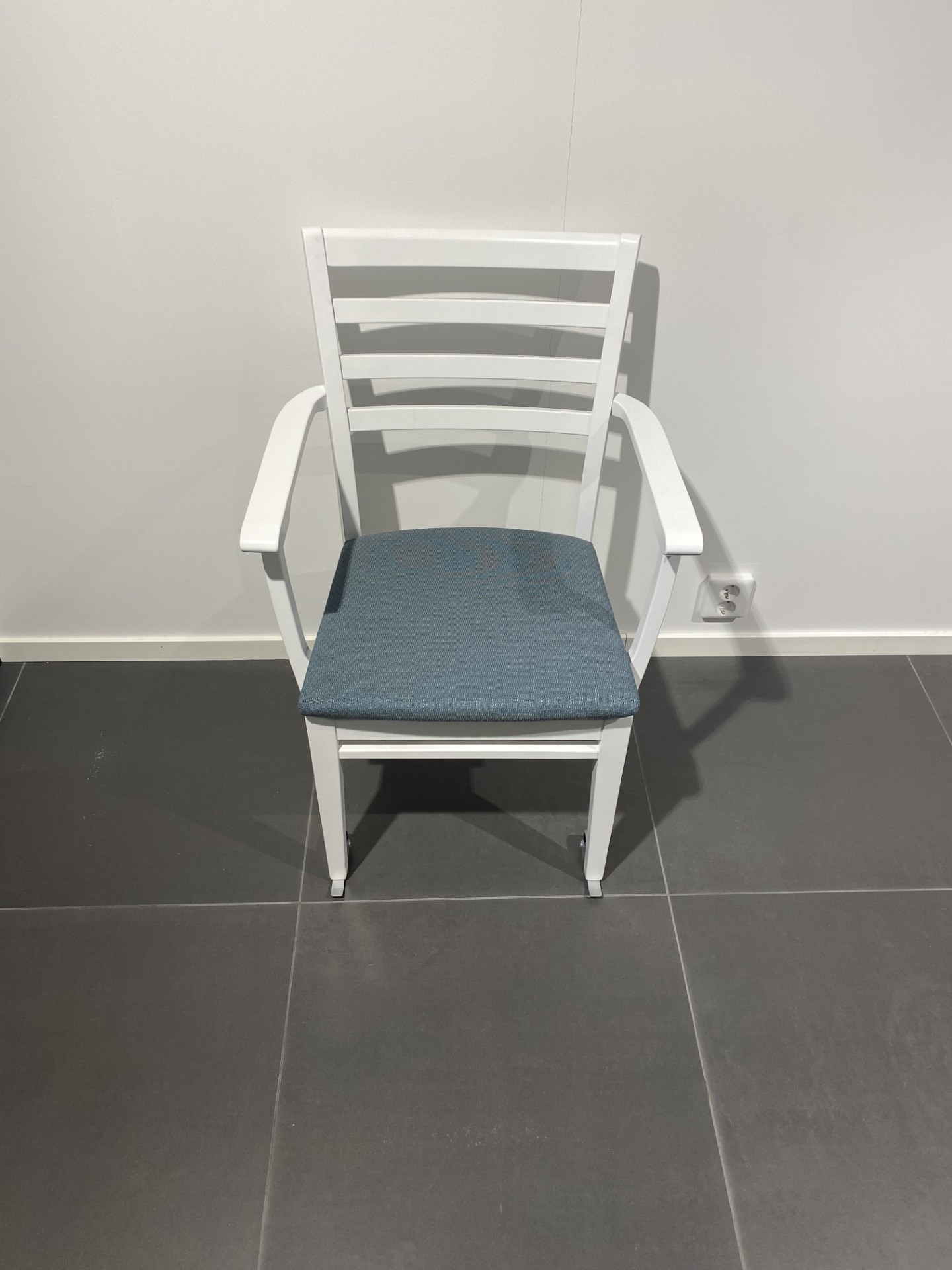 Sæde i stof (blå). Ryg i træ (hvid). 4-bensstel i træ (hvid).