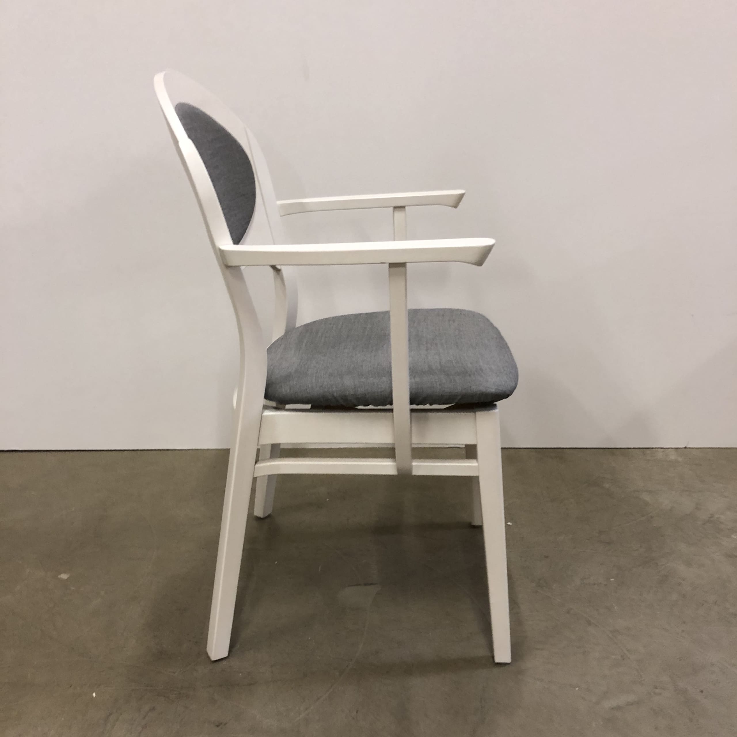 Sæde og ryg i stof (grå). 4-bensstel i træ (hvid).