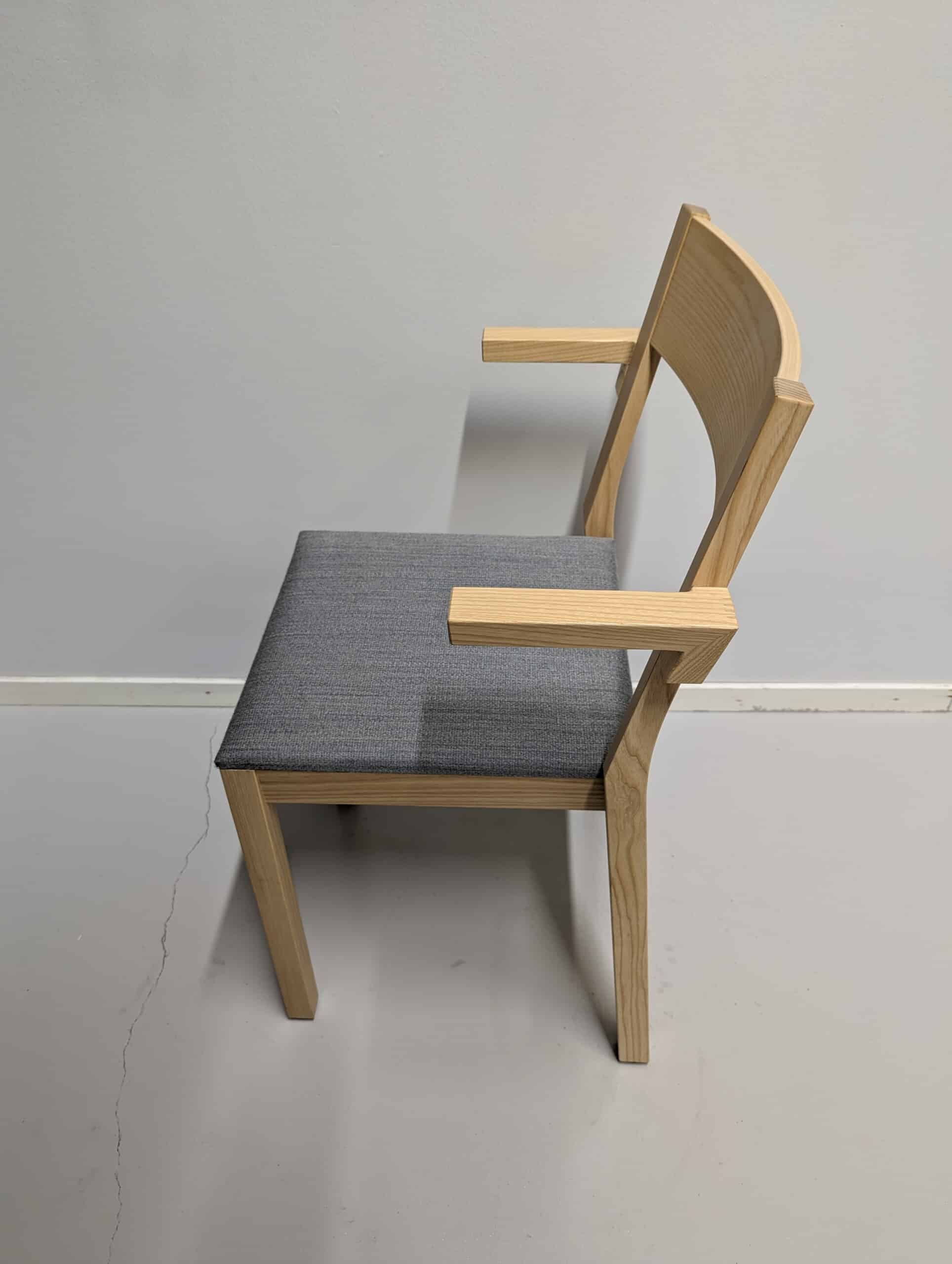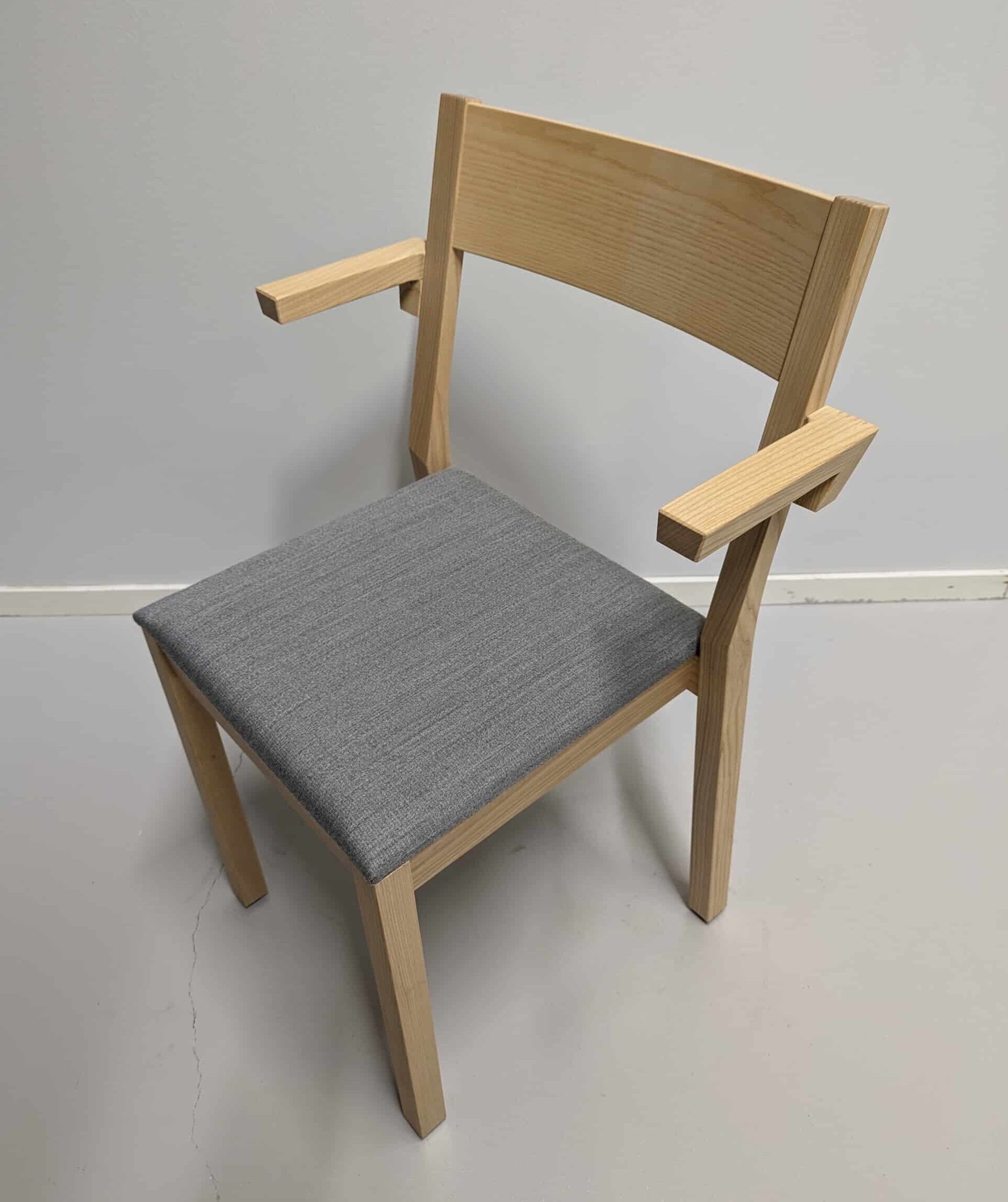 Sæde i stof (grå). Ryg i træ (ask). 4-bensstel i træ (ask).