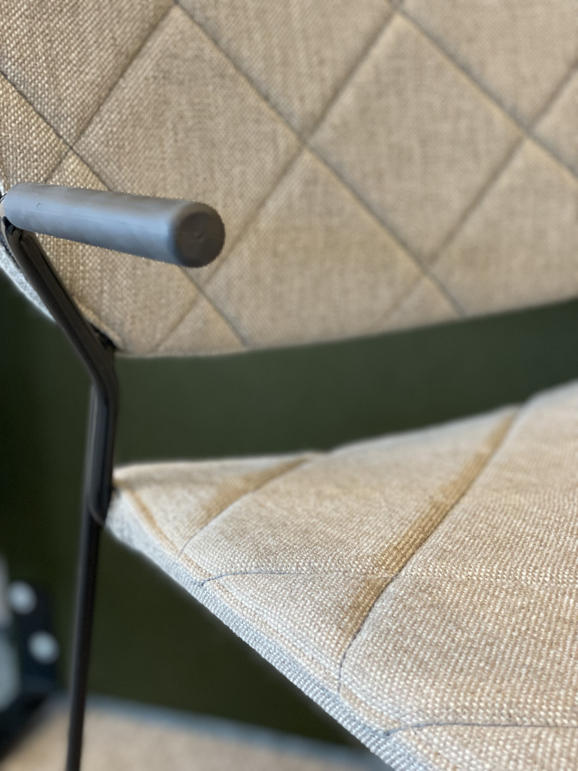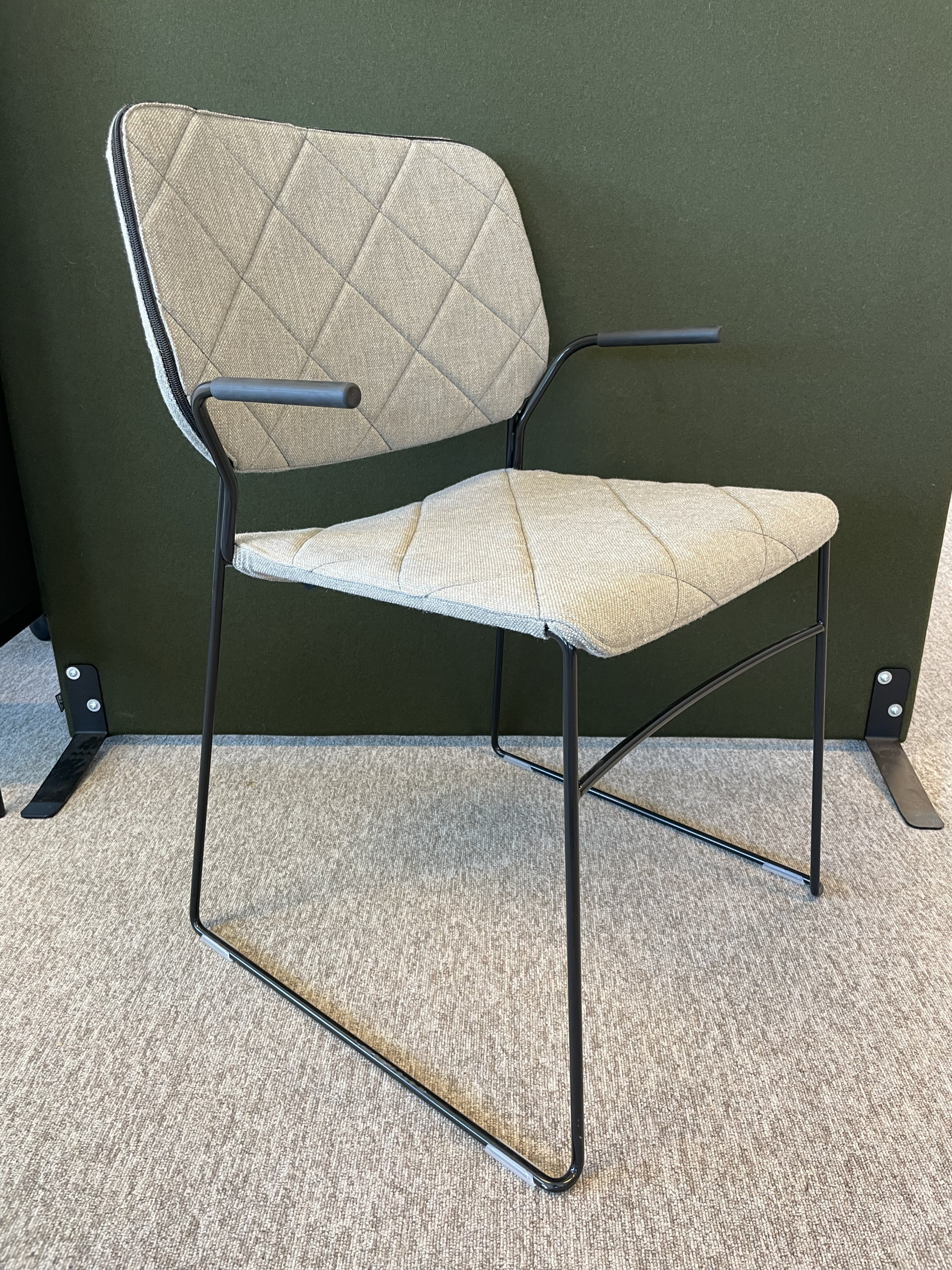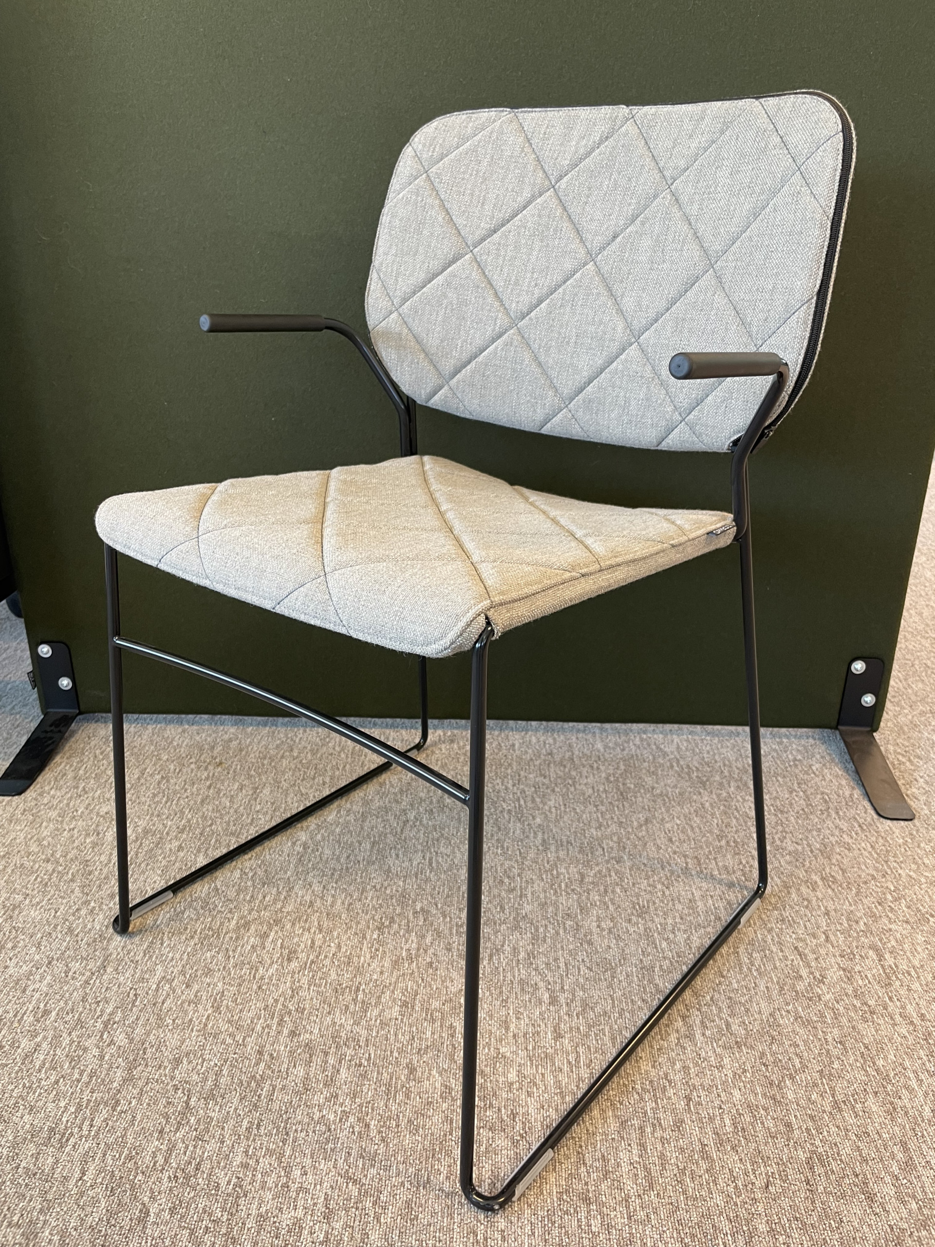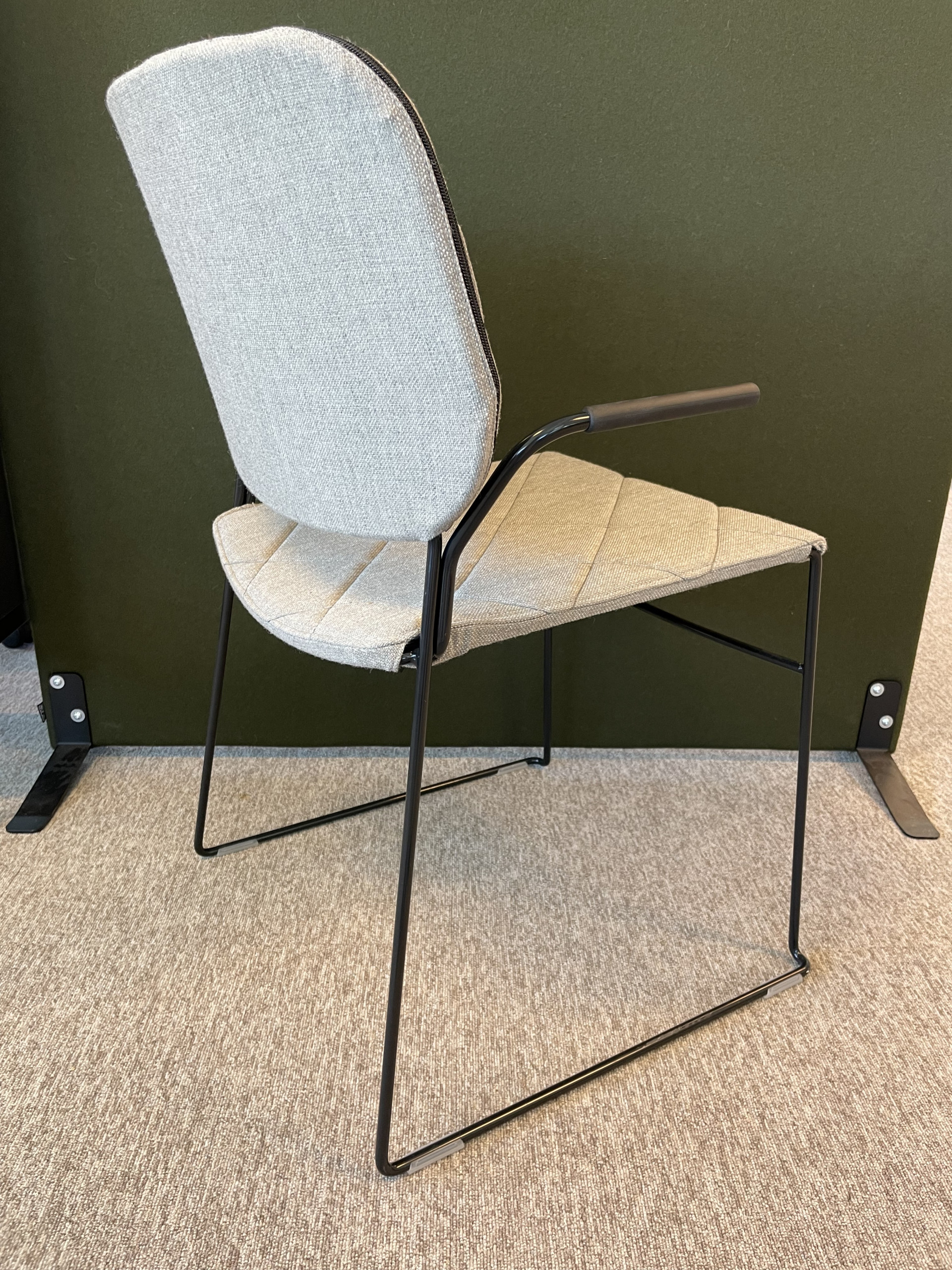 Sæde og ryg i stof (grå). Medestel i metal (sort).