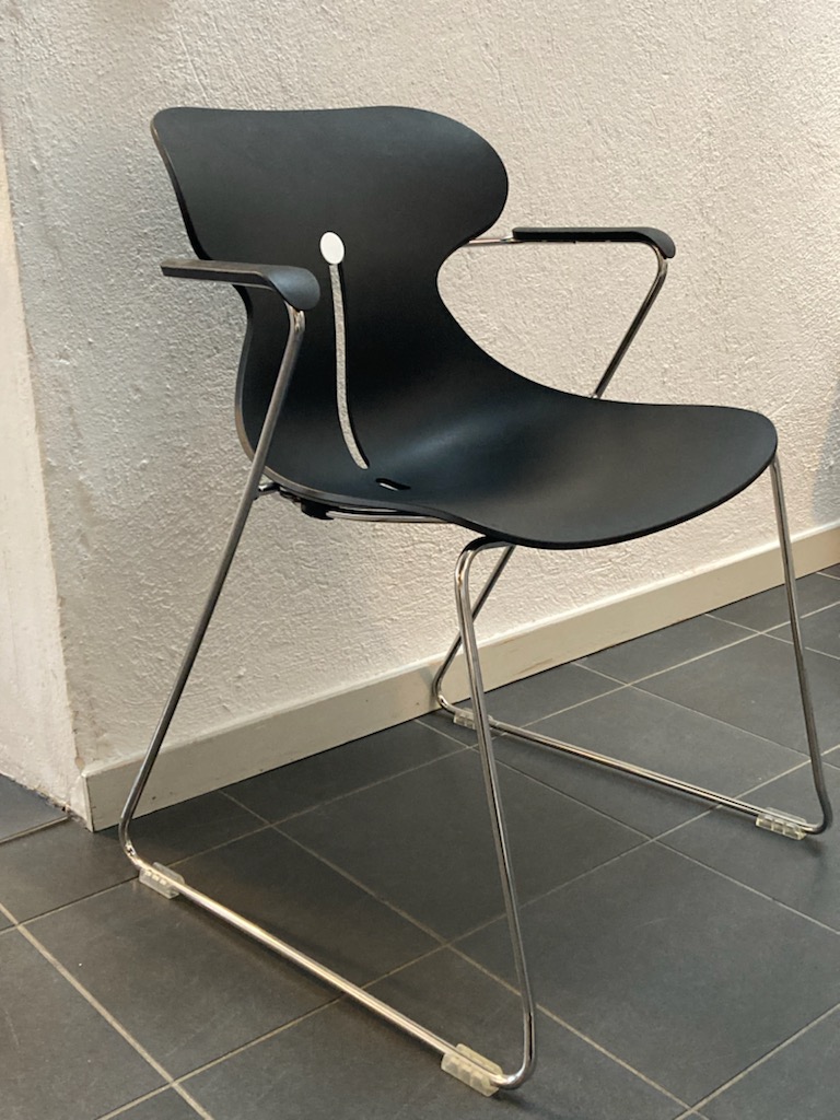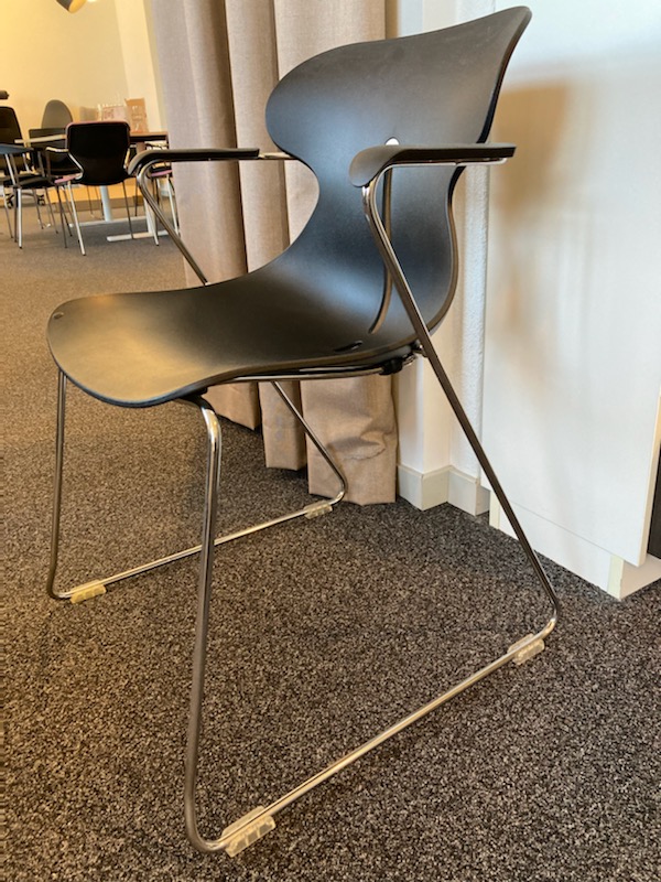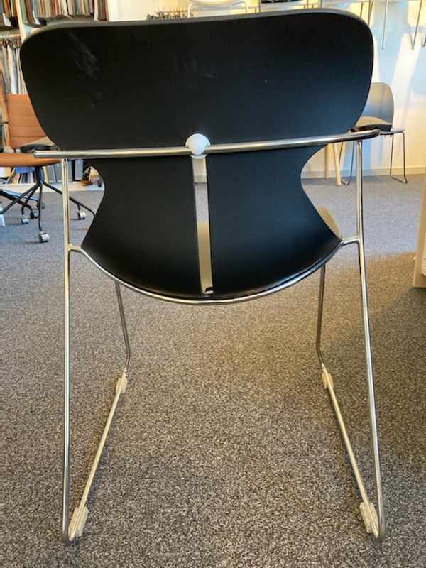 Sæde og ryg i plast (sort). Medestel i metal (aluminium).