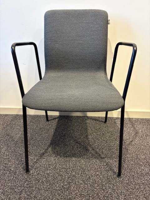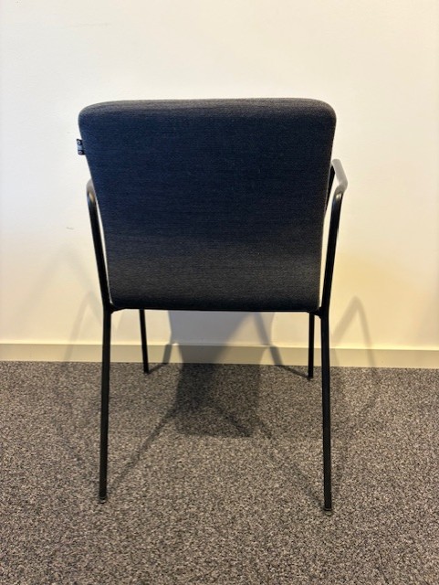 Sæde og ryg i stof (grå). 4-bensstel i metal (sort).