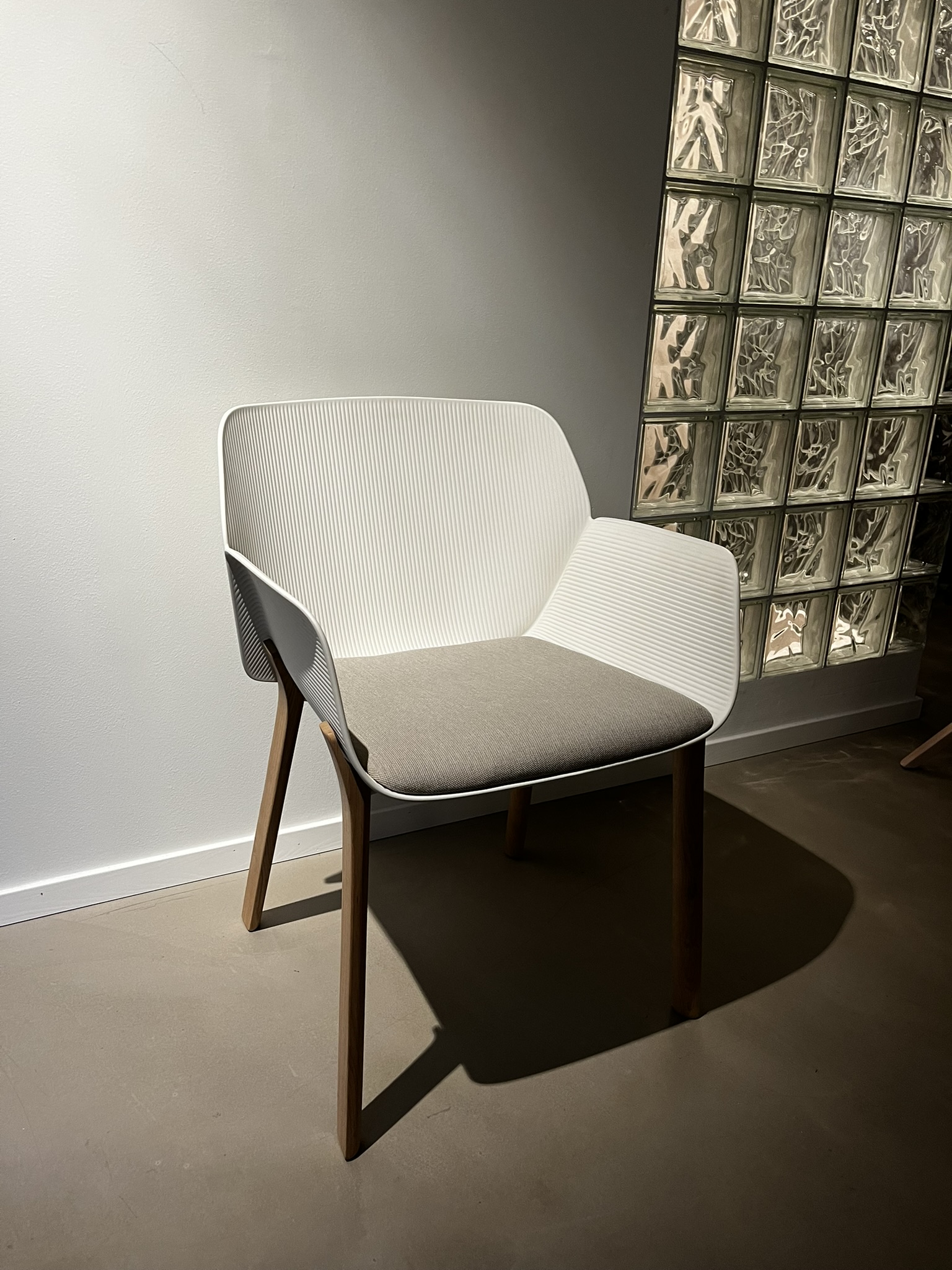 Sæde i stof (grå). Ryg i plast (hvid). 4-bensstel i træ.