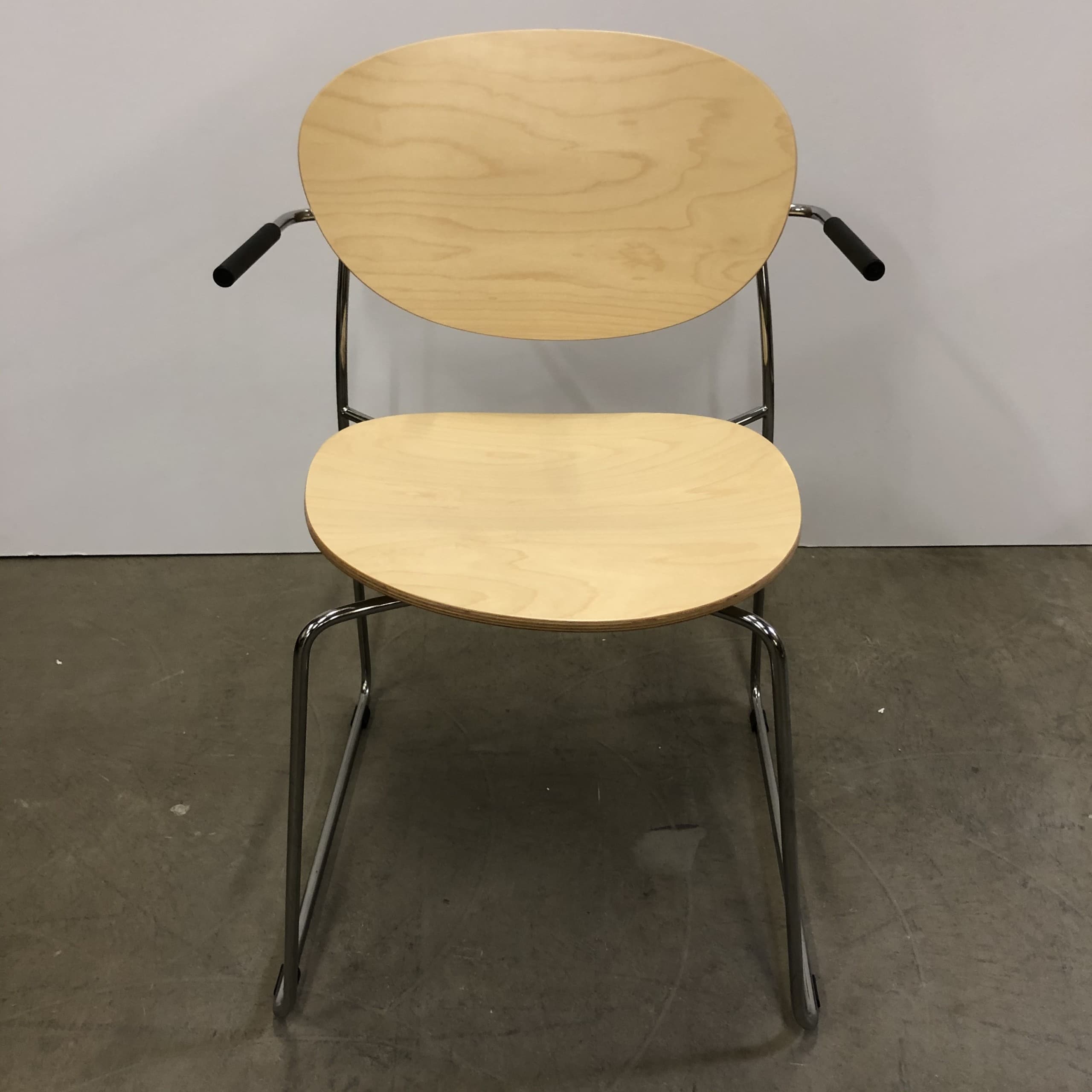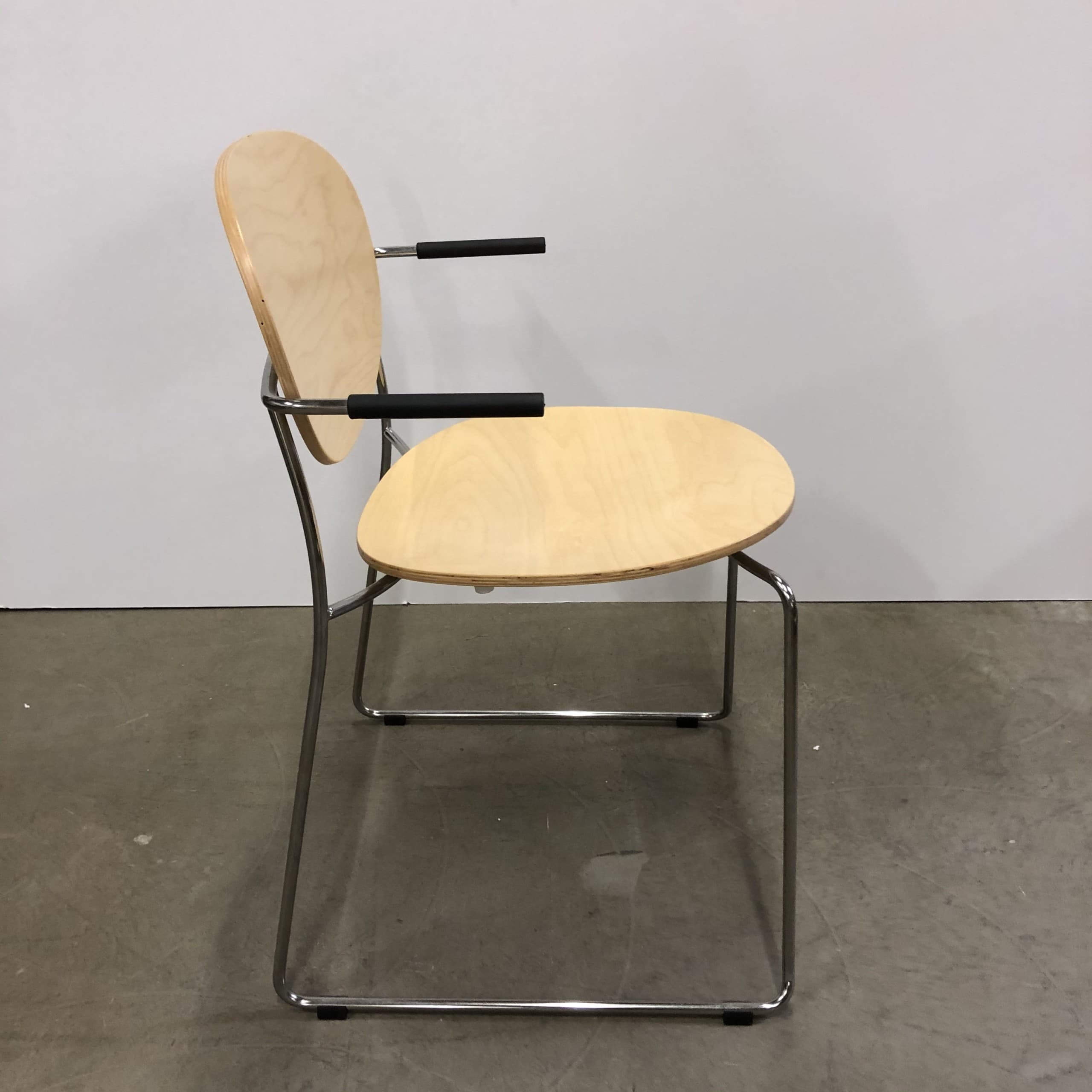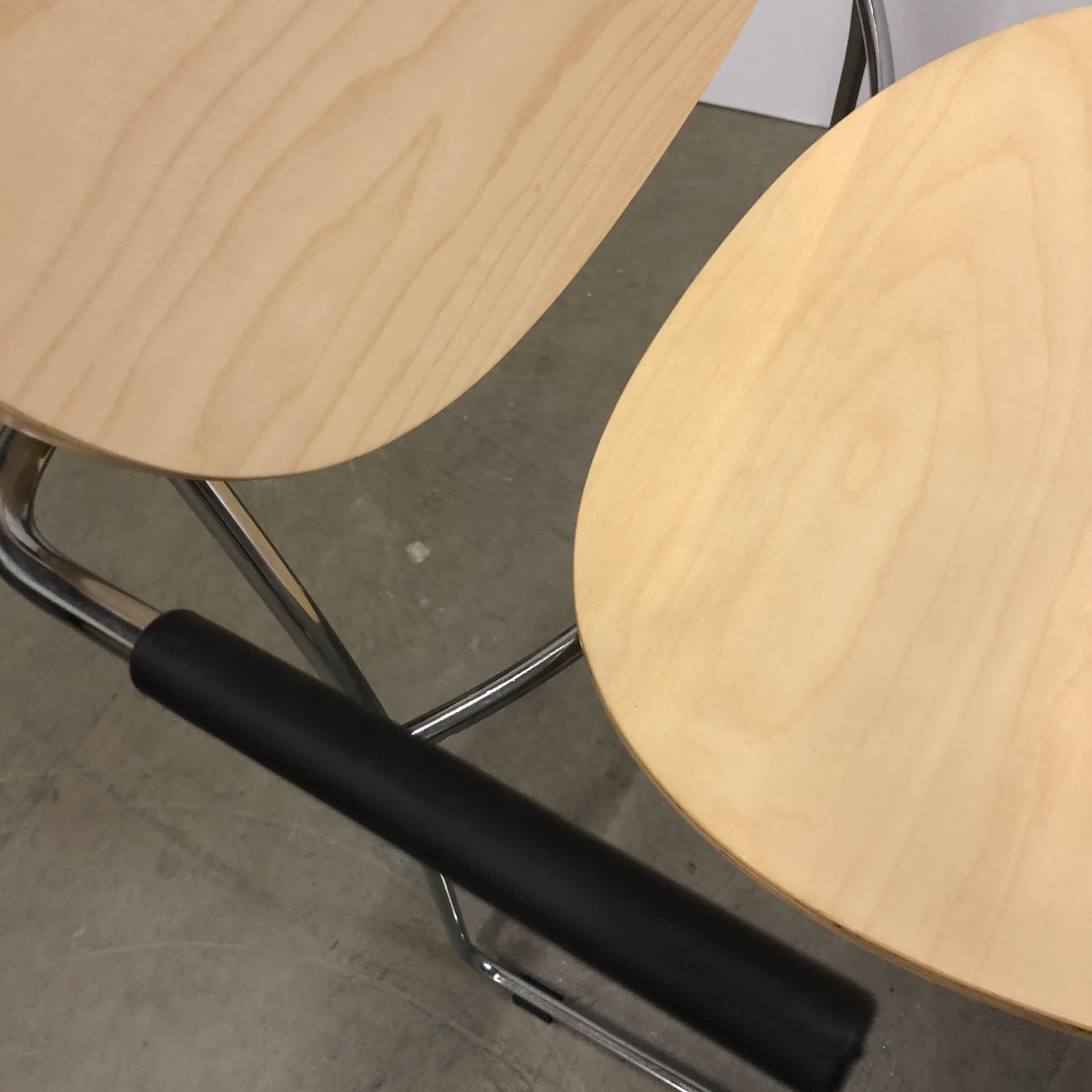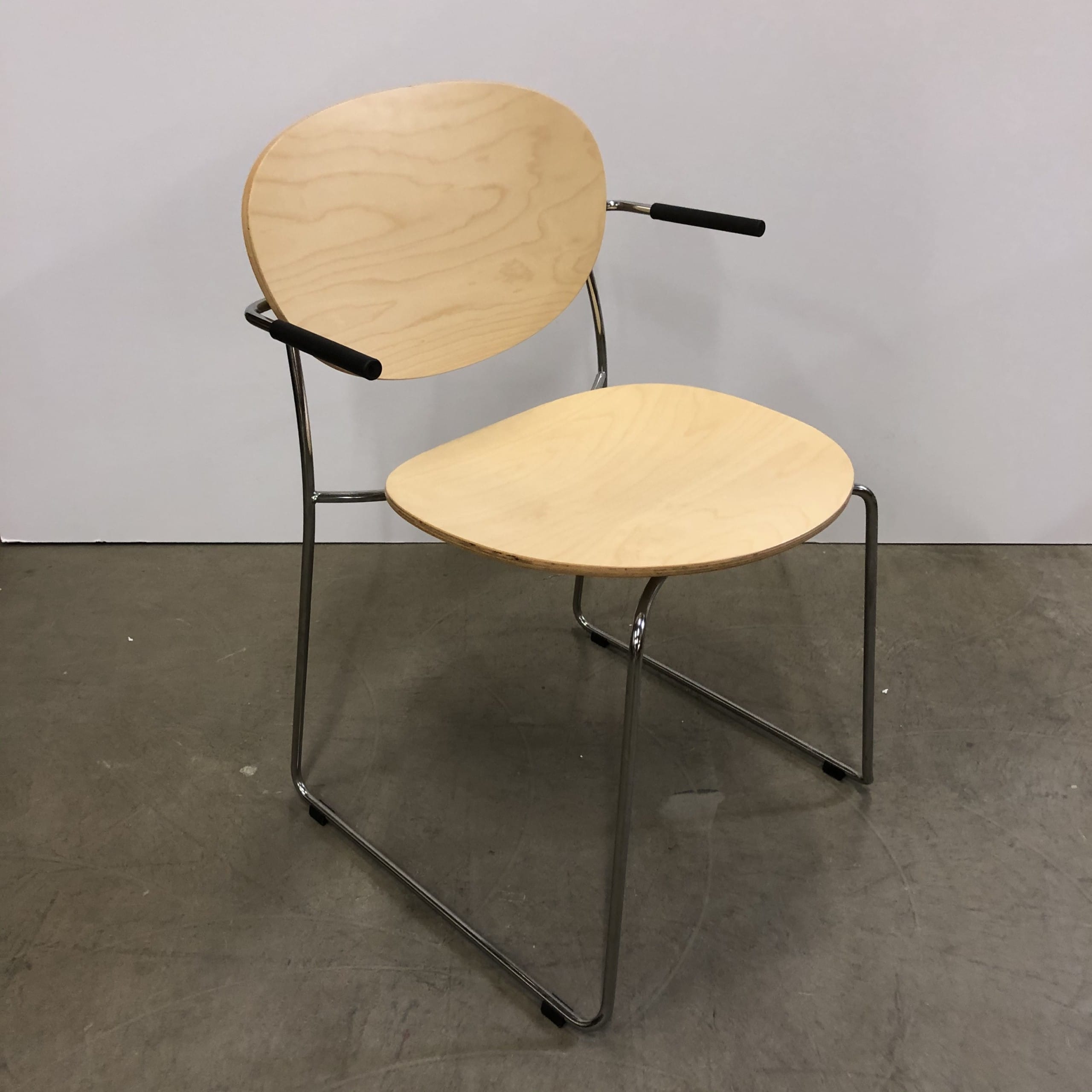 Sæde og ryg i træ (birk). Medestel i metal (krom).