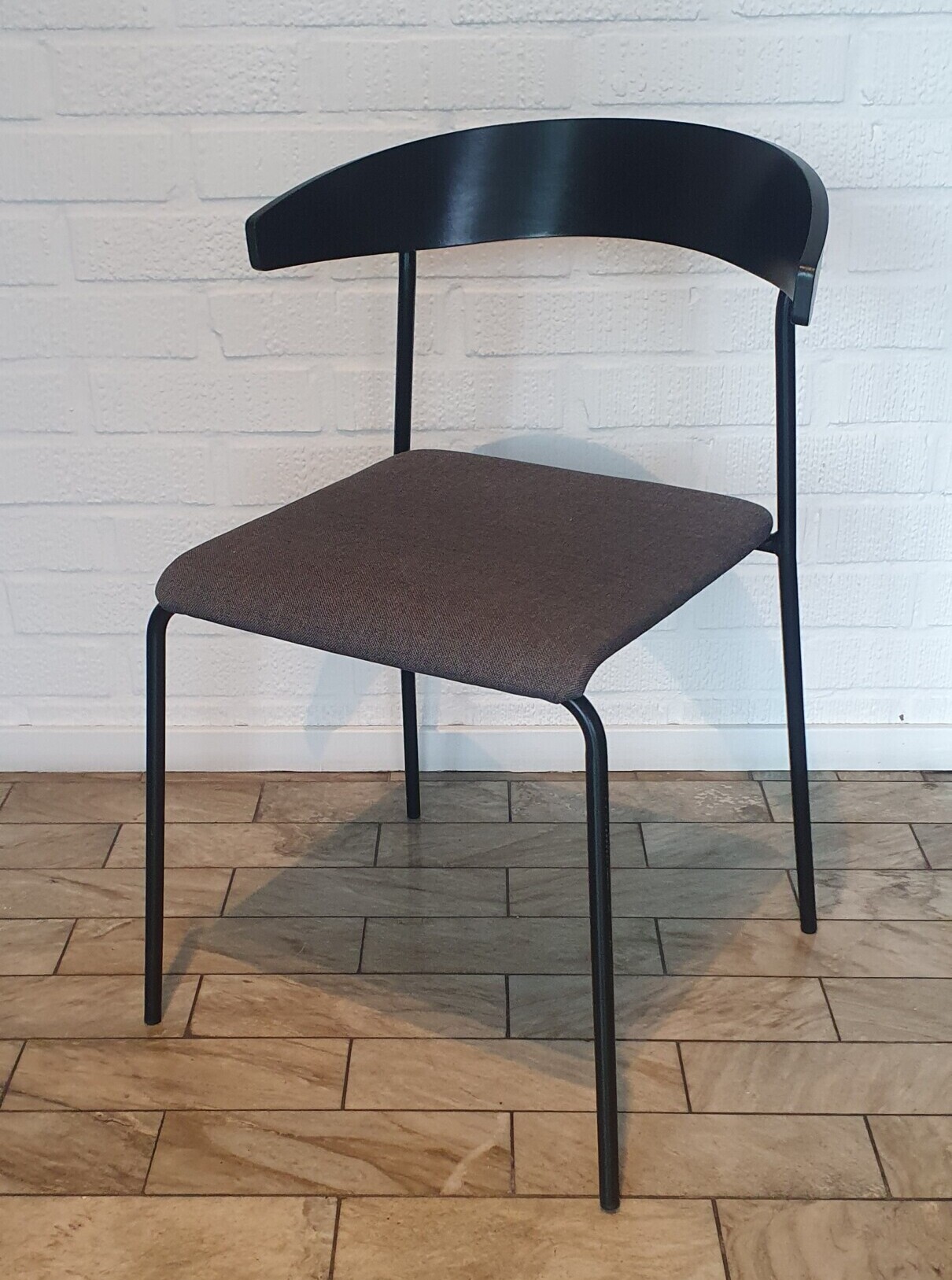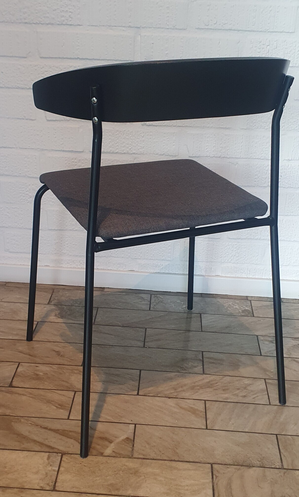 Sæde i stof (grå). Ryg i træ (sort). 4-bensstel i metal (sort).