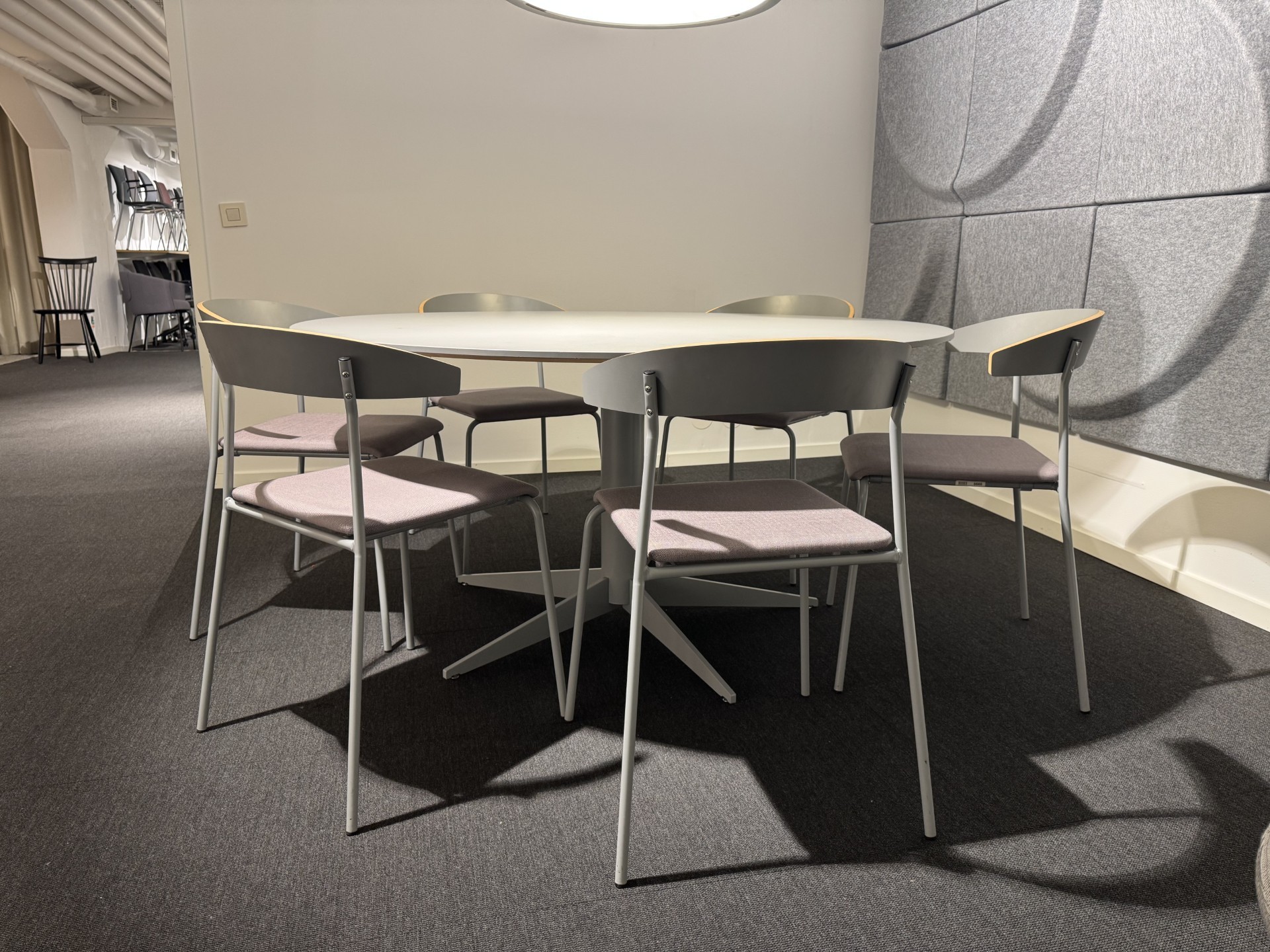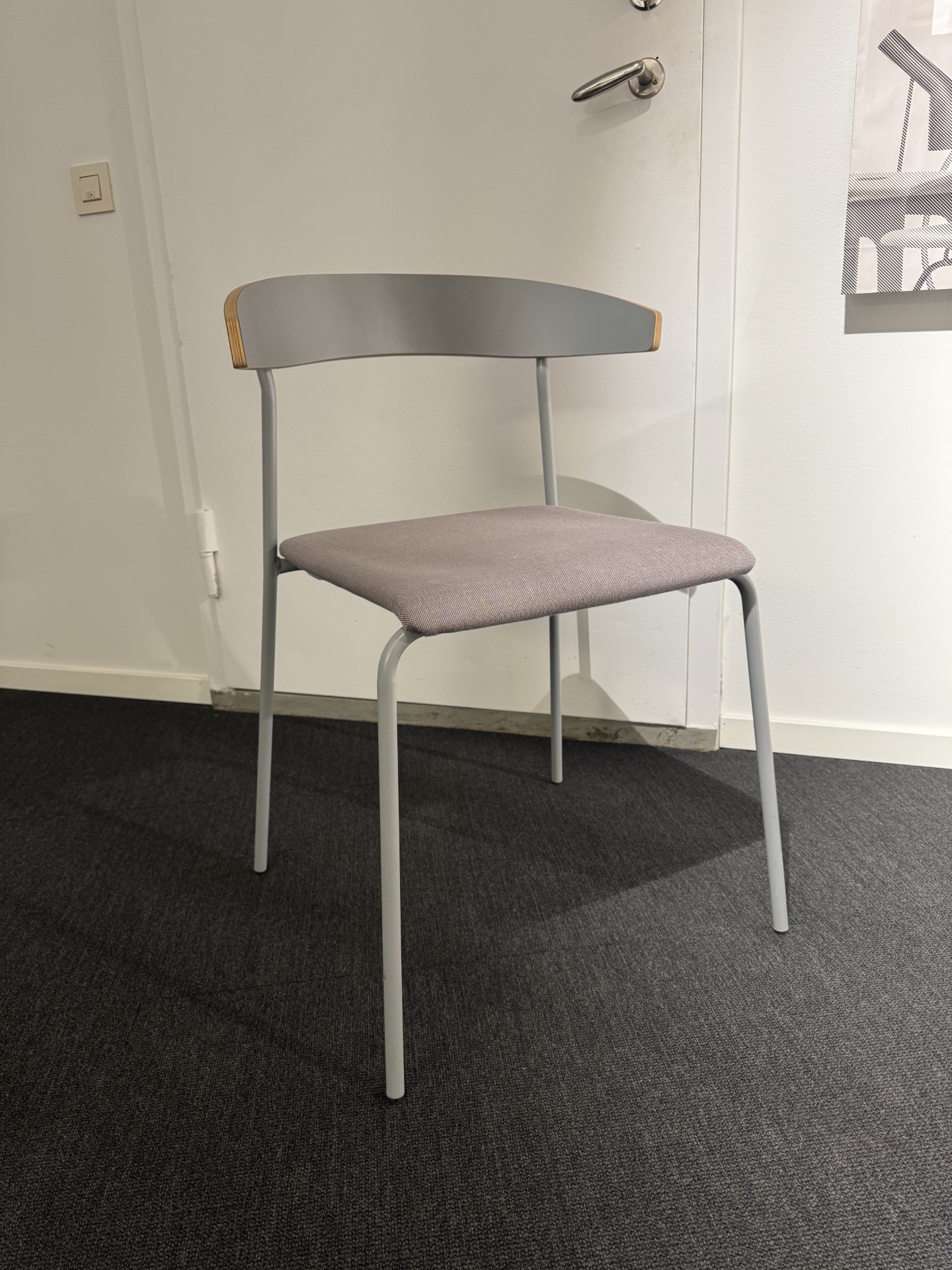 Sæde i stof (grå). Ryg i laminat (grå). 4-bensstel i metal (grå).